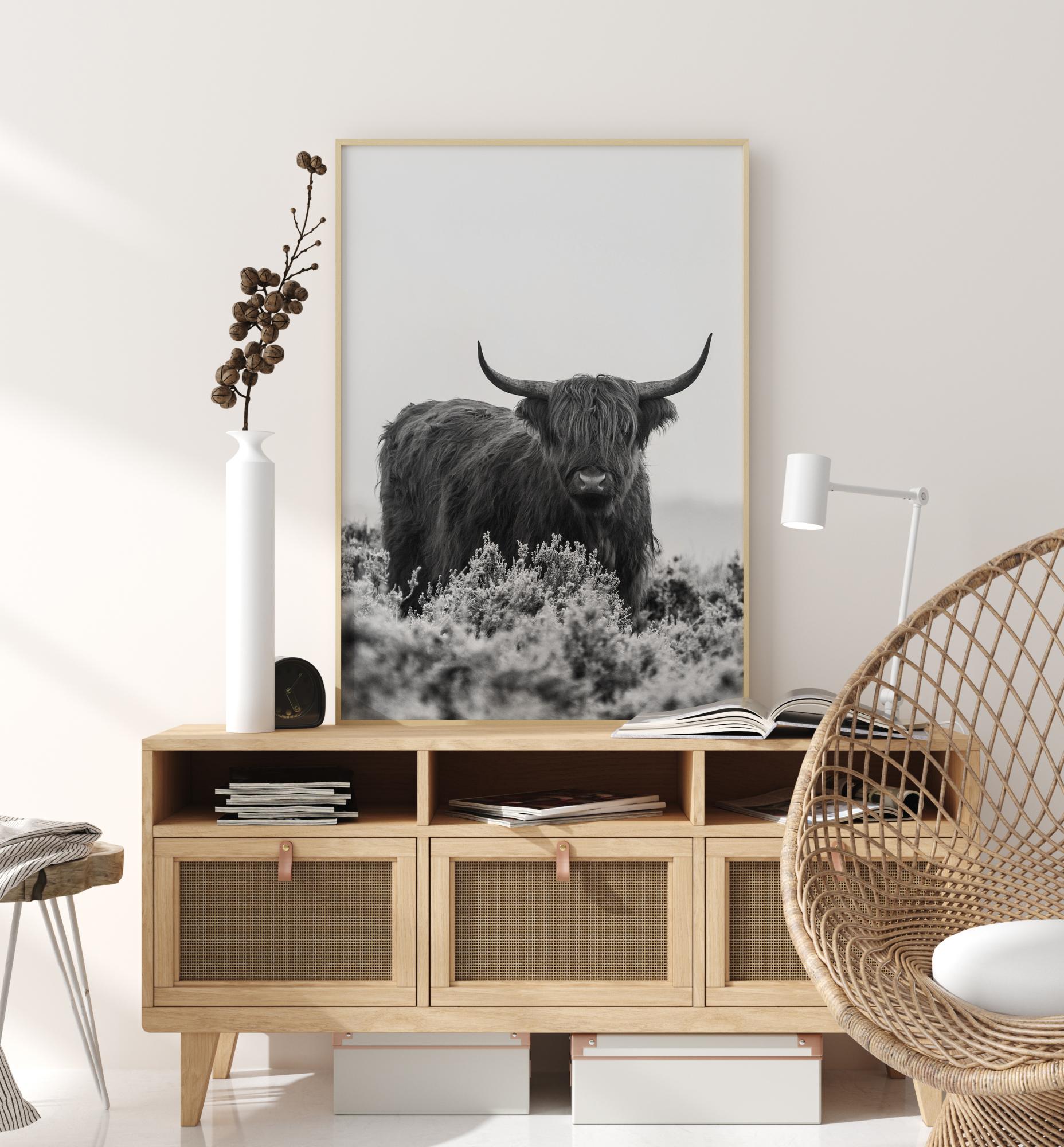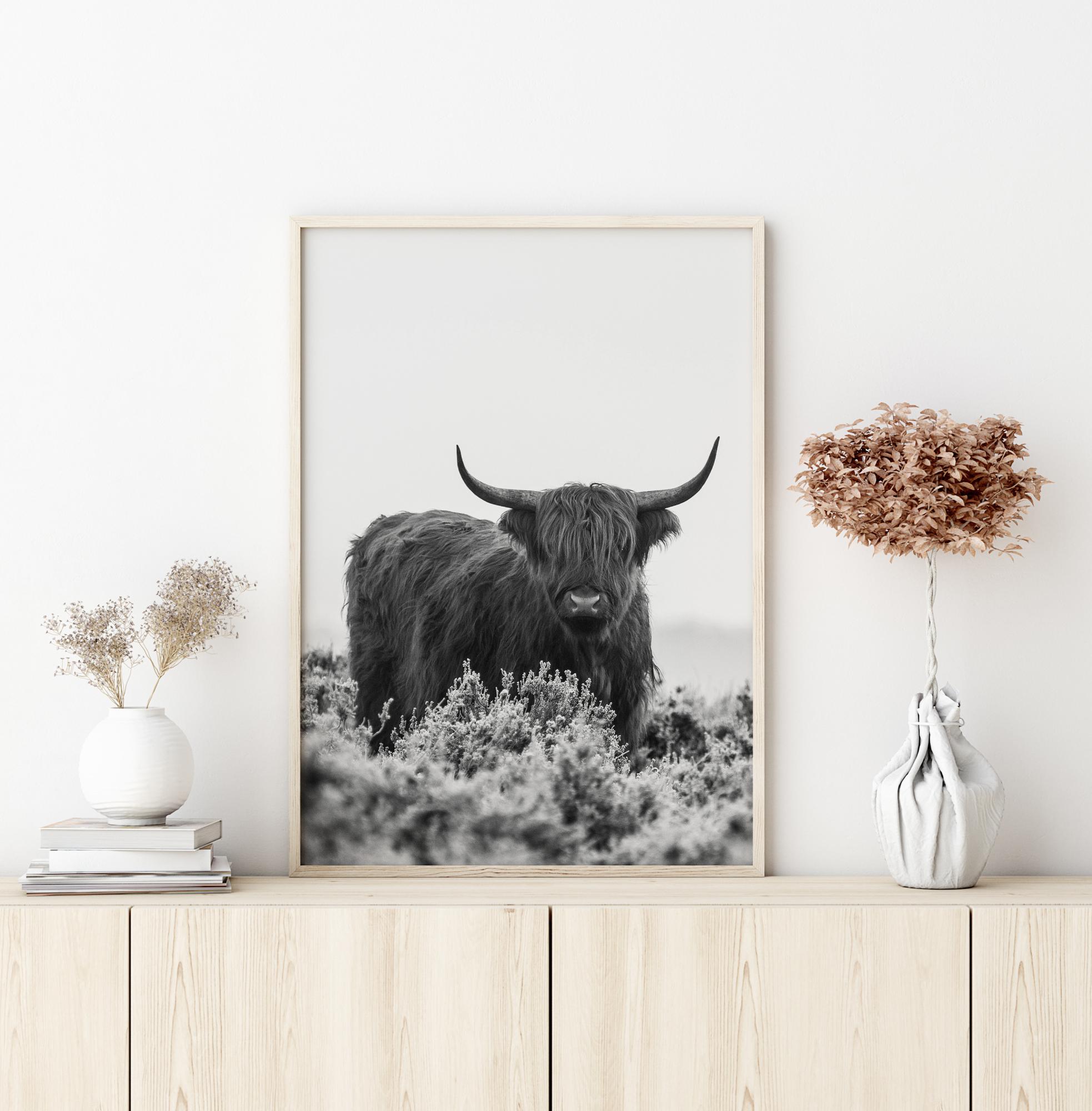Egy gyönyörű állatposzter, amely egyedül egy tehént ábrázol a pusztában. Magas fűvel körülvéve ez a csodálatos állat egyenesen a kamerába néz. Ahogy a szürke ég és magas fű előtt áll, szinte érzed az arcodon a hideg szelet. Tökéletes kép minden állatbarátnak.