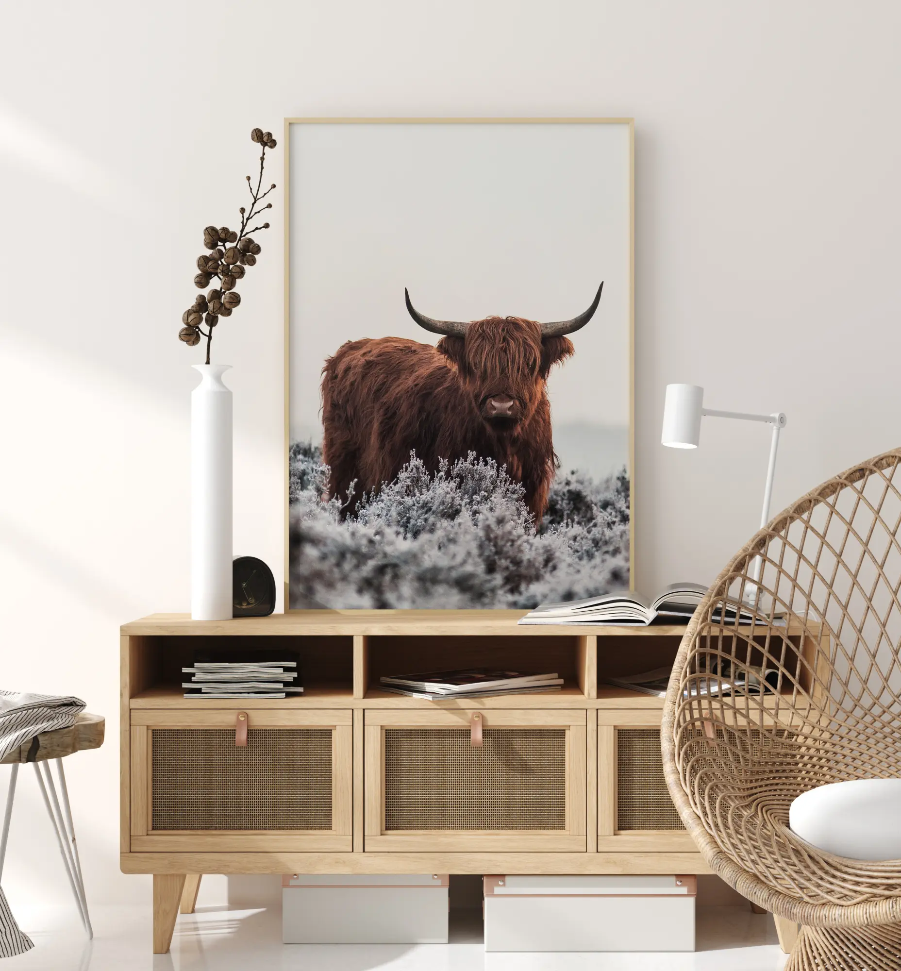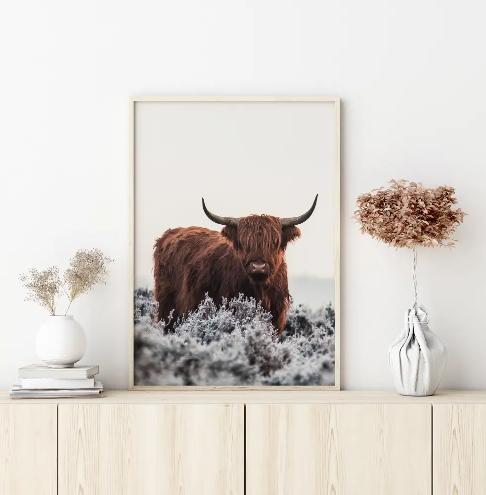 Egy nagyszerű poszter egy vörös skót felföldi tehénnel. Amikor fehér égbolt előtt áll, szinte át lehet élni azokat a kemény időjárási körülményeket, ahol él. Vörös szőrével és barna orrával ez a gyönyörű tehén úgy tűnik, semmi sem zavarja. A pompás szín tökéletesen kontrasztál a fehér környezettel.