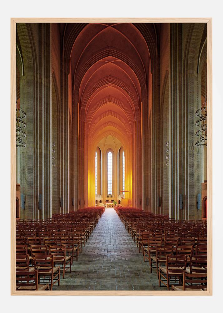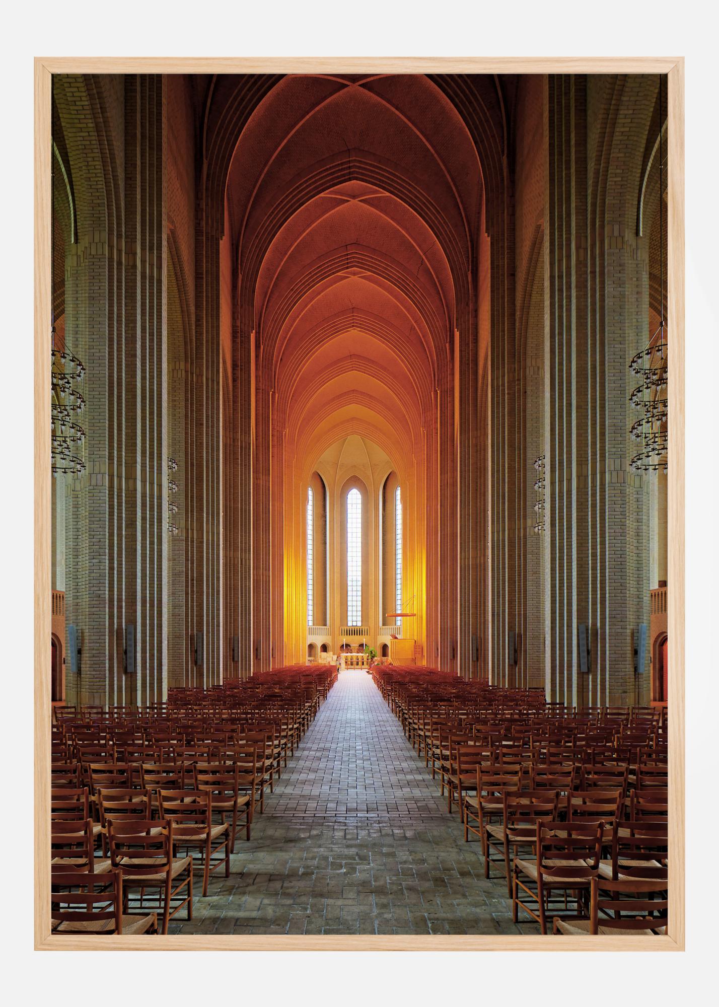 Egy lélegzetelállító építészeti plakát egy templom belsejében. A hosszú templomhajó az oltárig vezet, és a magas mennyezet valamint a kőoszlopok nagyon békés érzetet keltenek. Narancsszínű fény verődik vissza az ablakokon át, és melegséget és harmóniát teremt. Éld át a nyugalmat ezen a képen.