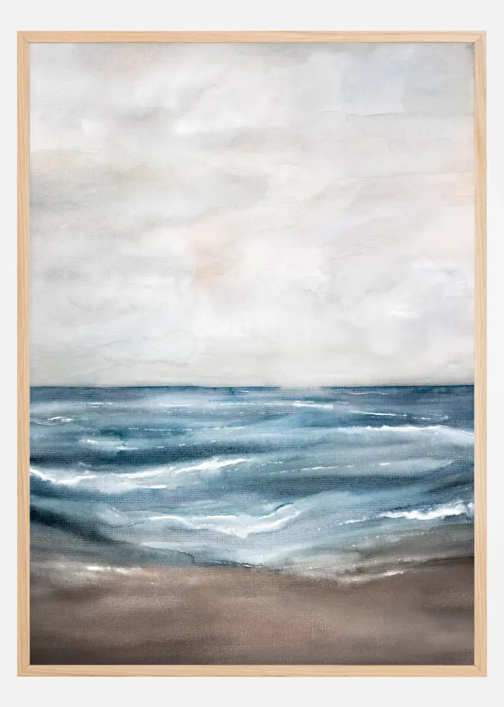 Egy csodálatos akvarellfestmény egy viharos tengerről és egy világosszürke égboltról. Egy nosztalgikus, mégis hatásos festmény, amely kiemeli a tenger erejét és hatalmát. Az előtérben lévő barna tenger extra színt ad a viharos légkör megteremtéséhez. Érezze a tengeri szellőt ezzel a képpel a falon.
