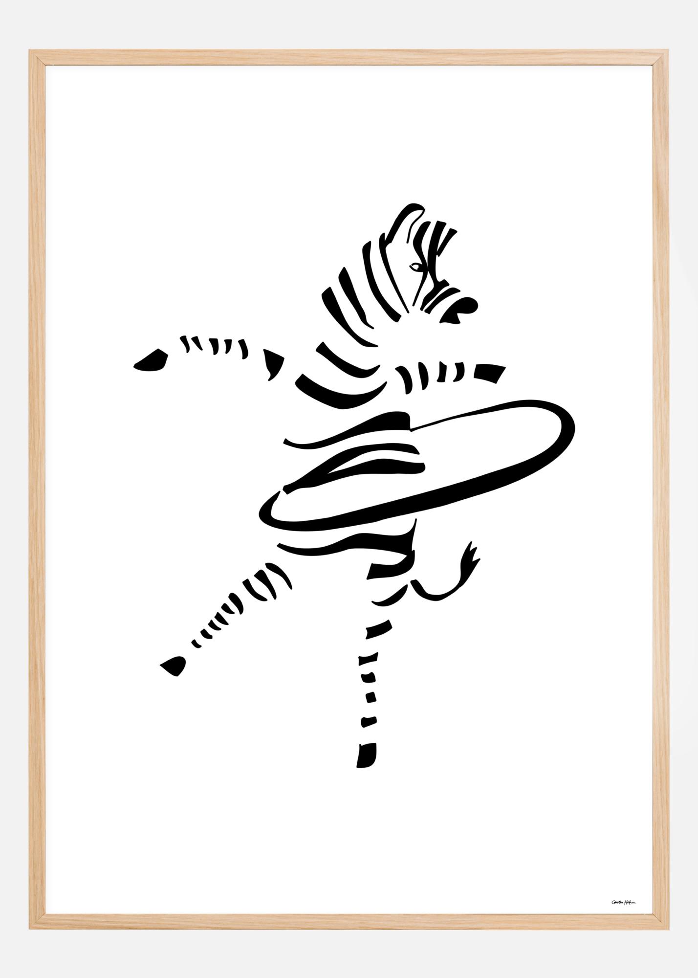 Egy minimalista portré egy táncoló zebráról. Fehér háttéren az ügyes fekete ecsetvonások alkotják a zebra formáját. Ez az aranyos zebra a hátsó lábain áll, és egy karikával táncol. Egy egyszerű, de vidám poszter, amit érdemes egy egyszerű falra felakasztani.