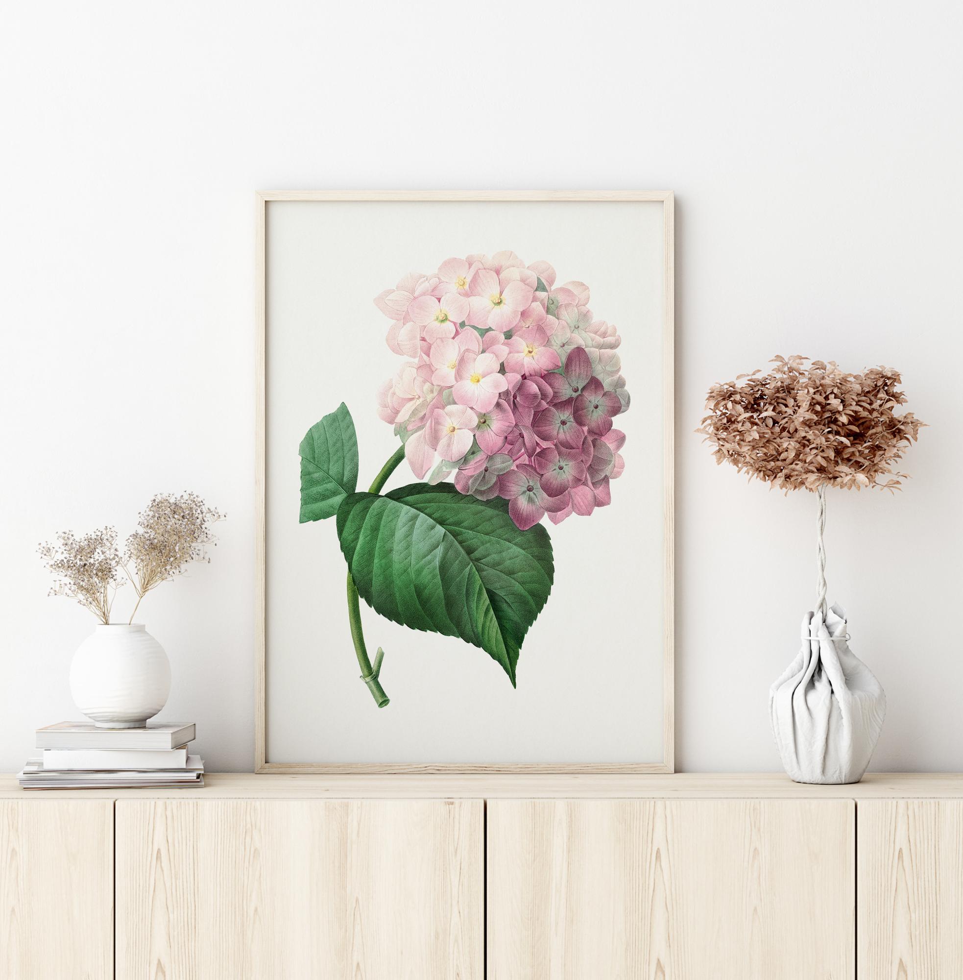 Egy virágos poszter egy hortenzia képével. Lágy rózsaszín szirmok, lágy zöld szár és egy zöld levél dominál a kép közepén. Tiszta fehér háttérrel ez a gyönyörű, de érzékeny virág nyugalmat és békét sugall. Akassza fel ezt a képet egy télikertbe, hogy egy kis extra eleganciát adjon a szobának.