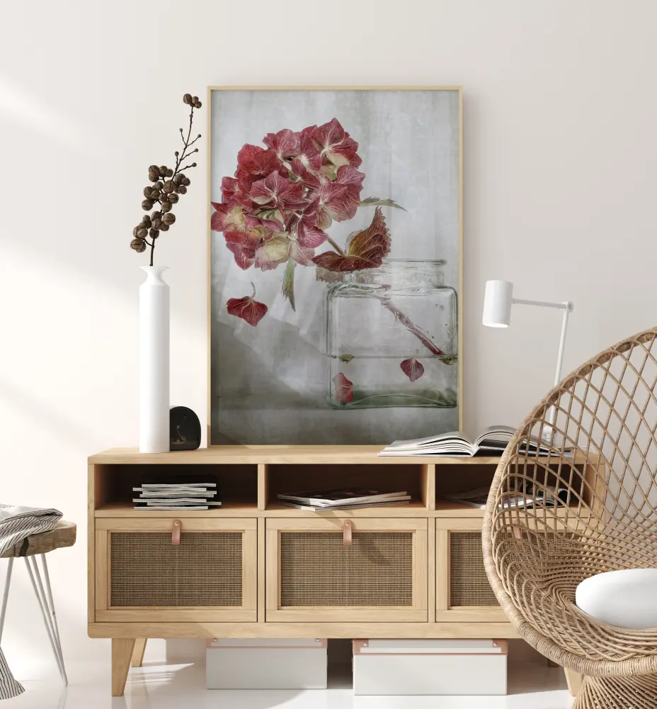 Egy gyönyörű természetposzter egy hortenziaszárral egy átlátszó vázában. Egy virágos fehér függöny előtt egy finom rózsaszín szirom hullik. A függöny enyhe szellőtől libben. Ez a kép szinte érezteti veled a szellőt.
