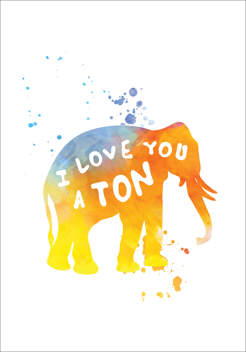 Szeretetteljes és szórakoztató poszter, amely ideális ajándék annak, aki szereti az elefántokat és színes foltra vágyik a falon. Az elefánt úgy tűnik, mintha színek bőségével lenne nyomtatva fehér papírra, a szöveg pedig kézírásos hatású fehér betűtípusban jelenik meg. A poszter szépen keretbe foglalható egy letisztult egyszínű kerettel, amely kiemeli a motívum árnyalatait, és jól illeszkedik annak a szobának a többi berendezéséhez, ahol a kép fel lesz akasztva.