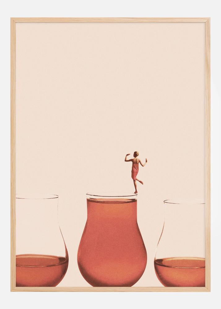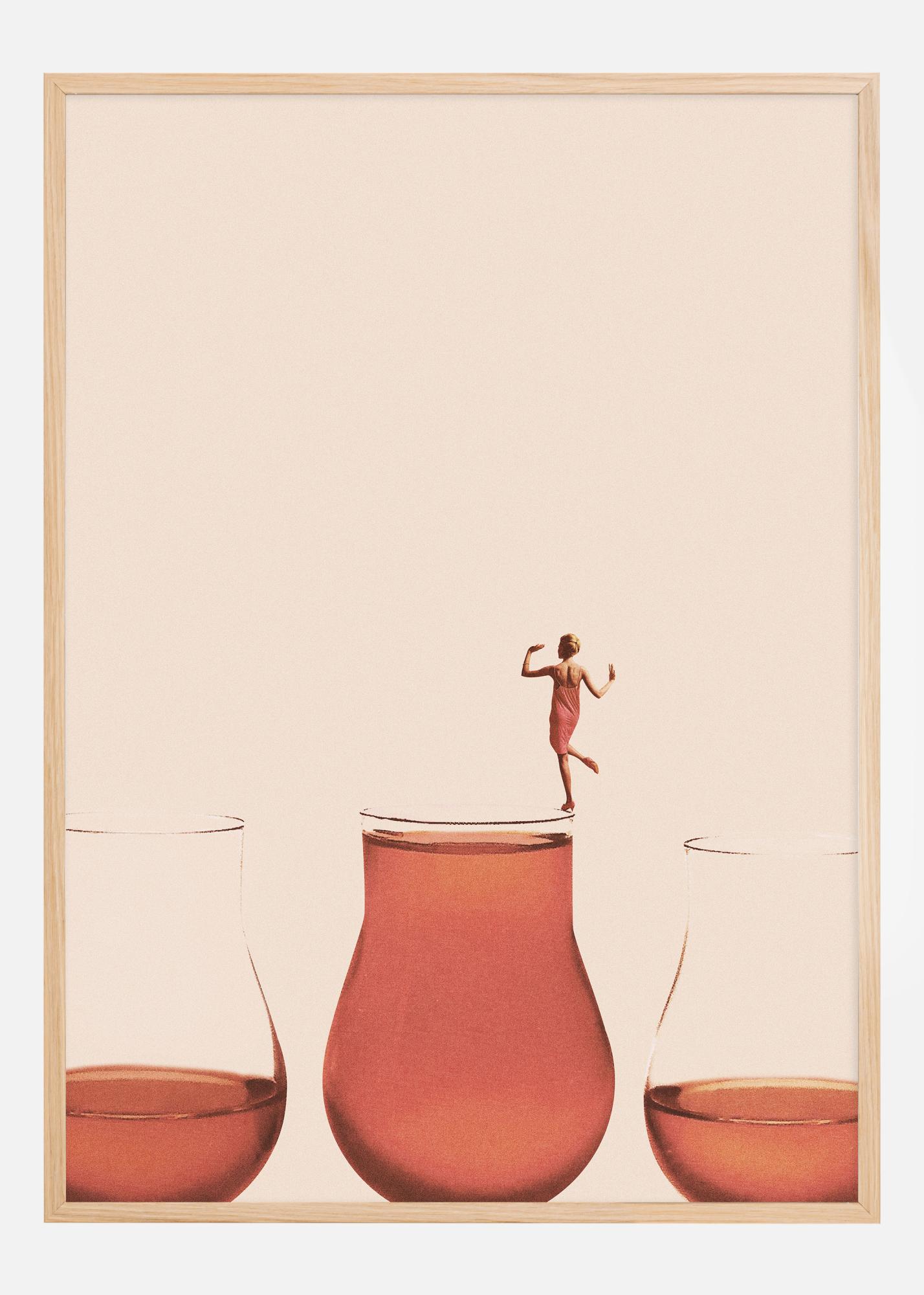 Ez a kultivált és esztétikailag vonzó poszter egy női alakot ábrázol, aki finom egyensúlyozó aktust hajt végre egy túlcsorduló borospohár szélén. A nő, aki ruhát visel, mintha táncolna vagy nemesen, kecsesen mozogna, a kontroll és precizitás képét nyújtja egy olyan cselekvésben, ami kockázatosnak tűnhet. Sziluettje majdnem metaforaként jelenik meg az élet finomabb dolgai élvezetéhez szükséges aprólékos megközelítéshez, kiegyensúlyozott értékeléssel a teljes és az üres iránt.