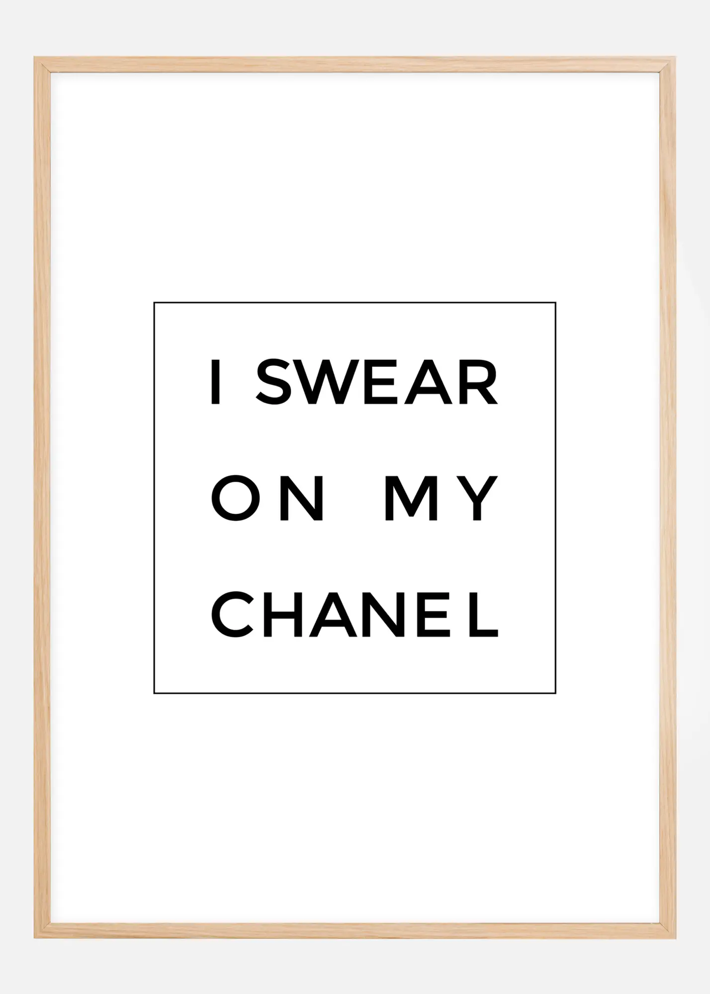 Ha Chanel-re esküszöl - nos, akkor mindenki, aki valóban ismer, tudja, hogy komolyan mondod! Ez a stílusos poszter tökéletesen illik az otthonodba, ha szívesen veszed körül magad luxuscikkekkel. A poszter fehér, fekete nyomattal, amely a "I swear on my chanel" szöveget ábrázolja egy vékony, dekoratív négyzet belsejében. A fekete-fehér dizájn kiválóan mutat a kedvenc színű kereteddel. A poszter többféle méretben elérhető, így könnyen találhatsz egyet, amely illik az otthonodhoz.