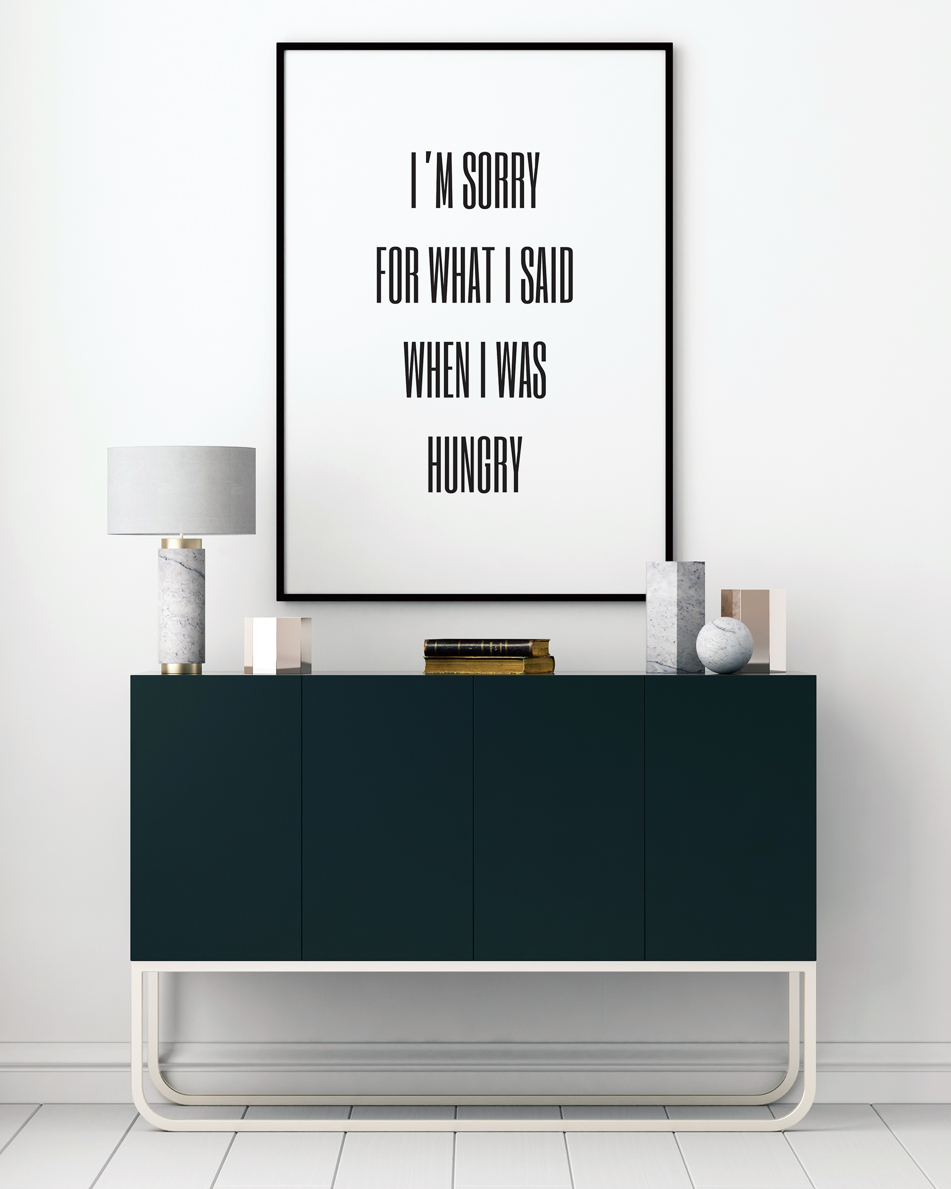 Egyszerű és stílusos szövegposzter az "I'm sorry for what I said when I was hungry" szöveggel nagybetűkkel. Egy poszter vicces üzenettel, tökéletes a konyhába, mint egy kis előzetes bocsánatkérés, ha az étkezés kicsit késik.