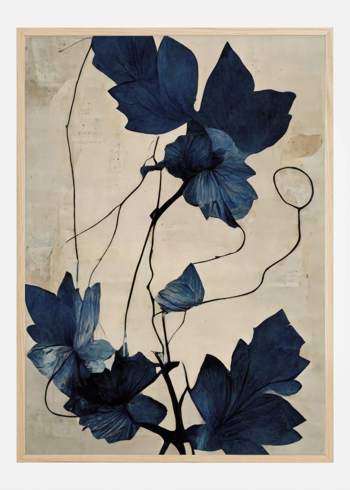 Ez a poszter lenyűgöző botanikai szépséget ragad meg a virágok részletes és élethű ábrázolásával mély indigókék színben. A levelek és a virágok intenzív és sötét árnyalatai ellentétben állnak egy régies, papírszerű háttérrel, amely antik és időtlen érzést ad. Ez a nyomat tisztelgés a klasszikus botanikai illusztráció előtt, és elegáns és kifinomult benyomást kelt bármelyik szobában, ahol elhelyezik.