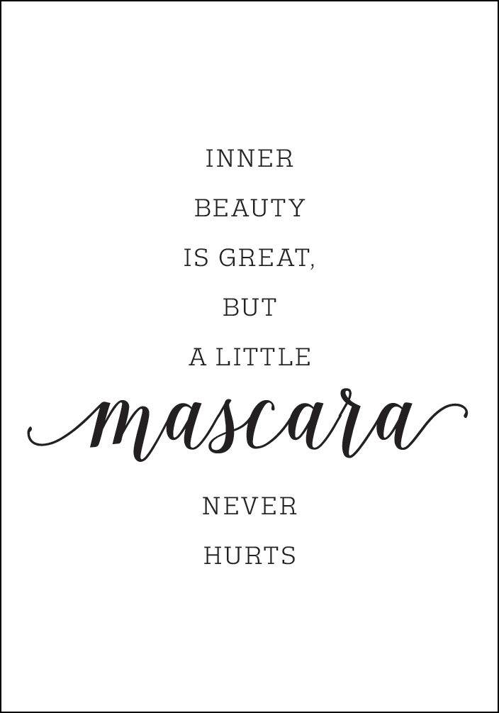 Egy motiváló poszter, amely üzenetet közvetít mindazok számára, akik szeretnek jól kinézni. A belső szépség jó, de egy kis szempillaspirál sosem árt. Egy üzenet, amit követhetsz a különleges megjelenésért. Egy szép nyomat, amelyet a sminkasztalod mellett akaszthatsz fel.
