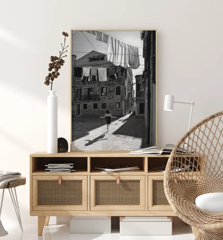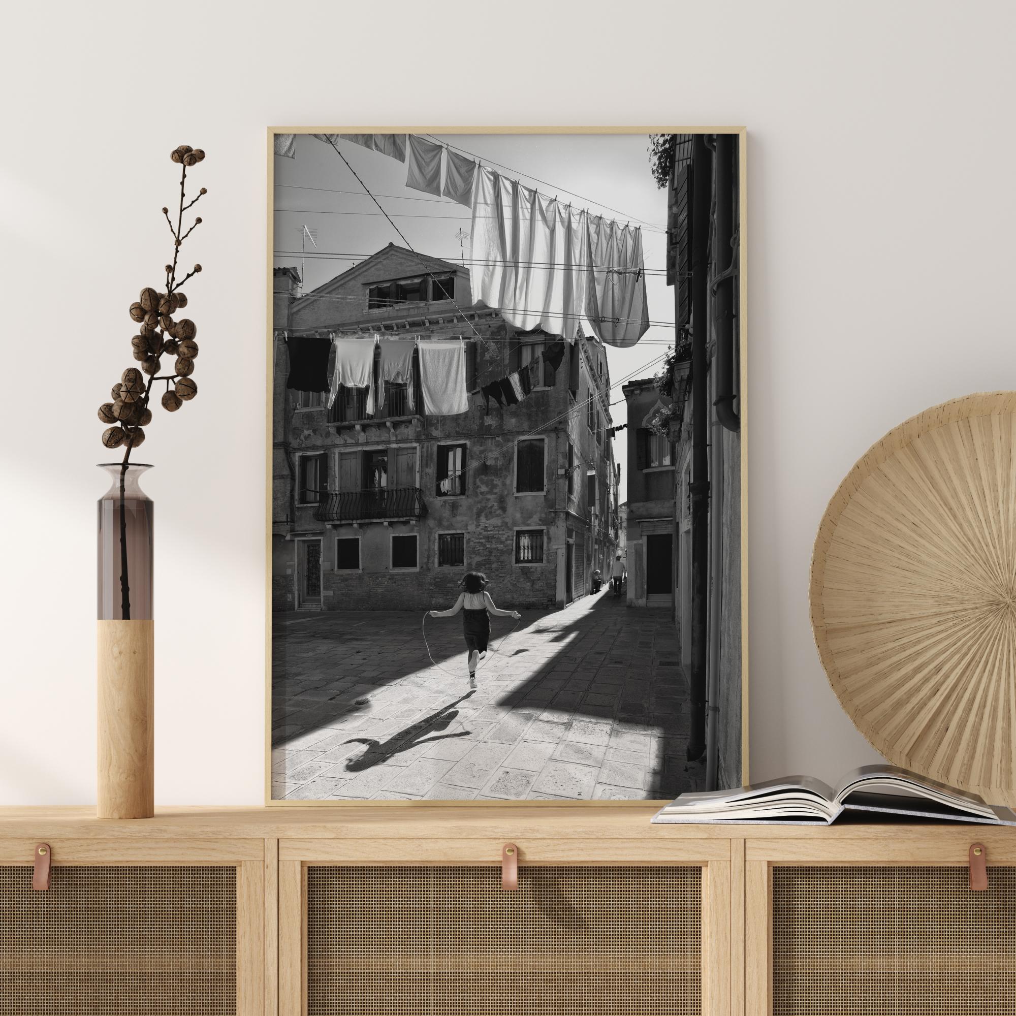 Egy elbűvölő poszter egy fiatal lányról, aki ugrálókötelezik a házak és a kitett ruhák között. Egy világos napsugár éri őt, és mögé vetíti az árnyékát. Adj otthonodnak egy ártatlan csodálat érzését ezzel a képpel.