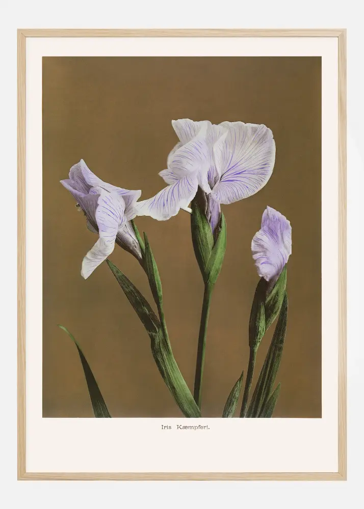 Ez a kiváló poszter az impozáns Iris Kaempferit ábrázolja, amelyet gyakran japán írisként ismernek, büszkén mutatva meg jellegzetes lila és fehér szirmait. A különböző lila árnyalatokban, a pasztell színtől a mélyebb ibolyasávokig, látható légies virágok kiegészülnek vékony vonalakkal és mintákkal, amelyek finomság és részletgazdagság érzetét keltik. Az egyenletes kávészínű háttér előtt a növény kecses formája kiemelkedik, így ez a nyomat feltűnő elemmé válik bármilyen belsőépítészeti dizájnban.