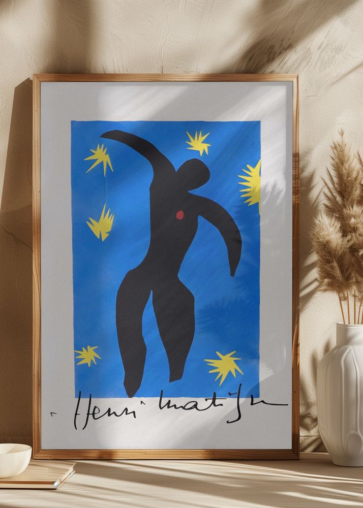 Ez a poszter egy ikonikus sziluettet ábrázol mély Fekete színben, amely egy élénk Kék háttér előtt táncol, mozgás és szabadság érzetét keltve. A figura körül csillagszerű Sárga formák jelennek meg, amelyek dinamikus és életteli hangulatot adnak a motívumnak. Ezeknek a színeknek a kombinációja harmonikus, mégis energikus érzést teremt – tökéletes választás, ha művészi stílust szeretnél vinni otthonodba.