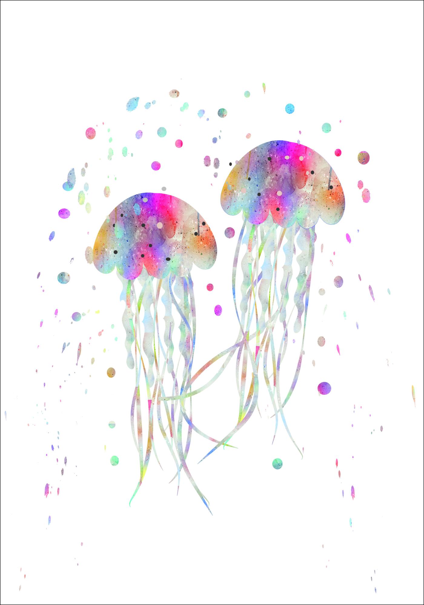 Egy szórakoztató és kreatív nyomat két kis színes medúzáról. Színes harangjaikkal és csápjaikkal színes véletlenszerű pontok veszik körül őket egy fehér háttéren. Egy elbűvölő poszter, amely bármely szobát feldob.