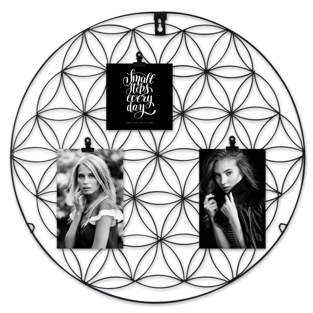 Ez egy menő, kerek keret fekete fémből. A kollázskeret átmérője 50 cm, és a képeket csipeszekkel rögzítjük egy dekoratív mintás háttérre. Mivel a képeket csipeszekkel rögzíti, különböző méretű képeket helyezhet el, hogy stílusos és kissé dinamikus érzést keltsen. Ezt a kerek fém kollázskeretet szépen elhelyezheti otthonában, hogy gyönyörű látványt nyújtson, vagy adhatja ajándékba valakinek!