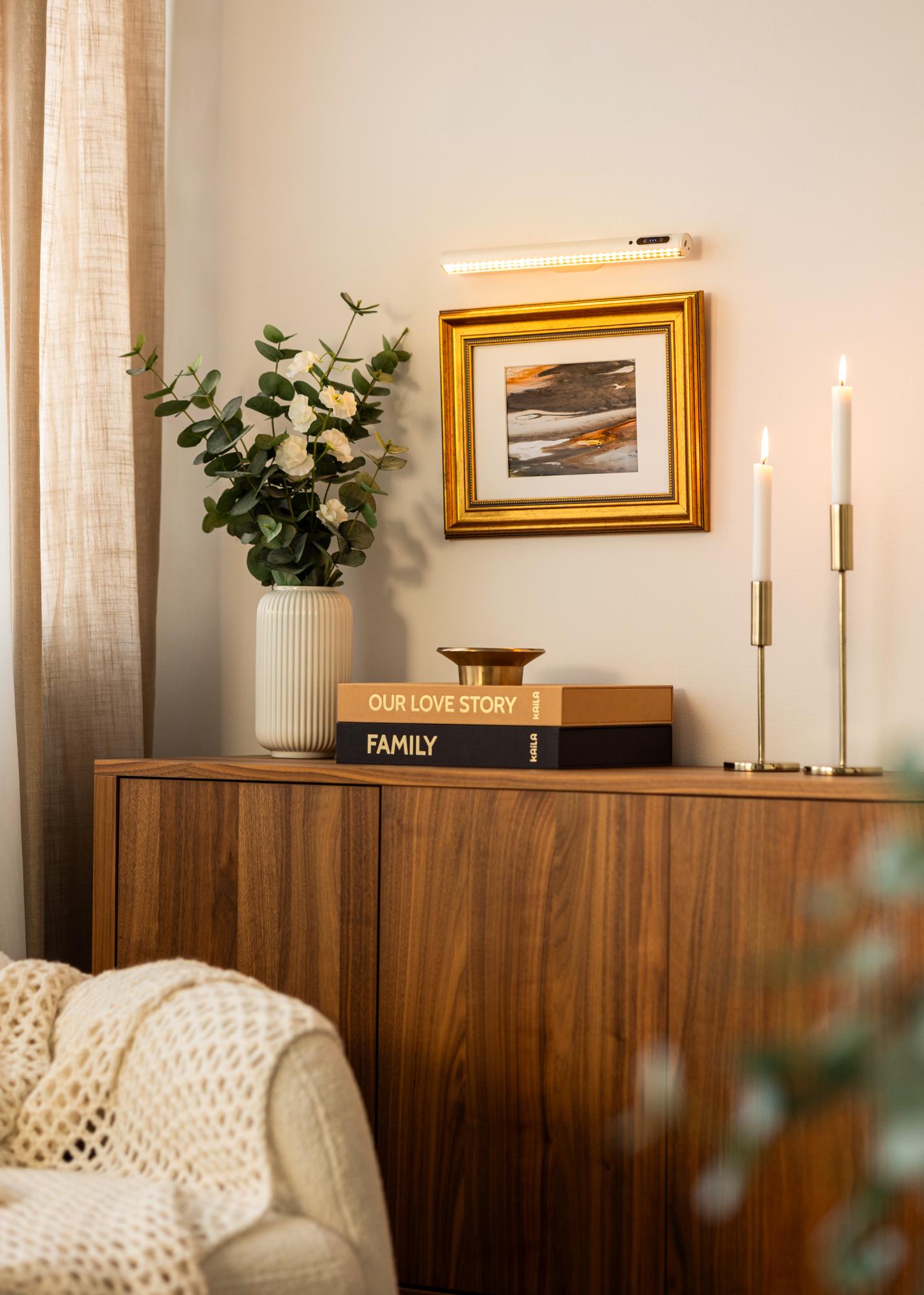 A KAILA Illuminate egy stílusos és elemmel működő képmegvilágító fehér kivitelben, tökéletes a képek kiemeléséhez zavaró vezetékek nélkül. A vezeték nélküli kialakítás megkönnyíti és rugalmasabbá teszi a felszerelést, anélkül, hogy a konnektorokra gondolnia kellene. Az elegáns fehér szín modern és visszafogott megjelenést kölcsönöz, amely beleillik a különböző berendezési stílusokba, miközben az egyenletes fény kiemeli a műalkotása részleteit és színeit. Könnyen telepíthető és használható – praktikus és kényelmes megoldás a faliképéhez.