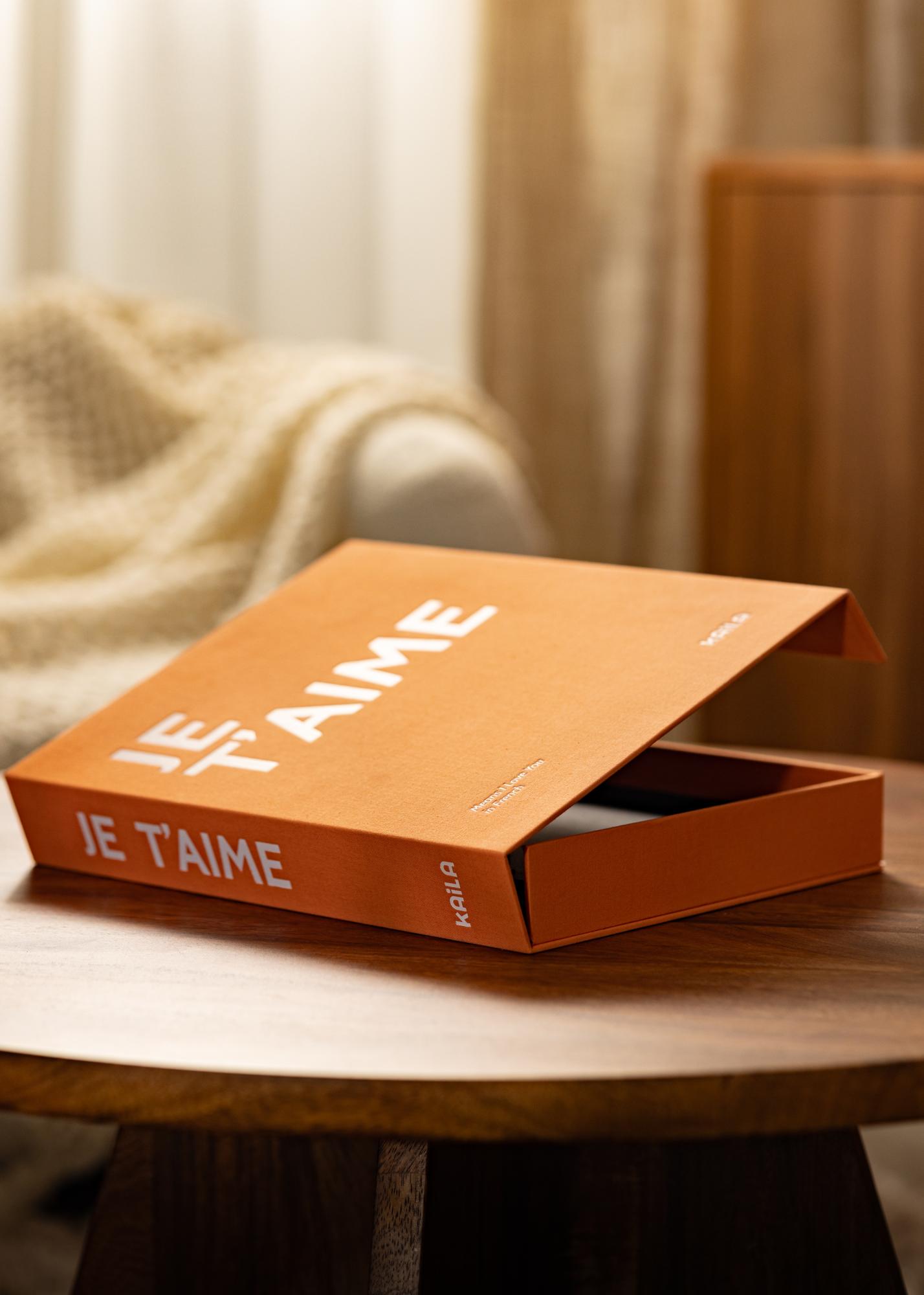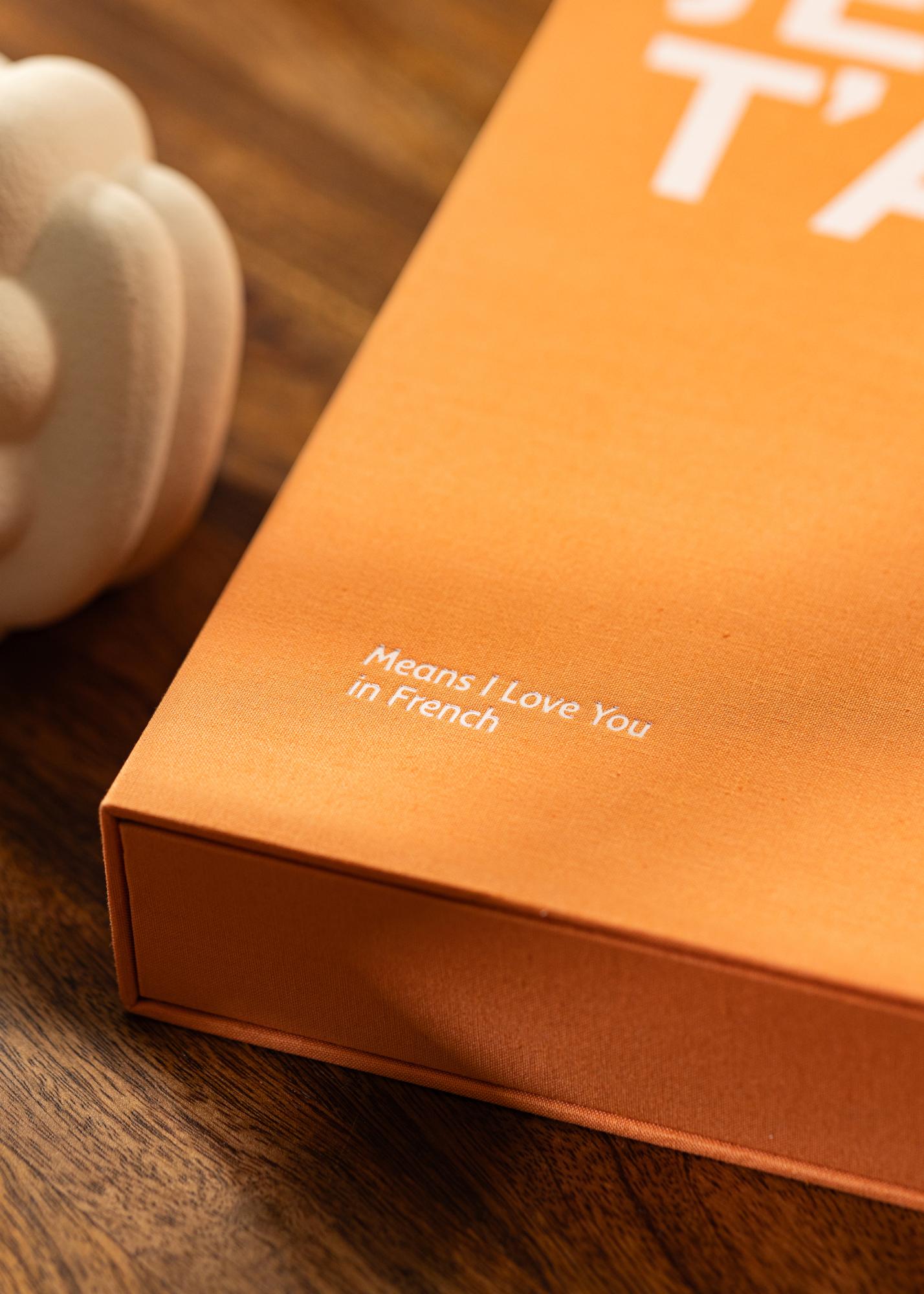 Ez a Coffee Table Album stílust, luxust és romantikát sugároz. Az exkluzív dizájn egy textilborítású doboz formájában készült elegáns narancssárga színben. A borítót egy fehér szöveg díszíti az "JE T'AIME" kifejezéssel, amit egy leíró alcím követ: "Means I Love You in French". Belül egy finoman díszített belső borító található, valamint 60 fekete albumpapír (30 lap). Mivel saját magad ragasztod be a képeket az albumba, lehetőséget kapsz a kreativitásra.