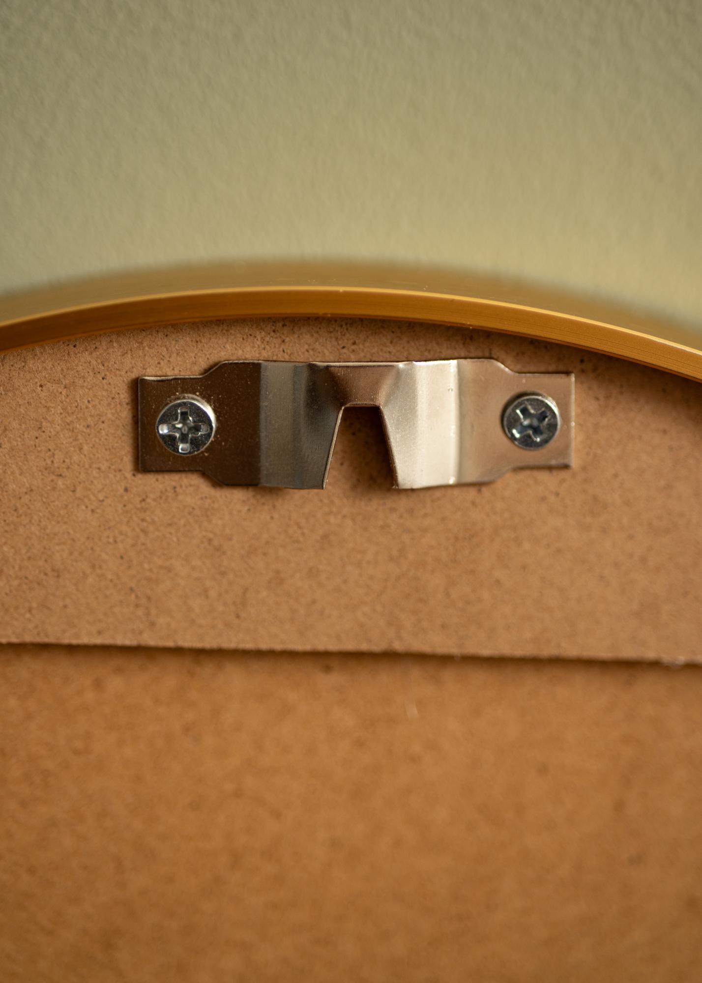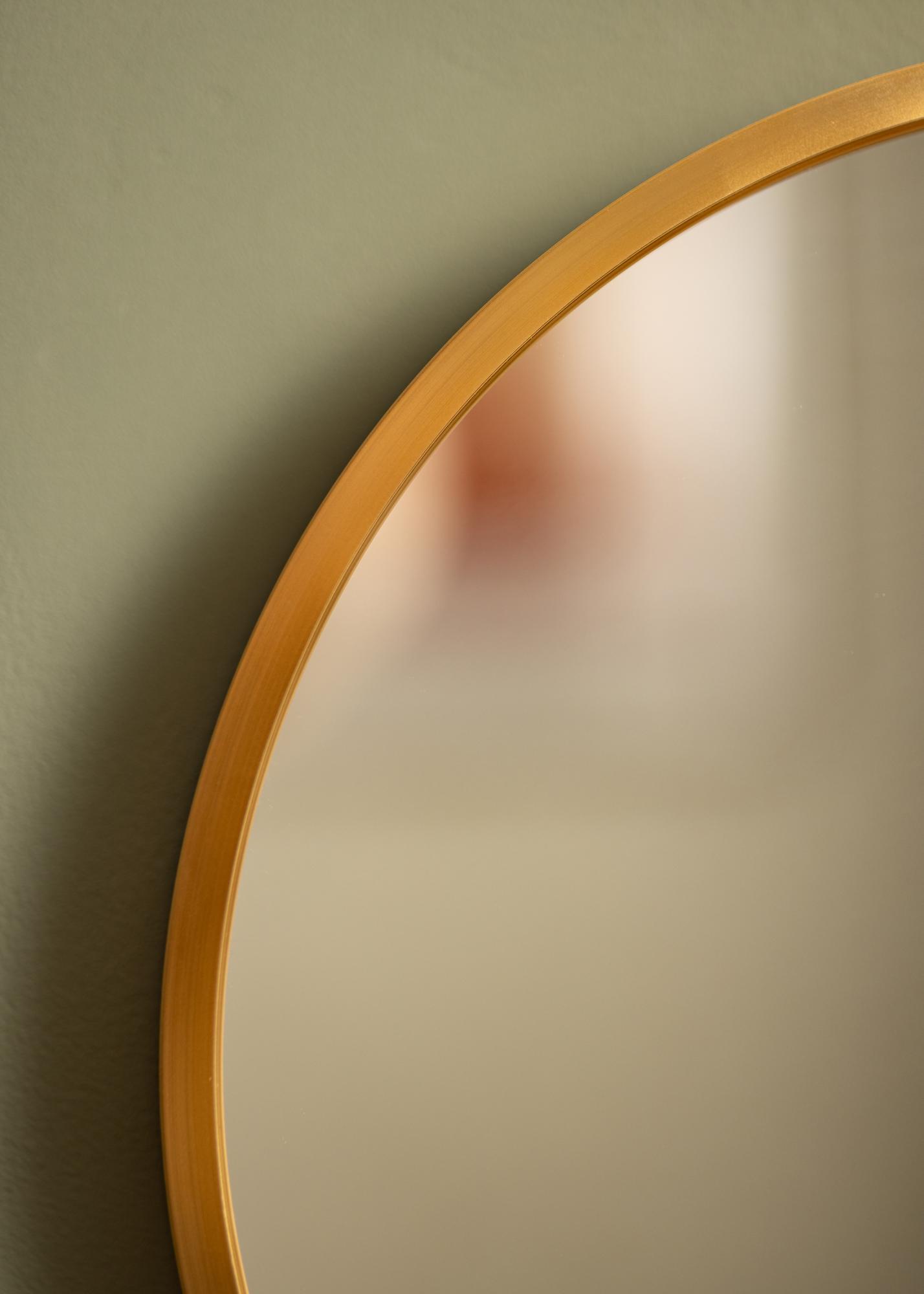 Egy kerek tükör letisztult svéd dizájnnal, fémkerettel, amely gyönyörű arany kivitelben van. A keretnek van egy kefélt felülete, amely az arany színnek kissé mattabb megjelenést kölcsönöz. A keret divatosan vékony, de egyúttal – a mérettől függően – 30-40 mm mélységű, ami miatt kissé kiáll a falból, és izgalmas 3D-hatást kelt. A keret mélysége emellett azt is eredményezi, hogy a tükör masszívnak és robusztusnak érződik, anélkül, hogy elvenné a tükör minimalista érzését.