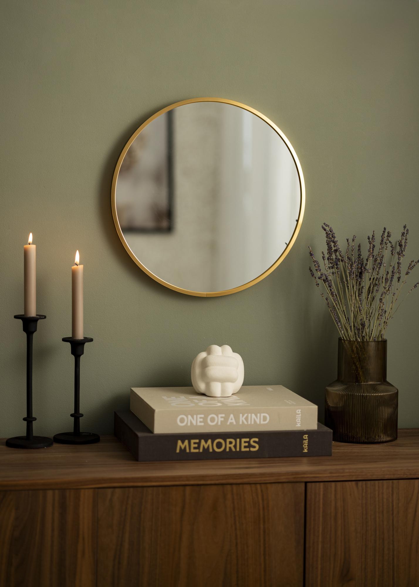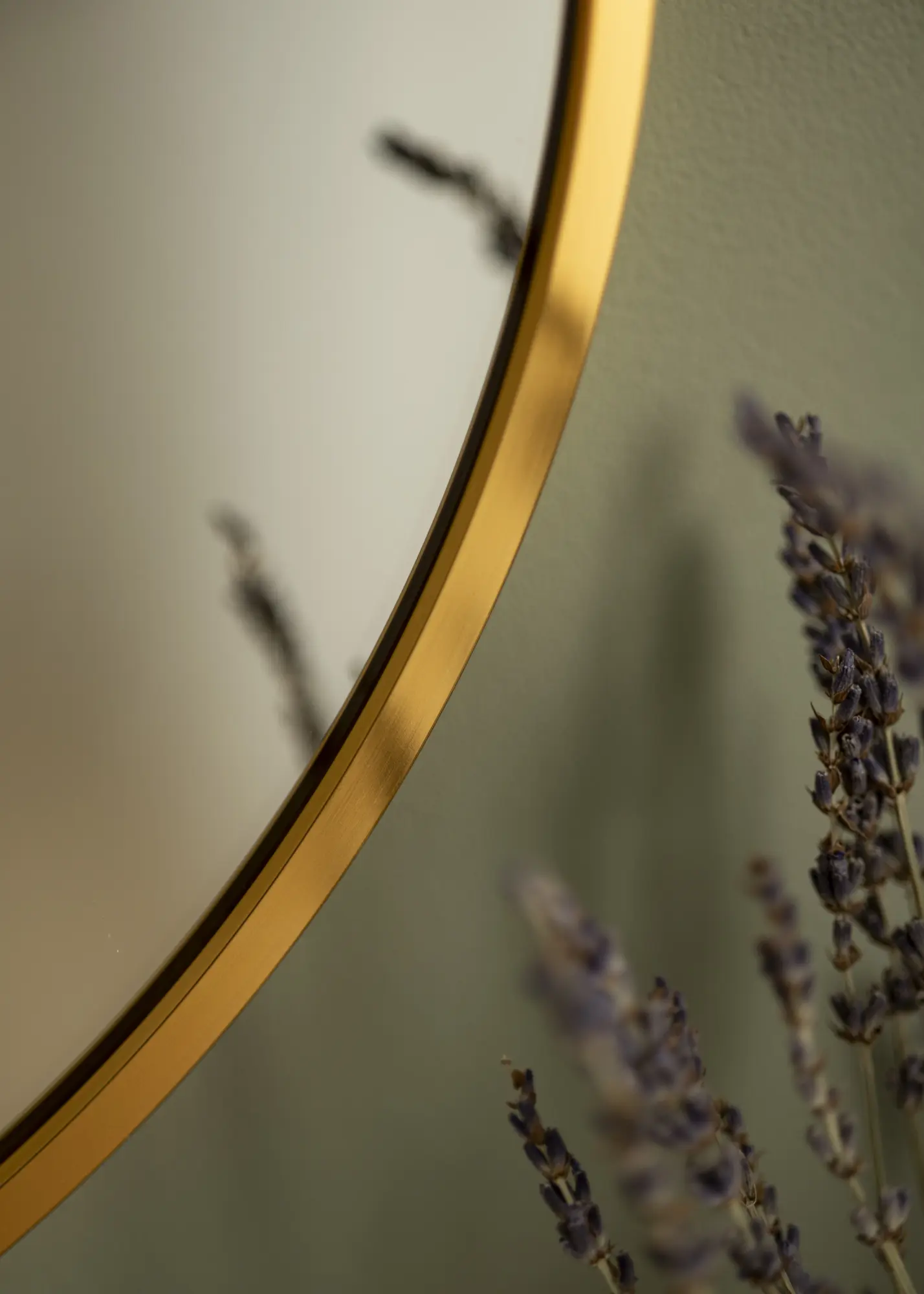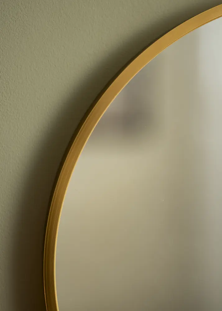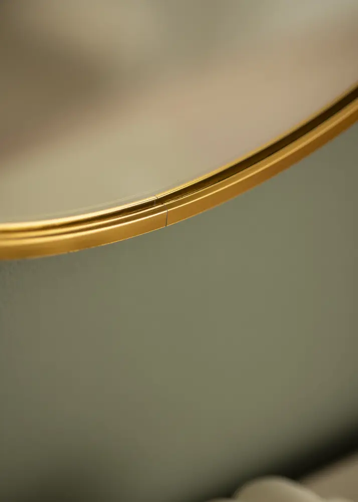 Egy kerek tükör letisztult svéd dizájnnal és gyönyörű aranyfényű fémkerettel. A keret kefélt felületű, ami a gyönyörű aranyszínnek kicsit mattabb megjelenést kölcsönöz. A keret divatosan vékony, de mérettől függően 30-40 mm mélységű, ami azt jelenti, hogy kicsit eláll a faltól, és egy izgalmas 3D-hatást kelt. A keret mélysége továbbá azt is biztosítja, hogy a tükör masszívnak és robusztusnak érződjön, anélkül hogy elvenné a tükör minimalista jellegét.
