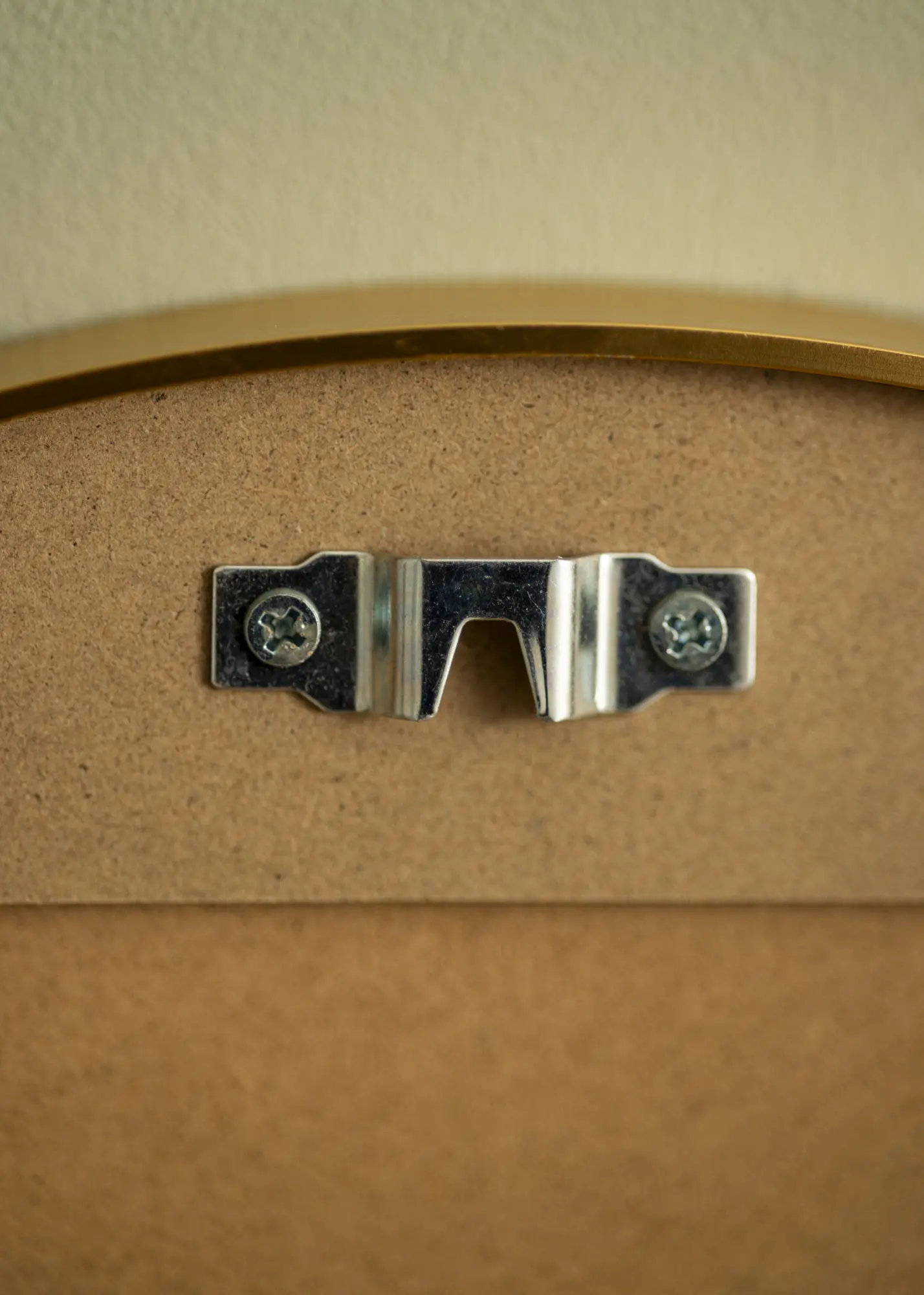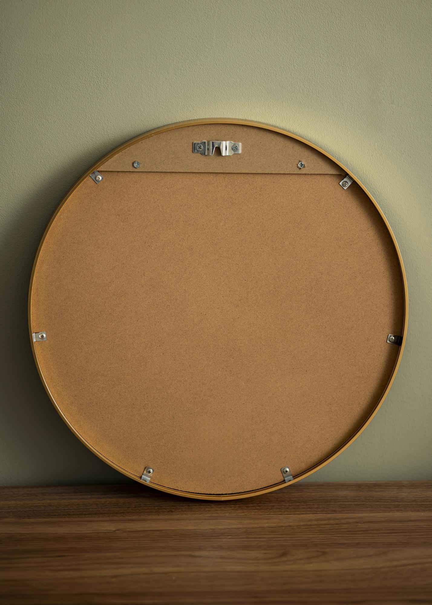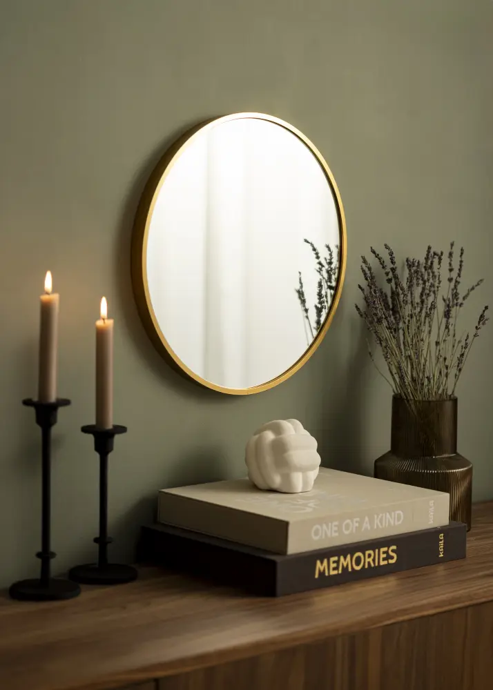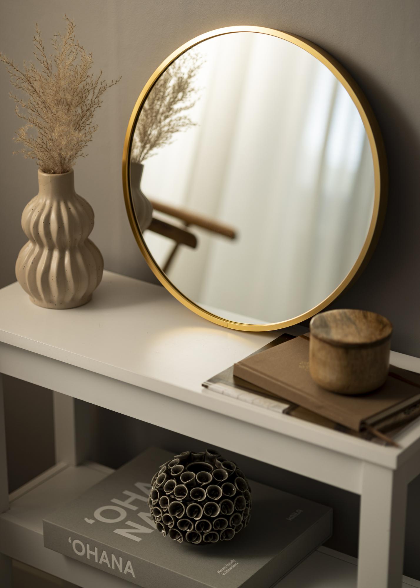 Egy kerek tükör letisztult svéd dizájnnal és gyönyörű aranyfényű fémkerettel. A keret kefélt felületű, ami a gyönyörű aranyszínnek kicsit mattabb megjelenést kölcsönöz. A keret divatosan vékony, de mérettől függően 30-40 mm mélységű, ami azt jelenti, hogy kicsit eláll a faltól, és egy izgalmas 3D-hatást kelt. A keret mélysége továbbá azt is biztosítja, hogy a tükör masszívnak és robusztusnak érződjön, anélkül hogy elvenné a tükör minimalista jellegét.
