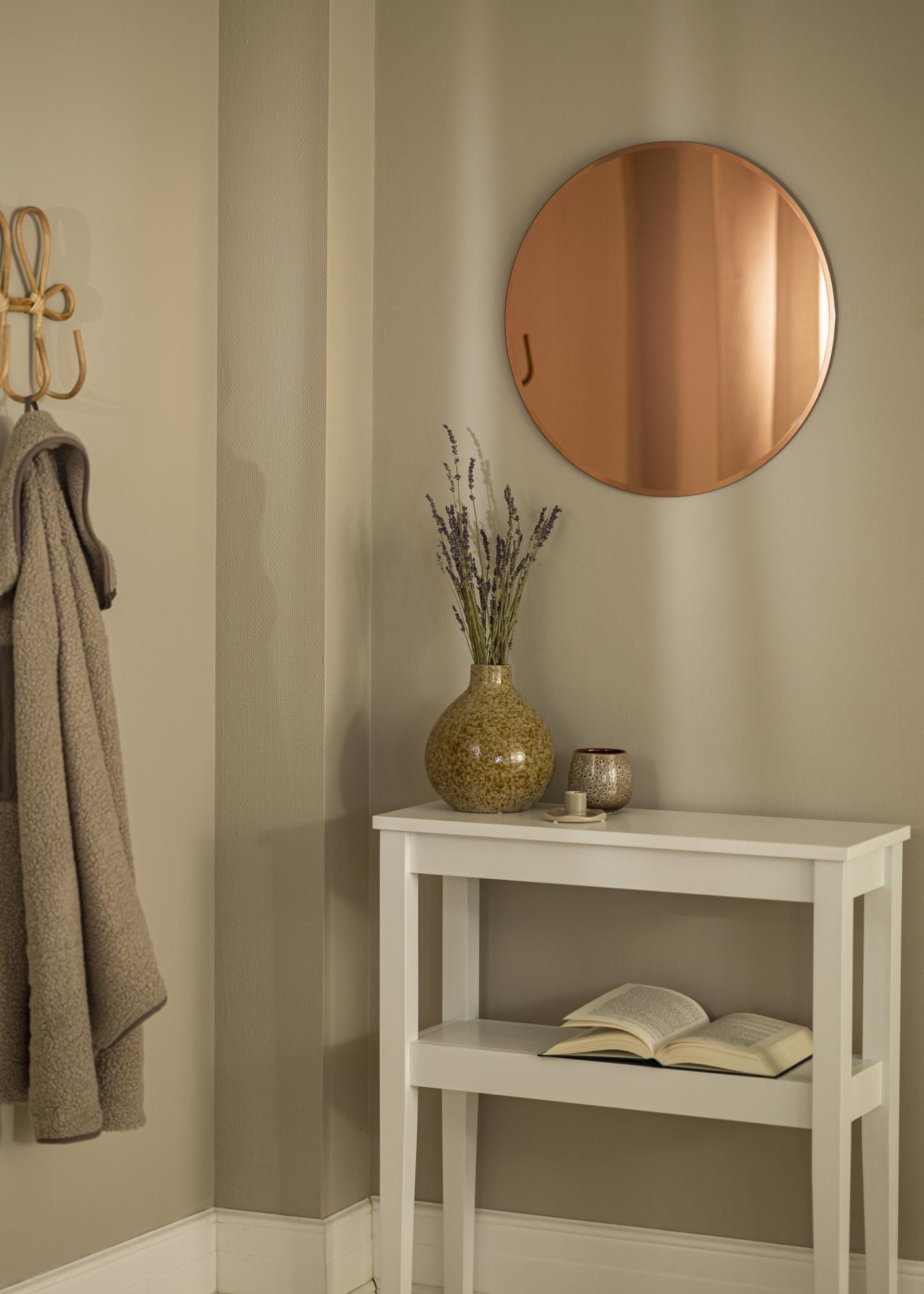 Rose Gold Deluxe egy falitükör időtálló dizájnnal, modern csavarral a tónusos tükörüveg formájában. A tükörüveg meleg rózsaarany árnyalata exkluzív és egyedi megjelenést kölcsönöz, amelyet tökéletesen kiegészít az elegáns, kerek forma. További finomságként a tükör fazettázott éllel van ellátva.
