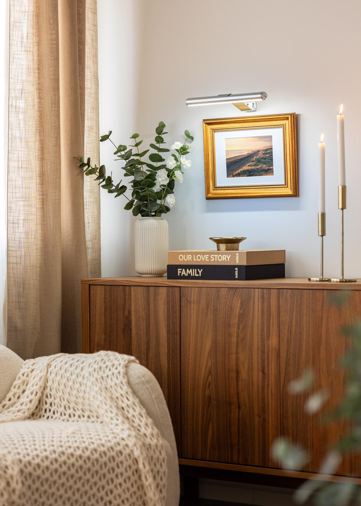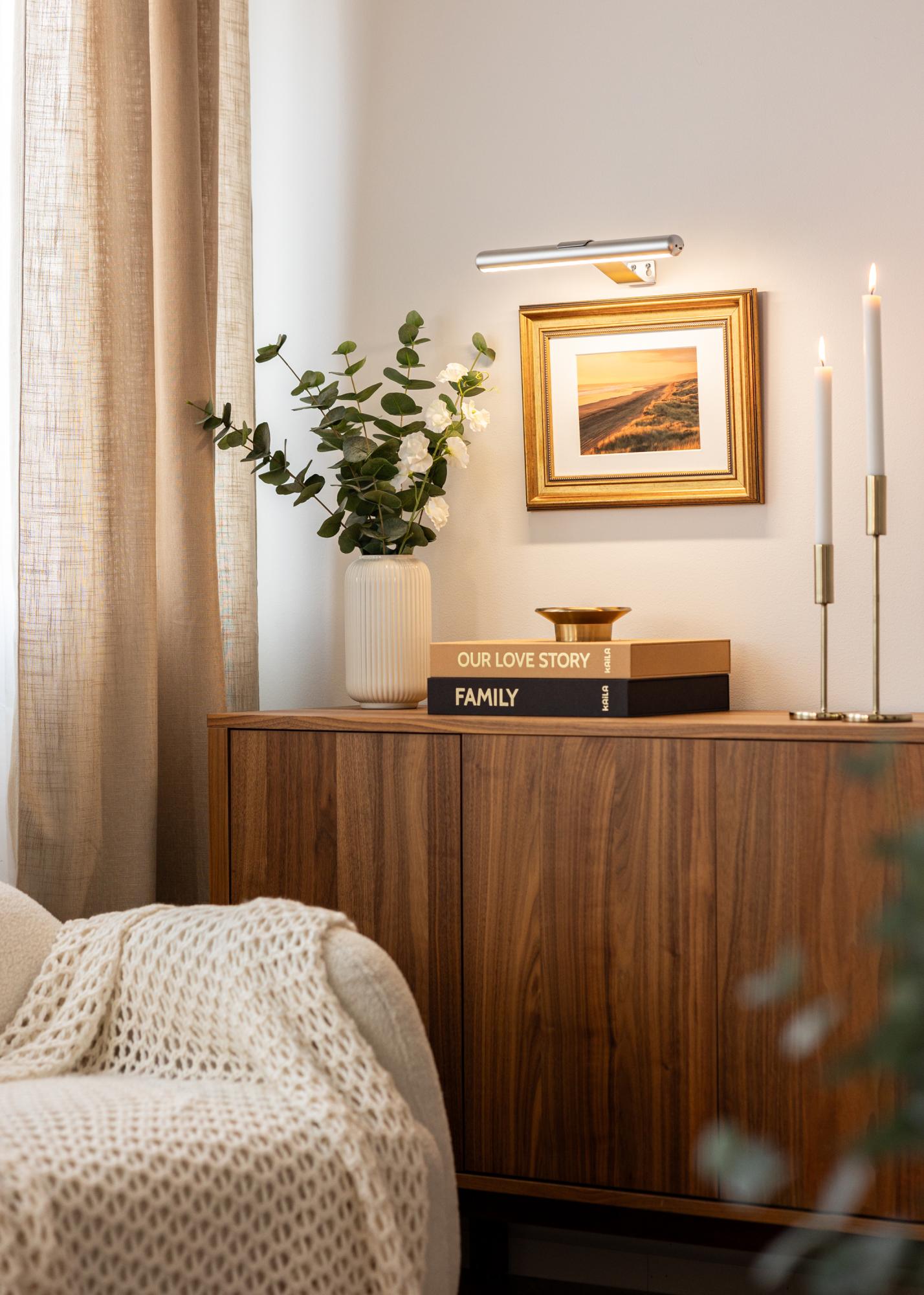 Ez az ezüst színű, elemmel működő képvilágítás praktikus és esztétikailag vonzó megoldás műalkotásainak megvilágítására, a kábelek okozta nehézségek nélkül. Elemvezérelt kialakításának köszönhetően bárhol elhelyezheti, függetlenül a konnektoroktól. 15 cm mélységével és 33 cm hosszúságával diszkrét és hatékony módja a 60 cm szélességig terjedő műalkotások kiemelésének.