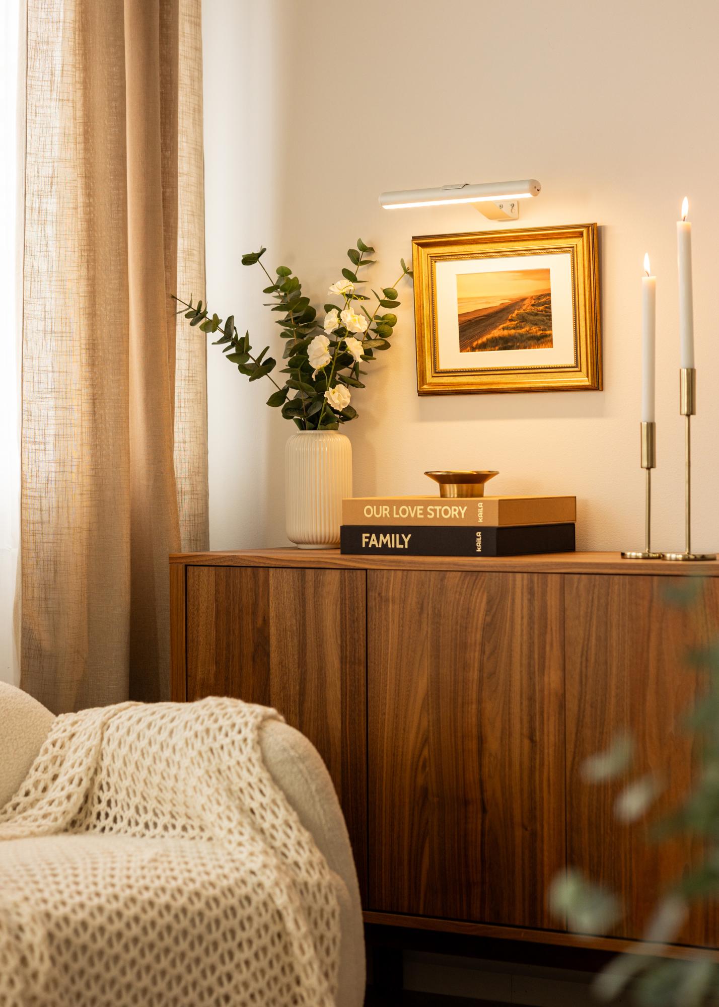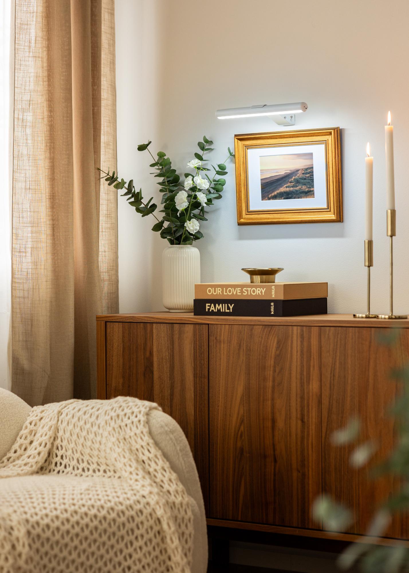 Ez az akkumulátoros képvilágítás fehér kivitelben, praktikus megoldást kínál műalkotások megvilágítására vezetékek nélkül. Az akkumulátoros működésnek köszönhetően bárhol elhelyezhető, anélkül hogy az elektromos aljzat miatt kellene aggódnia, ami nagyon rugalmassá teszi. 15 cm mély és 33 cm hosszú, így a világítás kompakt és könnyen telepíthető, miközben akár 60 cm széles műalkotásokat is képes megvilágítani.