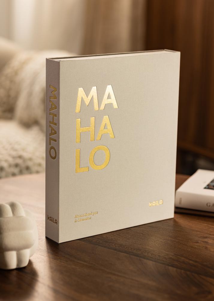 Ezzel a Coffee Table Bookkal egy praktikus fényképalbumot és egy szép lakberendezési kiegészítőt kap egy csomagban! Az album egy exkluzív dobozként van kialakítva, szürke textilborítással és aranyszínű nyomtatással, amelyen a „MAHALO” felirat olvasható. Az album bal sarkában egy alcím található: „Means thank you in Hawaiian”. A klasszikus kifejezés miatt ez a Coffee Table Album tökéletesen illik a könyvespolcra vagy a nappali asztalára.