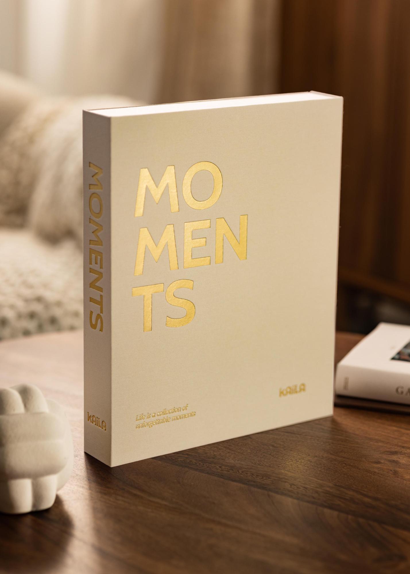 A fényképalbum egy dobozként van kialakítva, amelyet kinyithat, hogy hozzáférjen a képeihez. A borító krémszínű textíliával van díszítve, amely luxusérzetet kölcsönöz. Az elején és oldalán a "MOMENTS" felirat látható. A felső rész bal sarkában a gyönyörű alcím látható: "Az élet felejthetetlen pillanatok gyűjteménye".