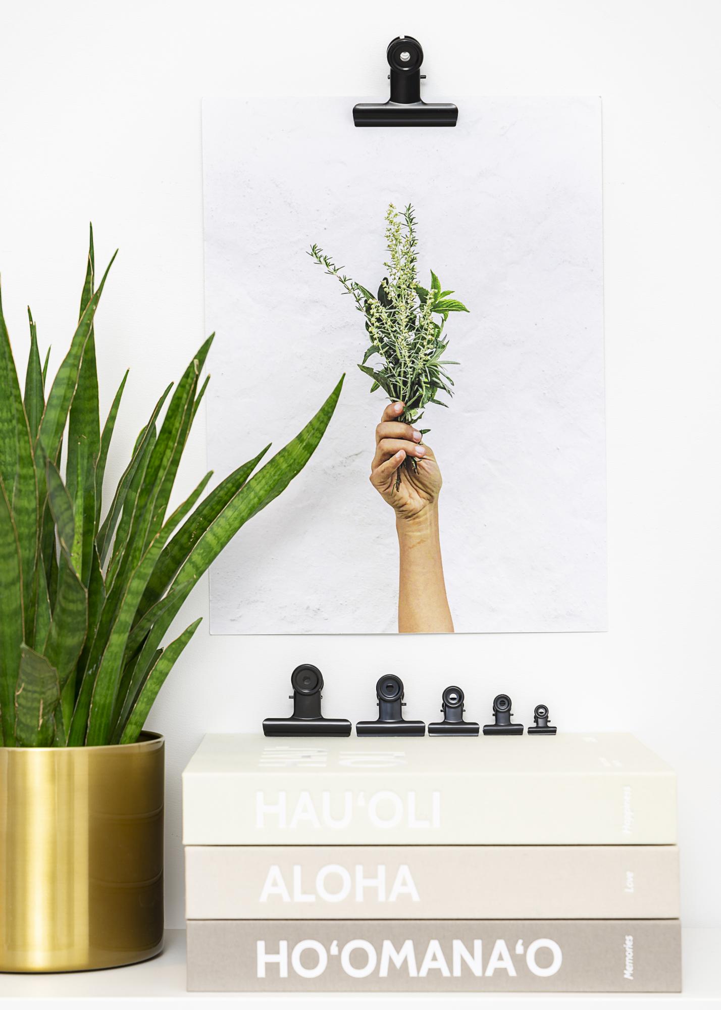 Ez a fekete fémcsipesz elegáns matt felületű, és stílusos, trendi megoldást nyújt plakátjaid és nyomataid felakasztására. A csipesz nyílása erős fogással rendelkezik, így a legvékonyabb papírt is rögzítheted, de akár vastagabb anyagokhoz is használható. Ha egy nagy plakátot szeretnél felakasztani, két plakátcsipeszt is használhatsz. A fémcsipesz dizájnja letisztult, és a csipesz kerek tetején lévő lyukaknak köszönhetően egyszerű egy kis szöggel vagy csavarral a falra akasztani.