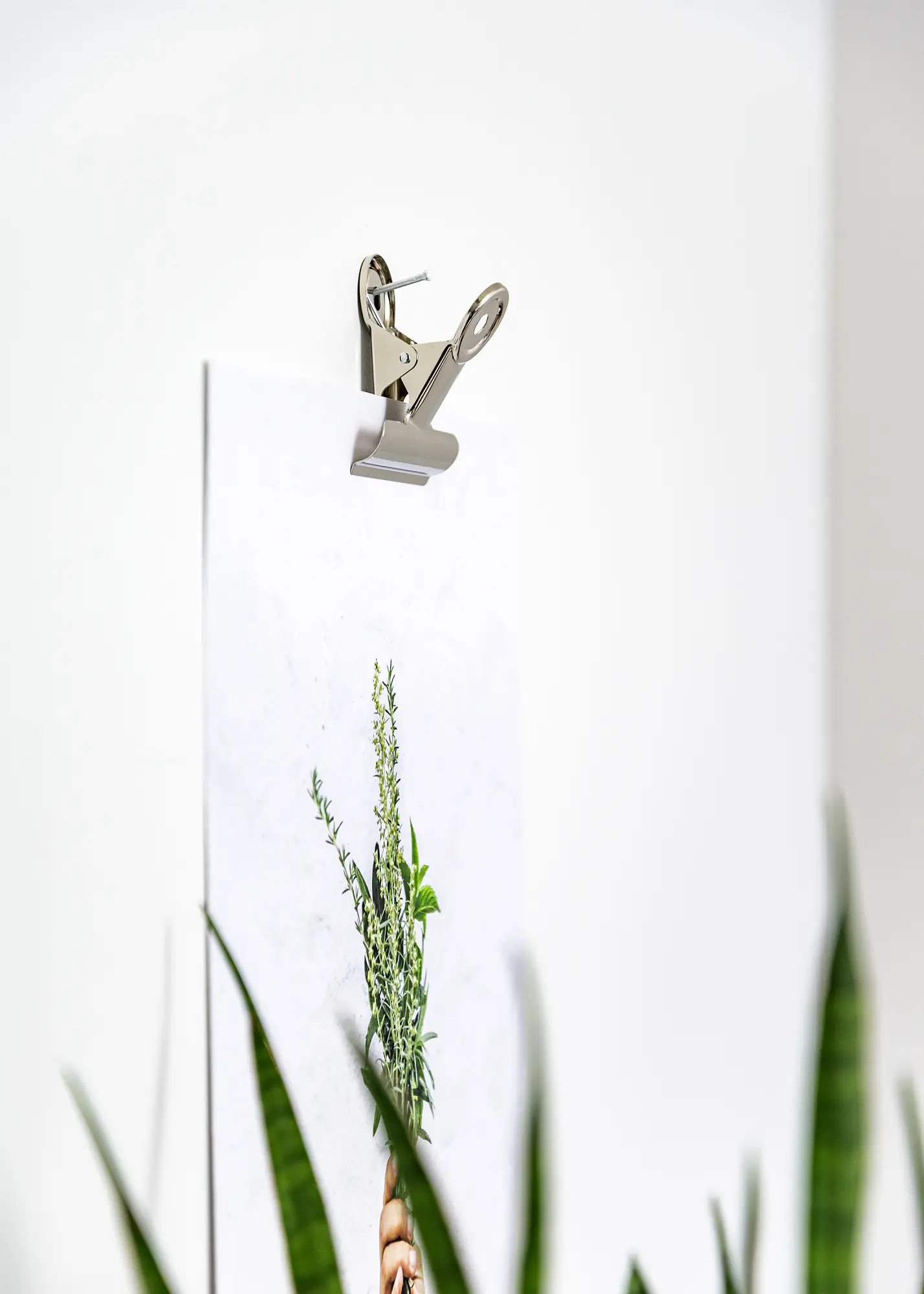 Ez a fémcsipesz modern és fényes ezüst bevonattal rendelkezik, és a plakátok vagy nyomatok trendi és minimalistikus felakasztásához tökéletes eszköz. A csipesz rugalmas és erős nyitási fogása lehetővé teszi, hogy különböző vastagságú motívumokat akasszon fel, még a legvékonyabb papírt is. Ha pedig nagy posztere van, csak használjon két fémcsipeszt. A posztercsipesz kialakítása letisztult és elegáns, és a csipesz kerek tetején lévő lyukak megkönnyítik és egyszerűvé teszik a falra történő rögzítést – mindössze egy kis szögre vagy csavarra van szüksége.