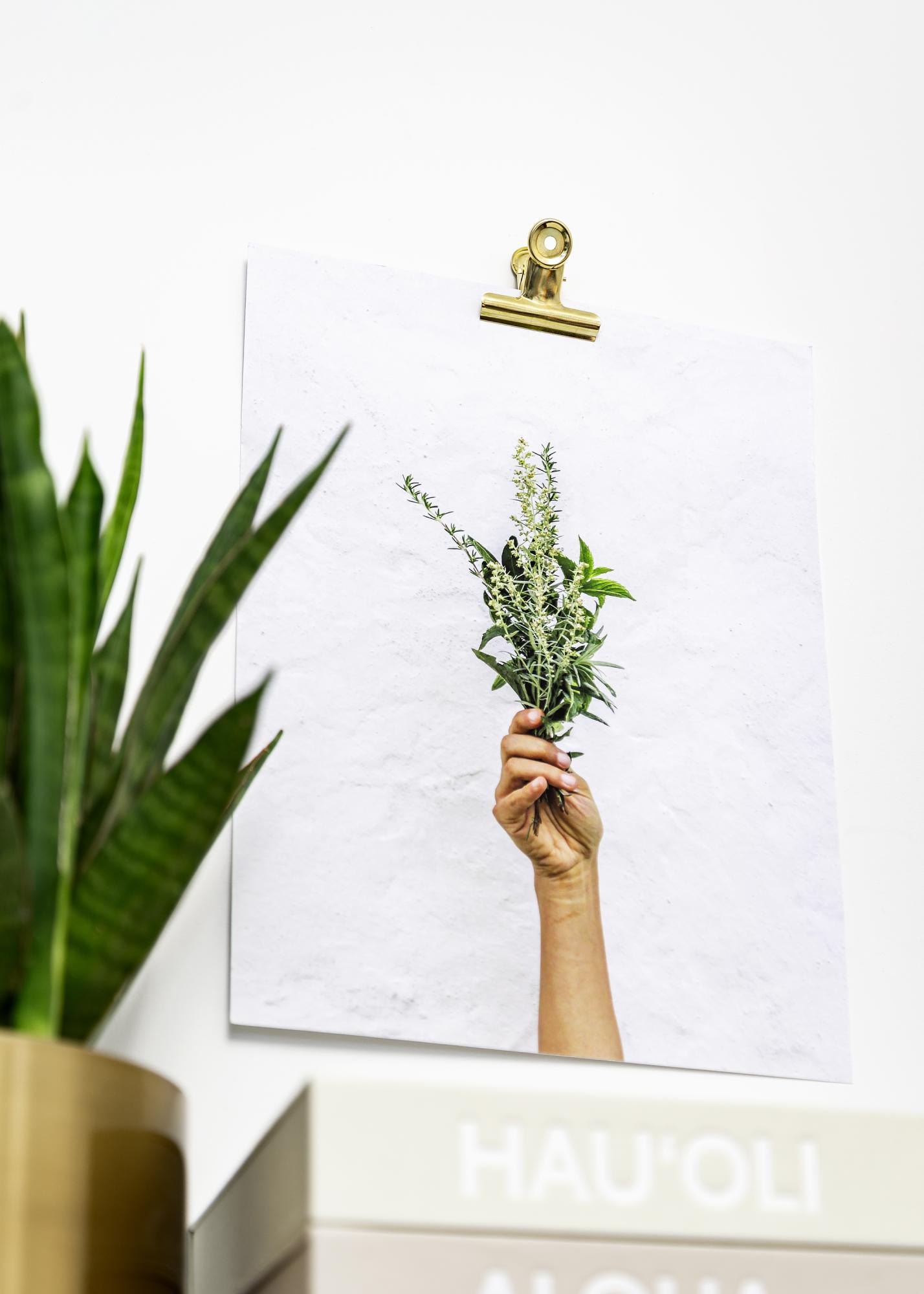 Egy fémcsipesz elegáns és fényes arany bevonattal, amely trendi és minimalista megjelenést biztosít posztereid és nyomataid számára. A posztercsipesz dizájnja letisztult, és a csipesz kerek tetején található lyukak megkönnyítik a falra rögzítését egy kis szöggel vagy csavarral. A csipesz nyílása szilárdan tart, így a legvékonyabb papírt is felakaszthatod, ugyanakkor rugalmas, és lehetővé teszi különböző vastagságú anyagok rögzítését is. Ha nagy posztert szeretnél felakasztani, használj két fémcsipeszt a legjobb eredmény elérése érdekében.