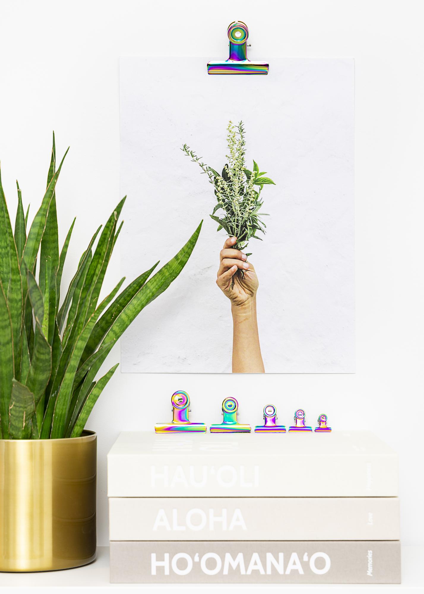 Egy finoman szivárványszínű fémcsipesz fényes felülettel, amely trendi és kissé eltérő függesztést kölcsönöz posztereidnek és nyomataidnak. A posztercsipesz erős, de rugalmas nyílása lehetővé teszi, hogy a legvékonyabb papírtól kezdve a valamivel vastagabb poszterekig bármit rögzíthess vele. Ha pedig egy nagy posztert szeretnél felakasztani, akkor csak két fémcsipeszt használj. A posztercsipesz kialakítása letisztult és egyszerű, és a csipesz kerek tetején lévő lyukaknak köszönhetően könnyen felrakhatod a falra egy kis szög vagy csavar segítségével.
