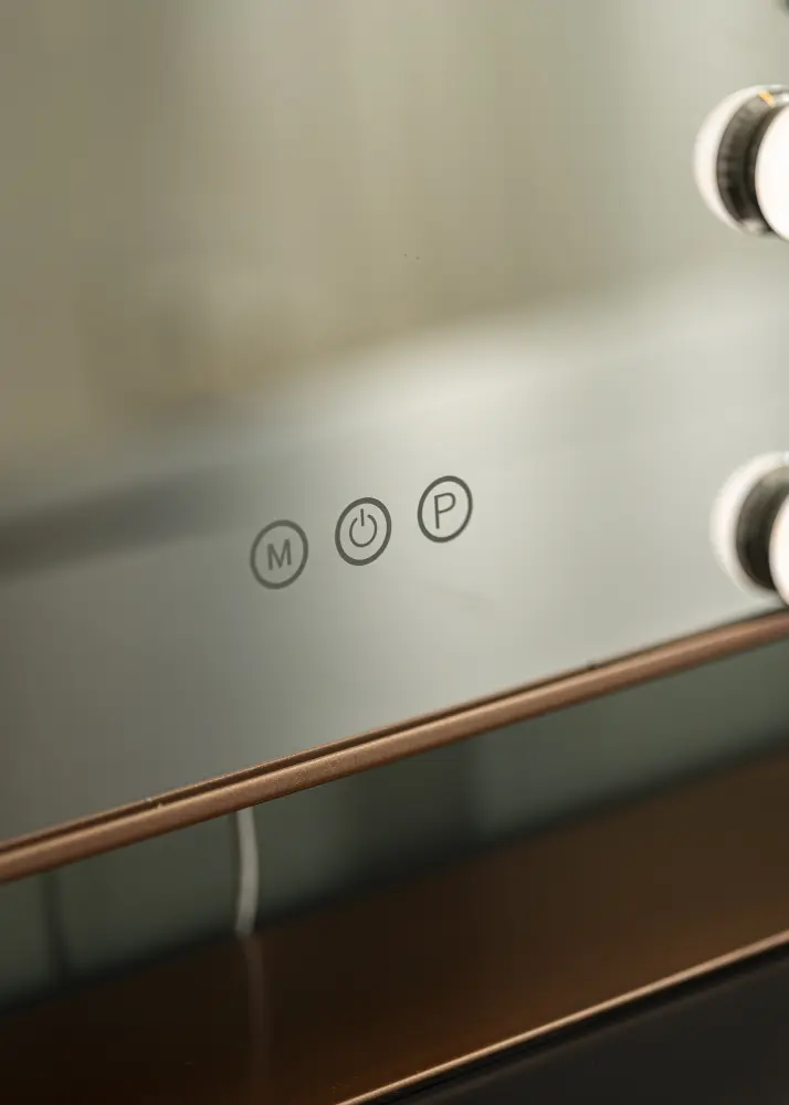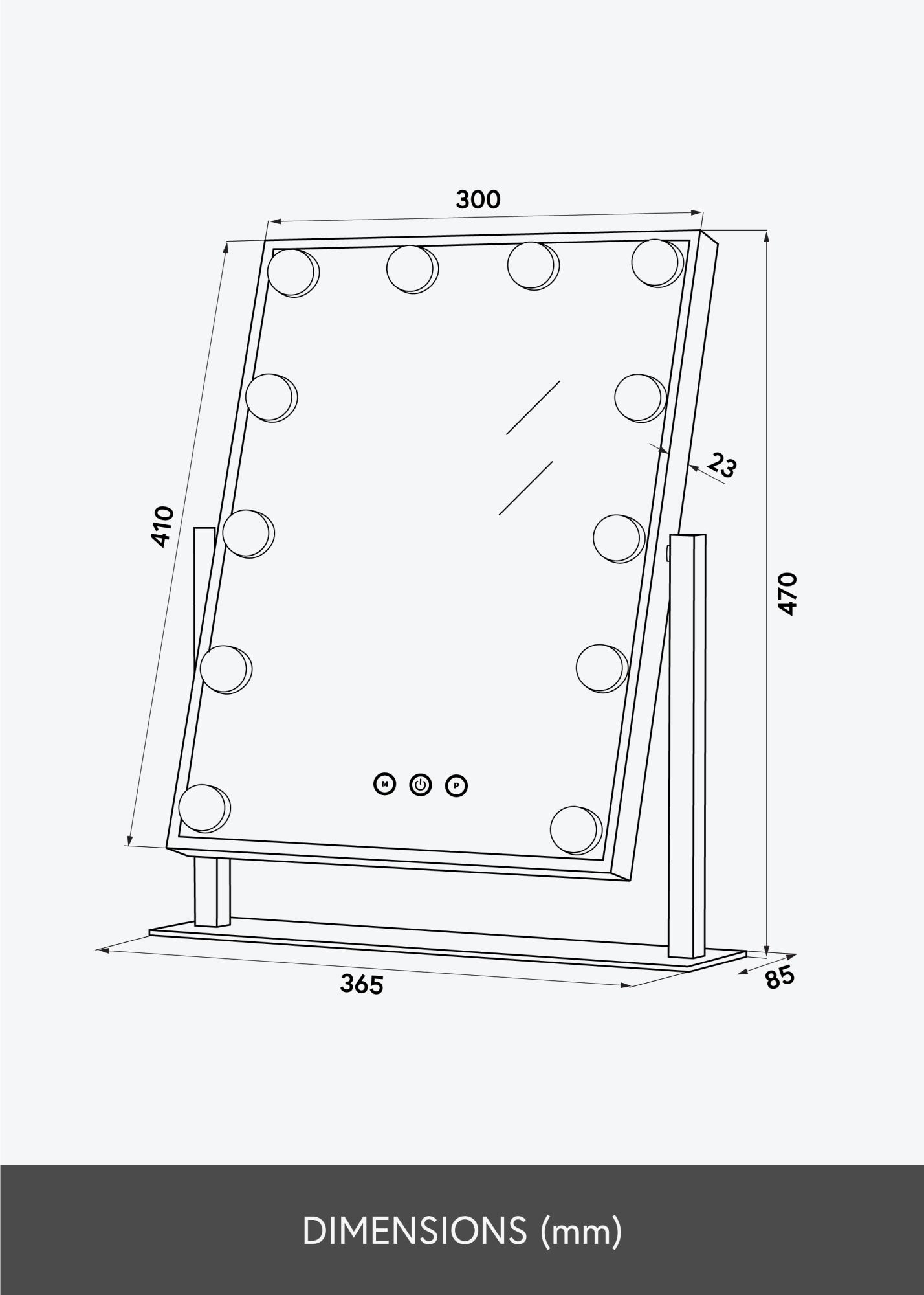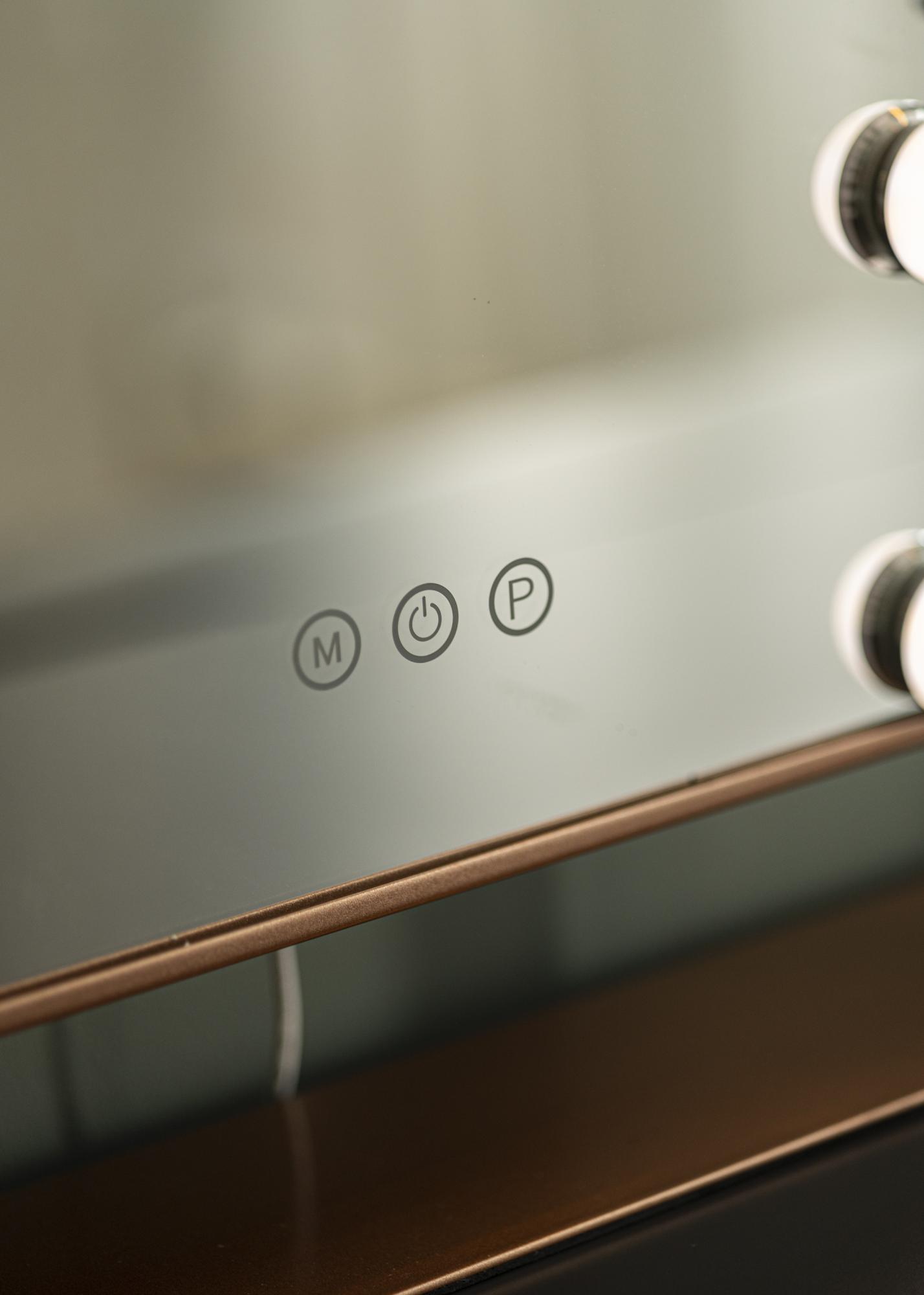 Ez a tükör LED világítással rendelkezik, formájában pedig 12 nagyobb lámpa gyönyörűen öleli körül a tükörfelületet. A tükröt az elülső érintőgombok egyikével lehet bekapcsolni. Van még érintőgomb is a fényerő és a színhőmérséklet beállításához. Az "M" betűvel jelölt gomb a színhőmérsékletet állítja be, a "P" betűvel jelölt gomb pedig a fényerőt. A tükör áramellátása dugós csatlakozással történik.