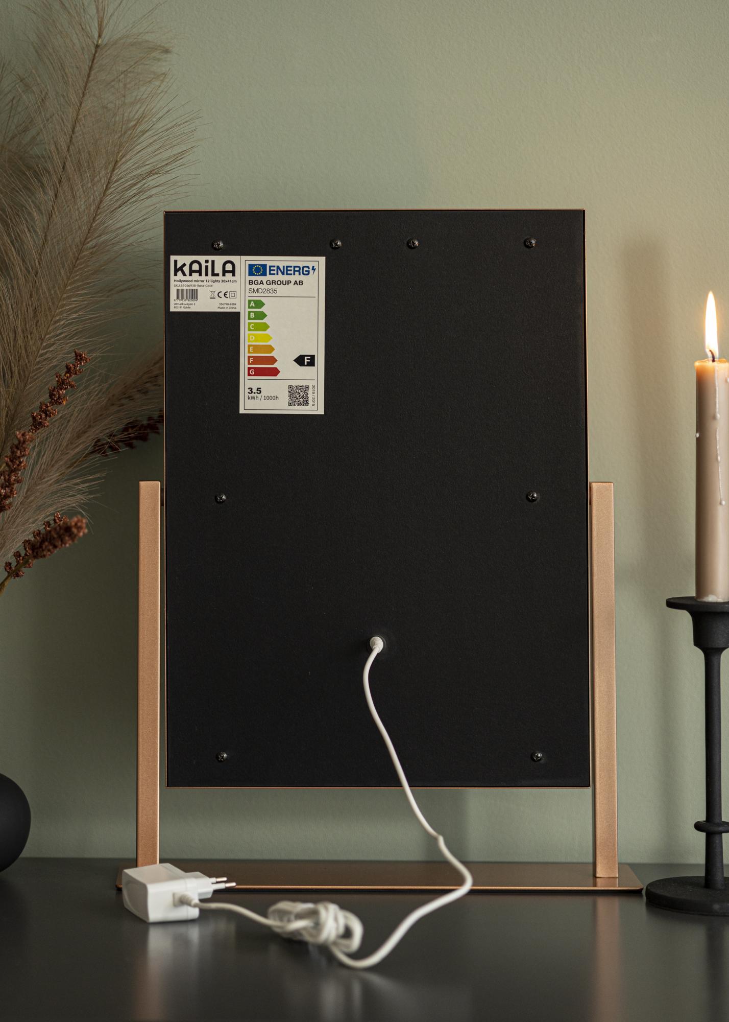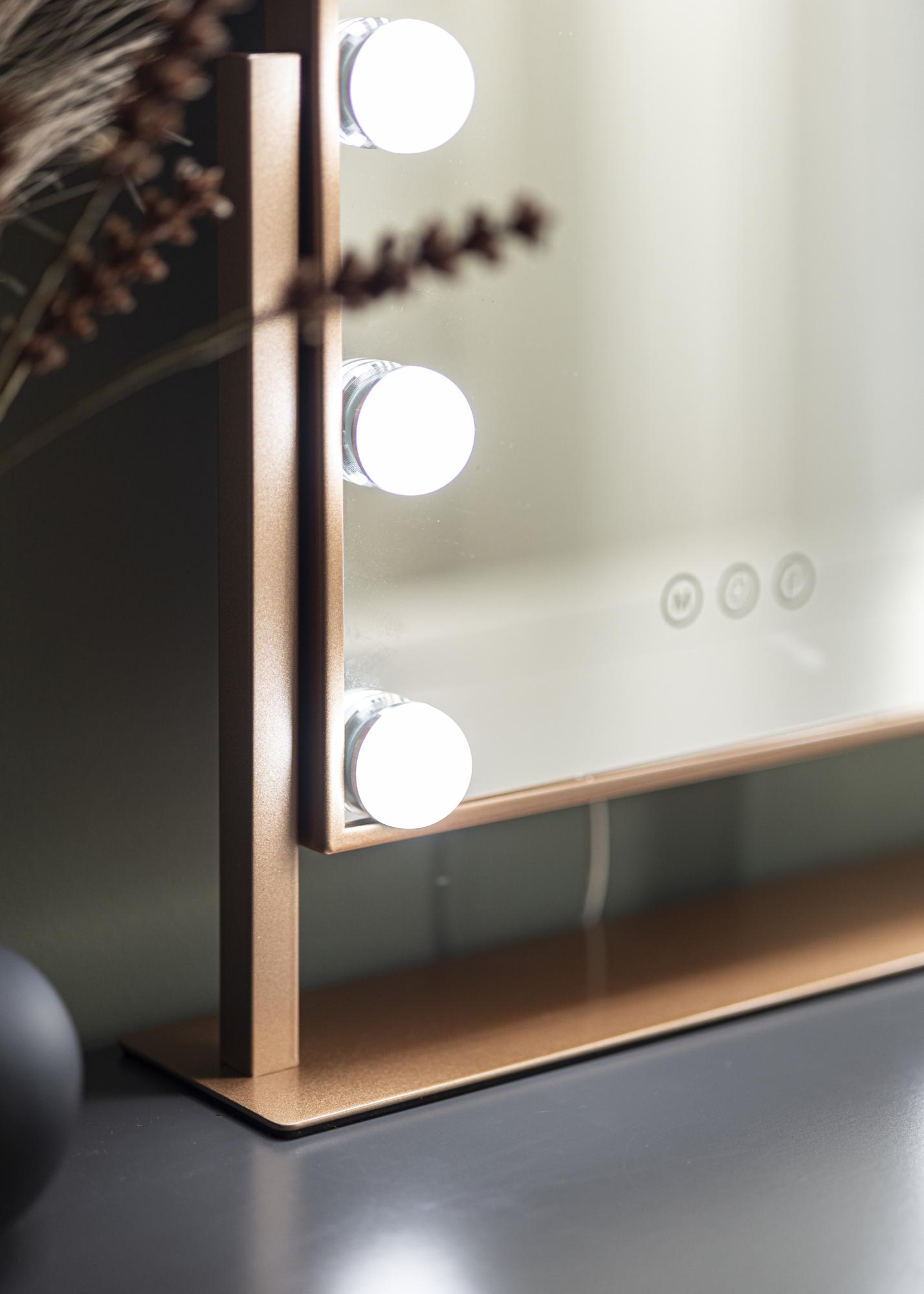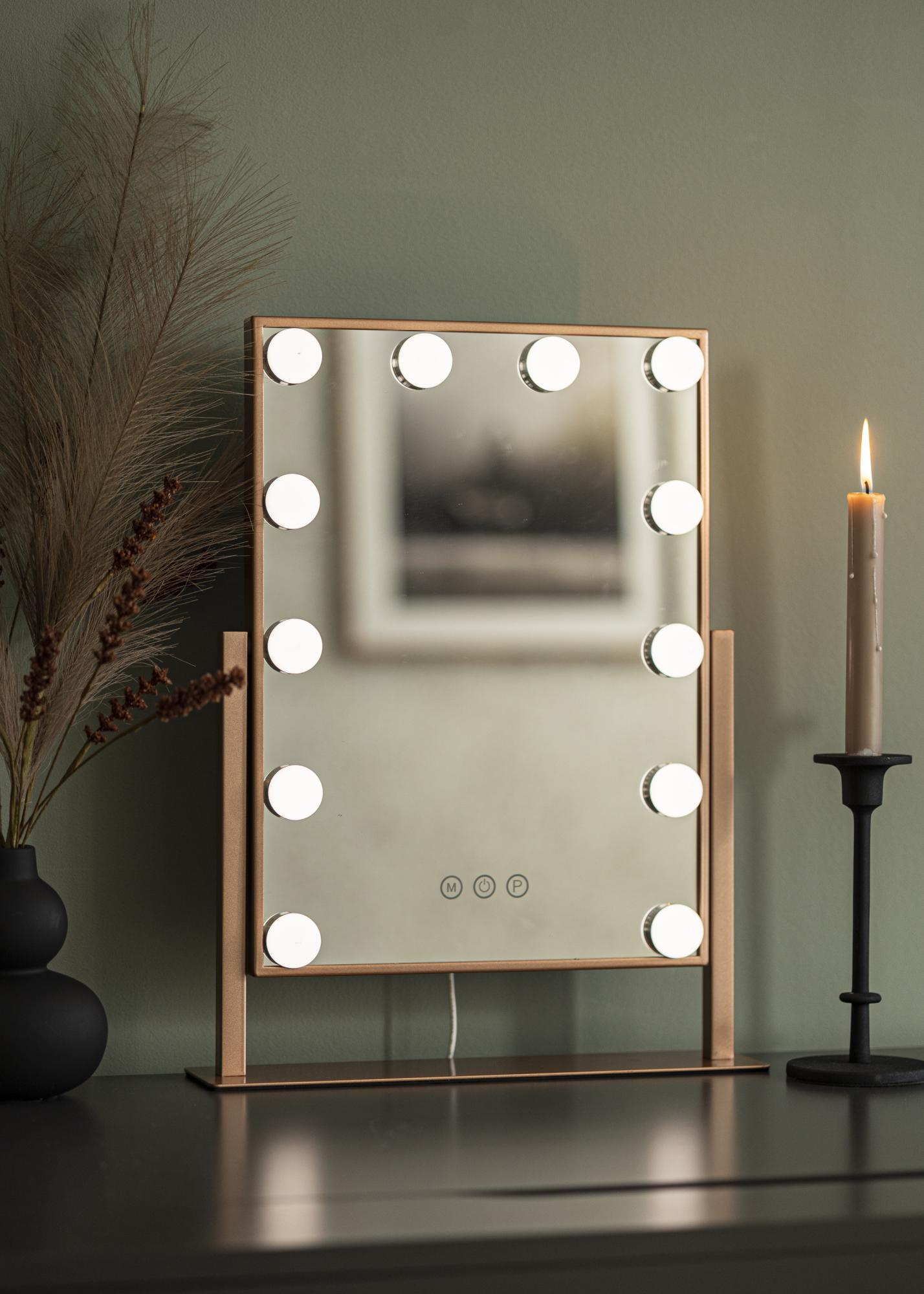 Ez egy karcsú sminktükör, 30x41 cm-es tükörfelülettel, integrált világítással és elegáns rózsaarany árnyalattal. A tükör stílusos talppal rendelkezik, így könnyen elhelyezhető a sminkasztalon, a tálalón vagy az oldalasztalon. Annak érdekében, hogy könnyebben sminkelhessen és alkalmazhassa sminkjét, a tükröt dönteni is lehet.