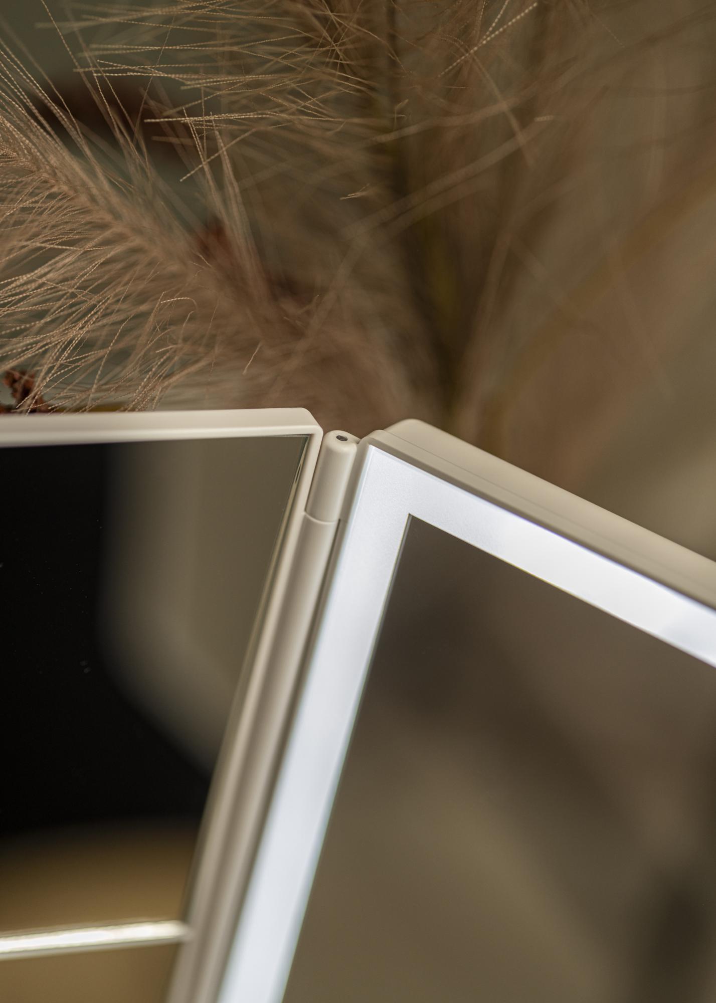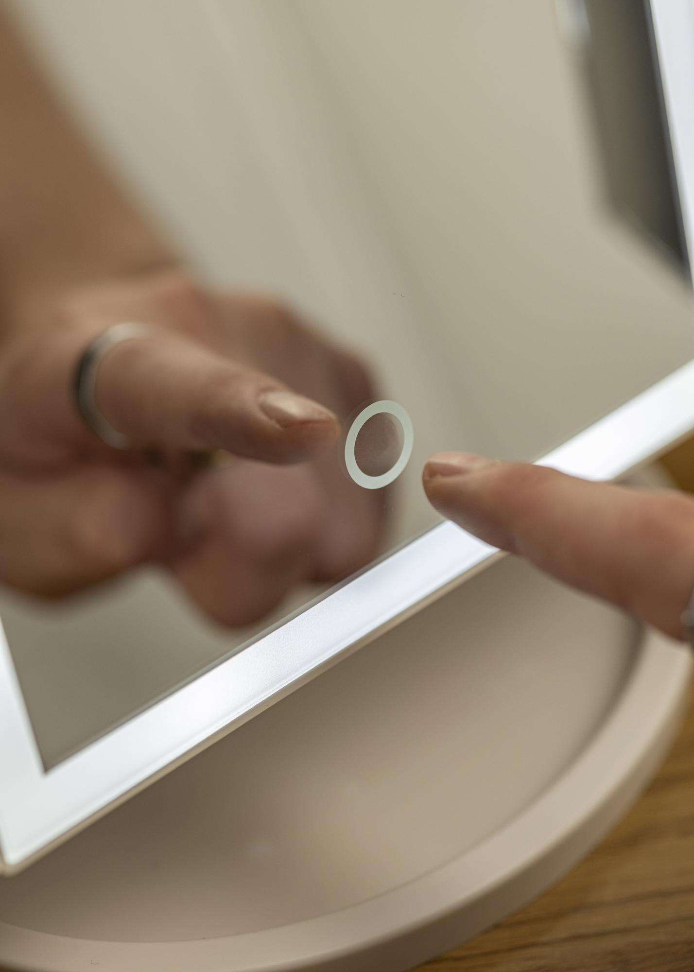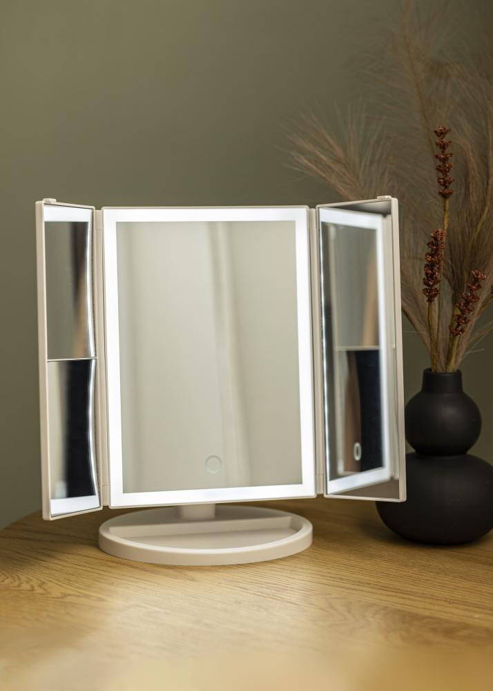 Egy divatos és elegáns sminktükör talpon, négy különböző tükörrel és szabályozható LED világítással. A sminktükör bal oldalán nagyító tükörüvegek találhatók 2x és 3x zoommal. Az integrált LED világítás szépen körvonalazza a középső nagyobb tükröt, és kellemes, meleg fehér fényt ad 3000K-en. Egyszerűen bekapcsolhatja a világítást az érintéskapcsoló megnyomásával a képernyőn, és könnyedén állíthatja a fény erősségét a gomb néhány másodpercig tartó nyomva tartásával. A tükör méretei 38x30 cm, és dönthető, ami lehetővé teszi, hogy különböző szögekből nézhesse magát.