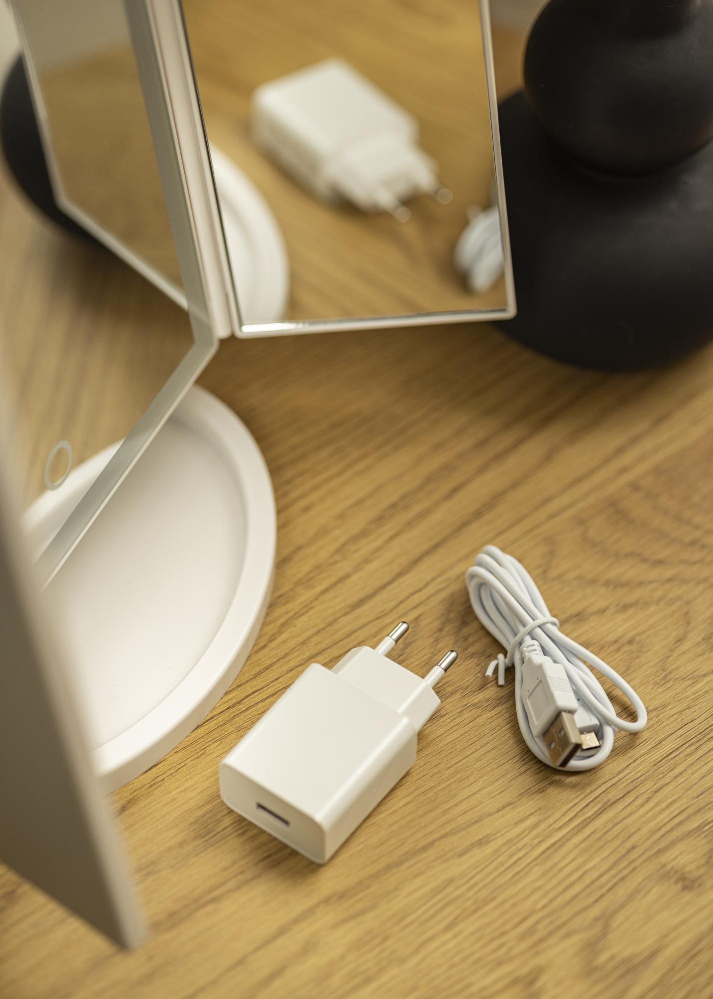 A tükröt 4x AA elemmel működtethetjük (nem tartozék) vagy tölthetjük a mellékelt USB fali adapterrel és USB kábellel.