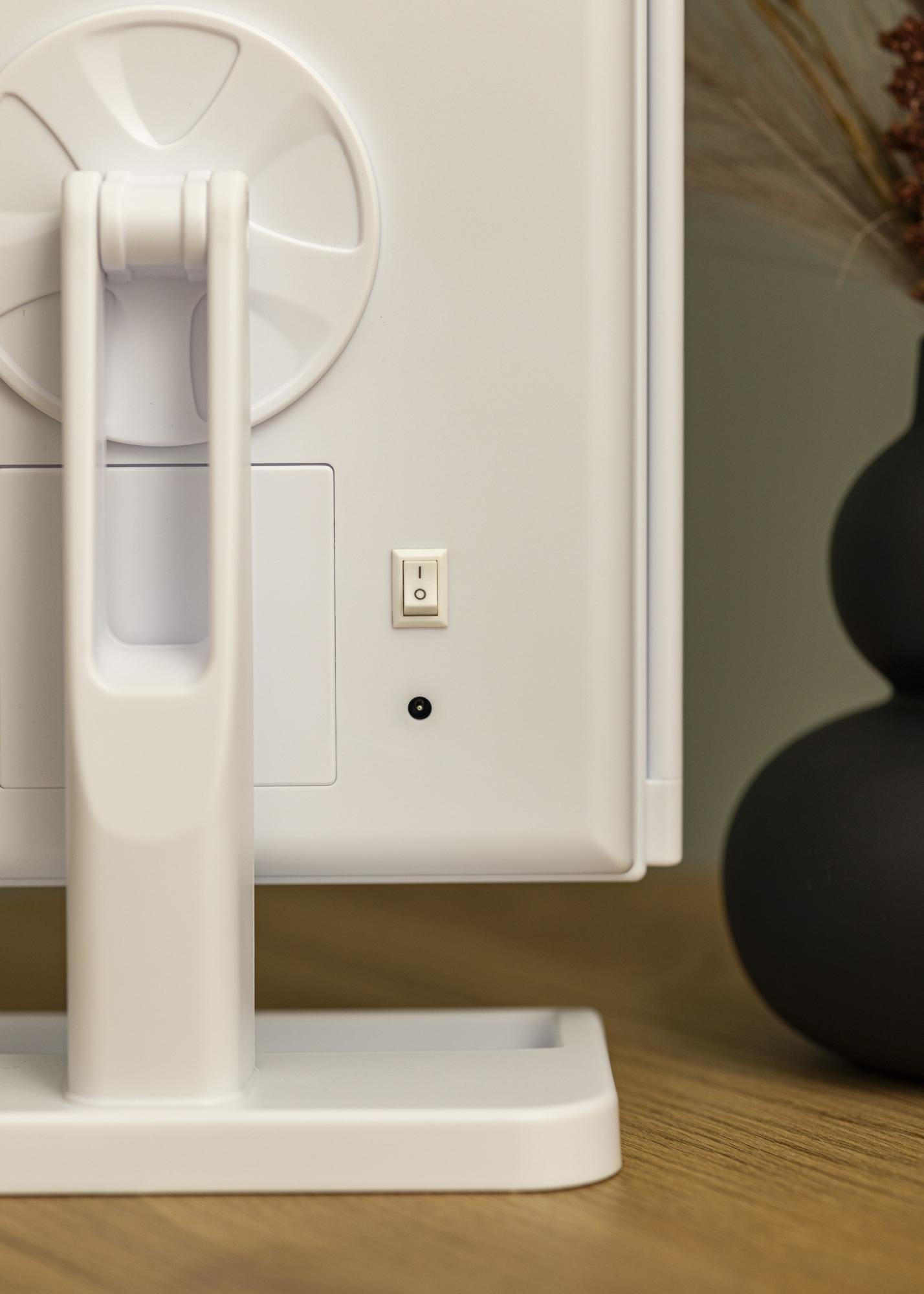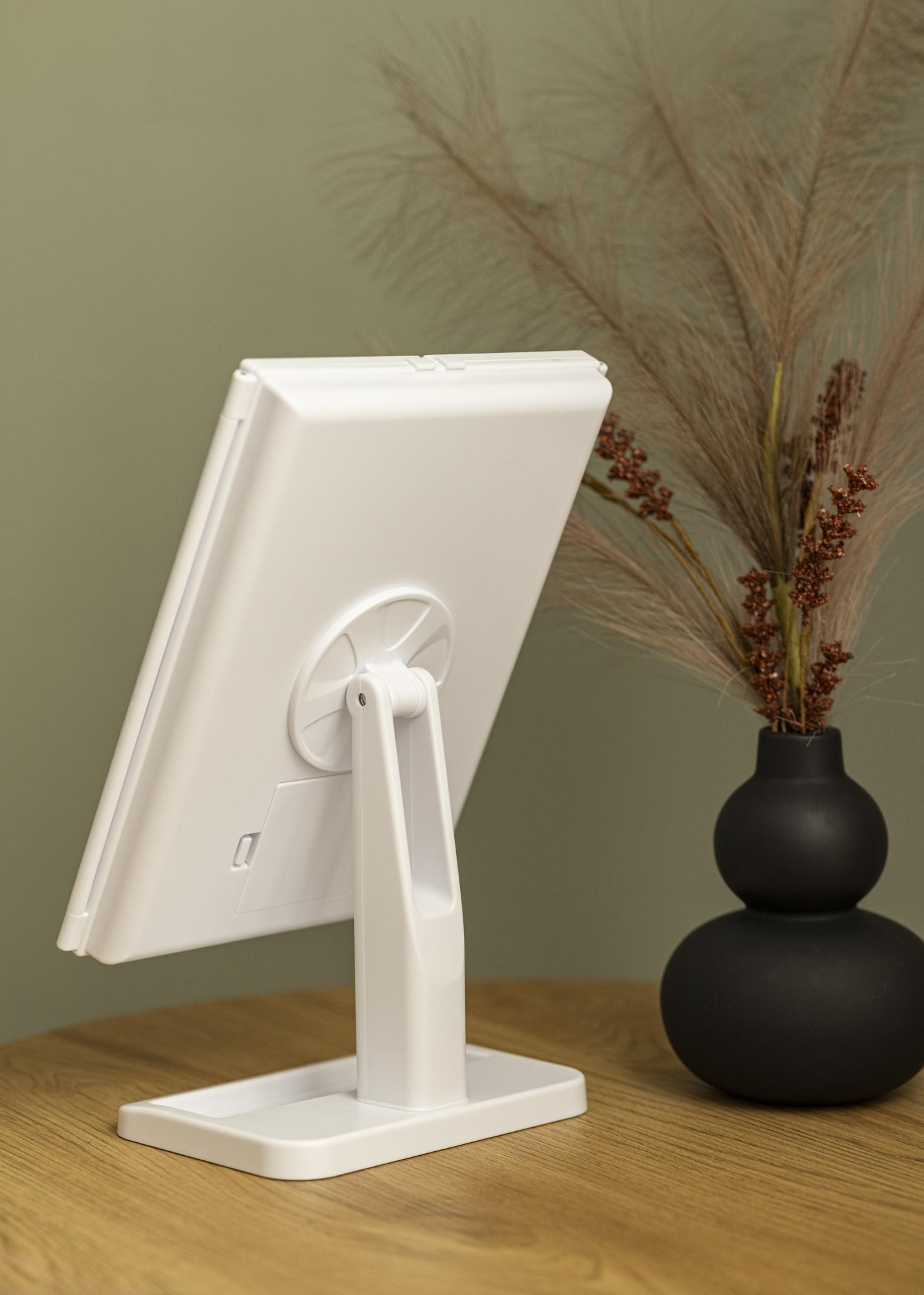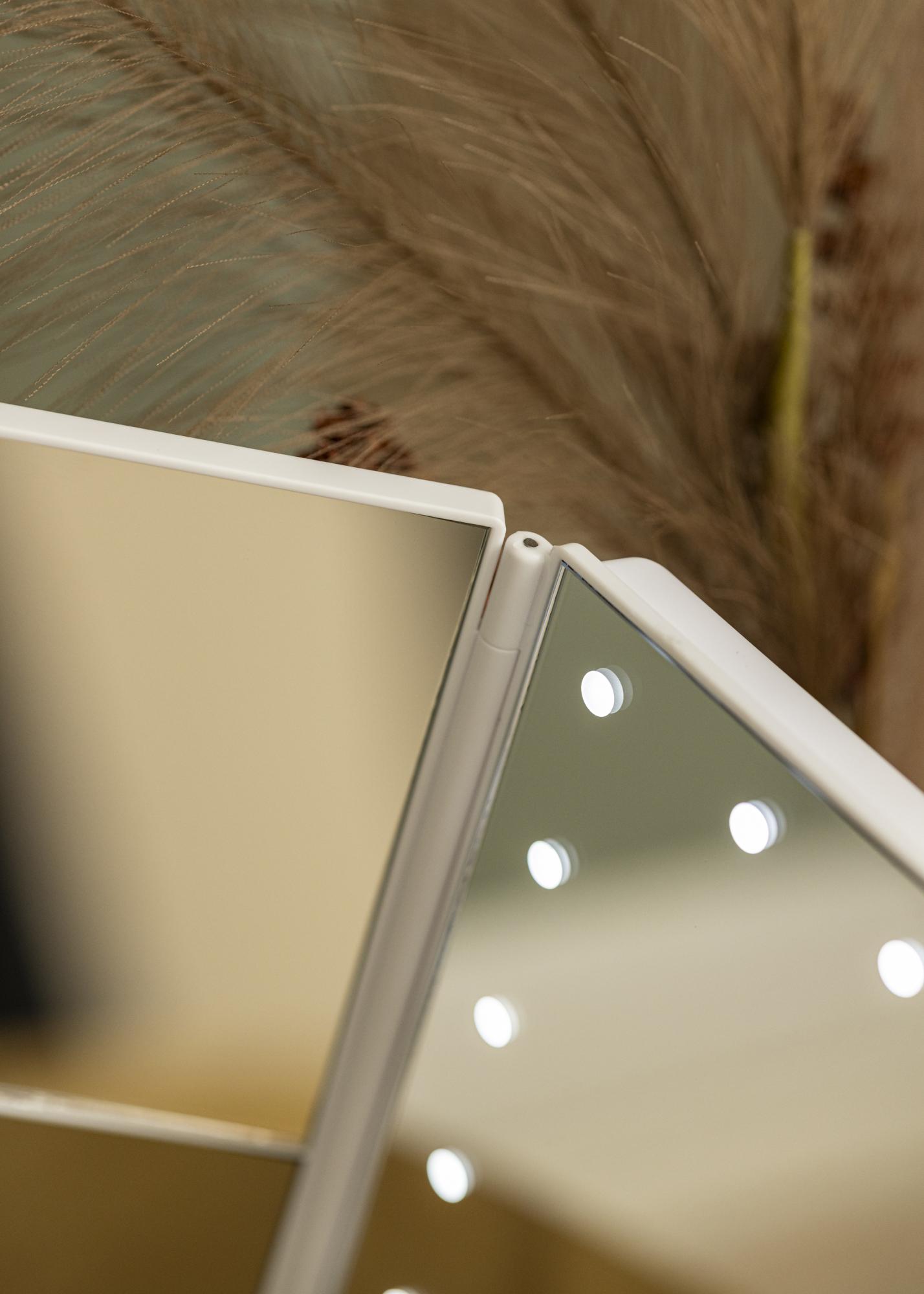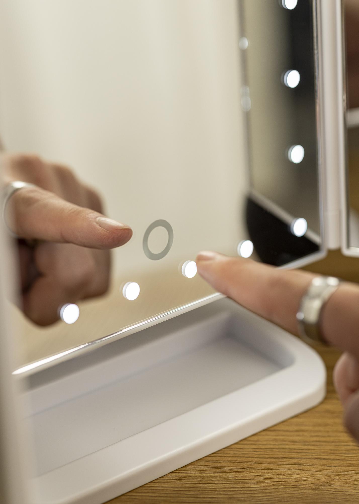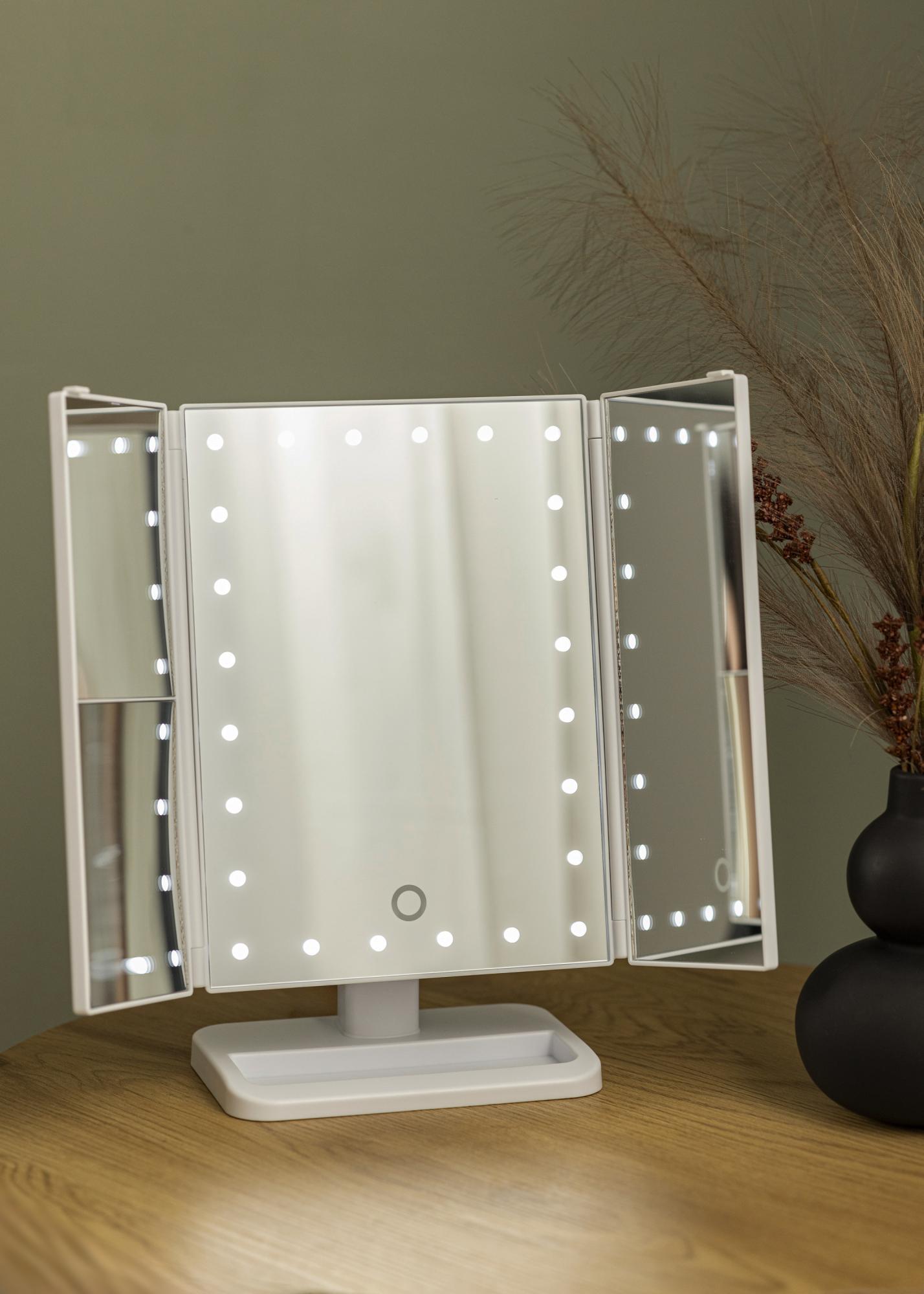 Egy elegáns fehér 4 az 1-ben sminktükör svéd dizájnnal a KAILA-tól. Ez a sminktükör lehetőséget nyújt arra, hogy különböző szögekből nézd magad, három tükörfelülettel, és állítható talppal rendelkezik, amely lehetővé teszi, hogy a tükör 180°-ban elfordítható legyen. A sminktükör bal oldalán 2X és 3X nagyító tükörüveg található. A középső nagy tükörfelület körül 24 dekoratív LED-lámpa található, amelyek kellemes meleg fehér fényt adnak 3000K hőmérsékleten. Az integrált LED világítást úgy lehet bekapcsolni, hogy megnyomod az érintőgombot, és egyszerűen állítható néhány másodpercig tartó gombnyomással. A sminktükör mérete 38x25 cm, és könnyen összecsukható, ha nincs használatban.