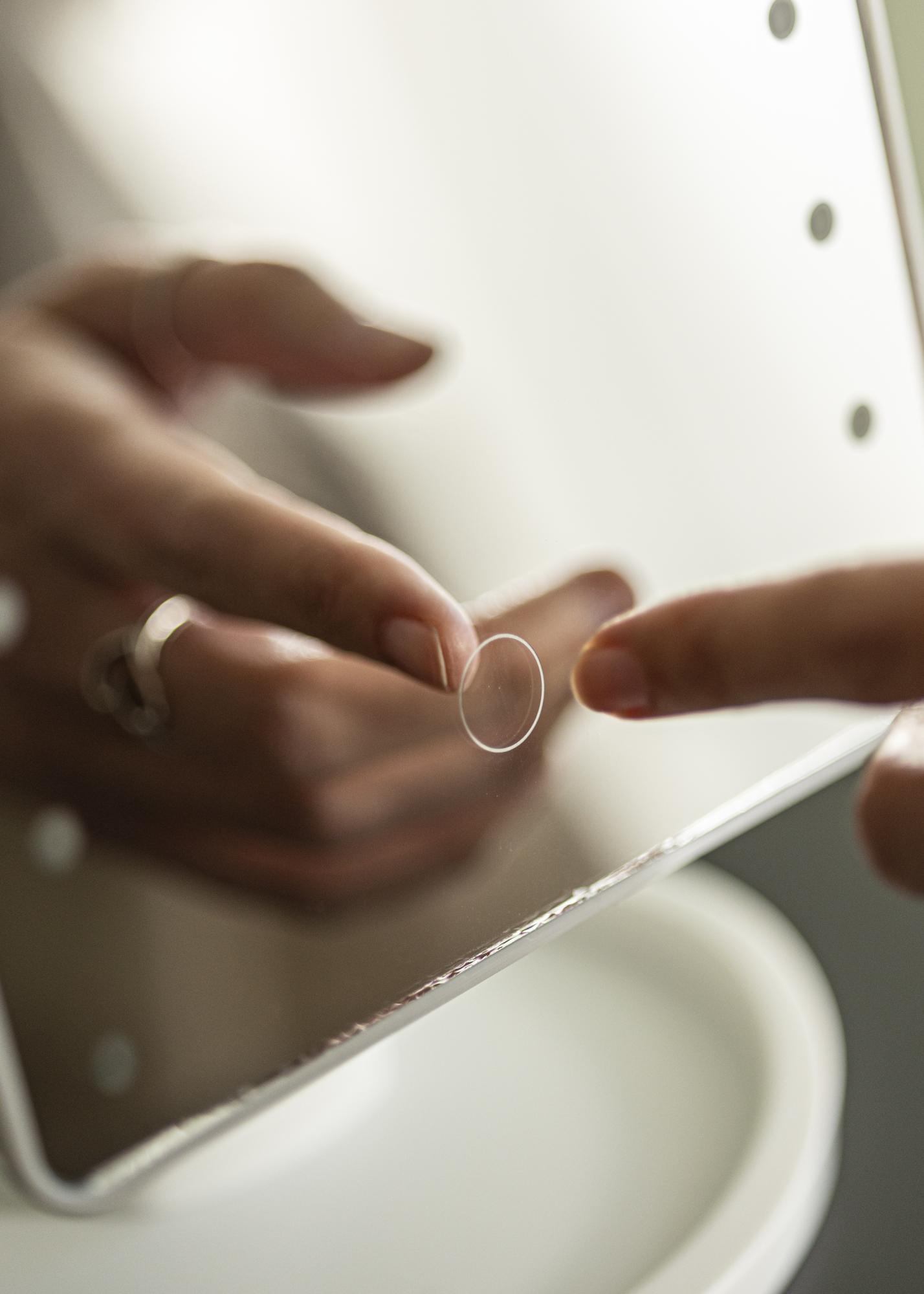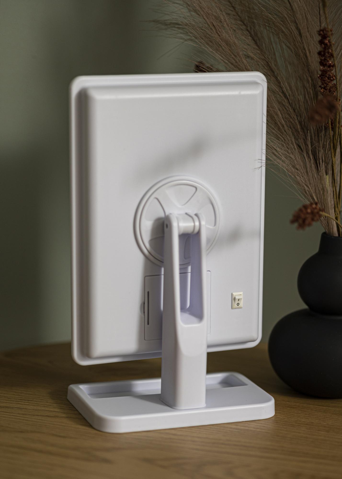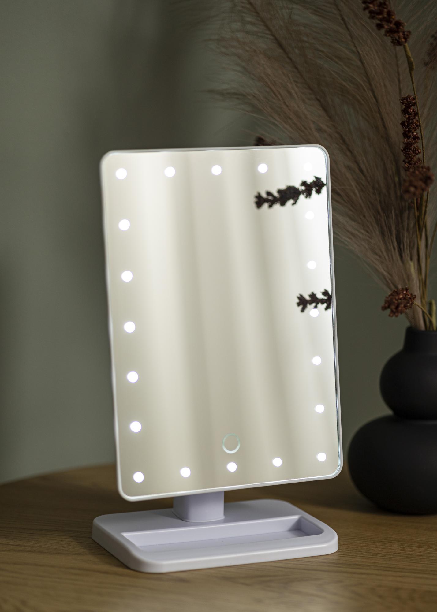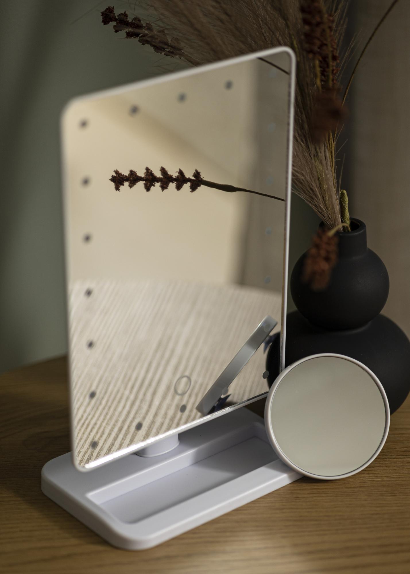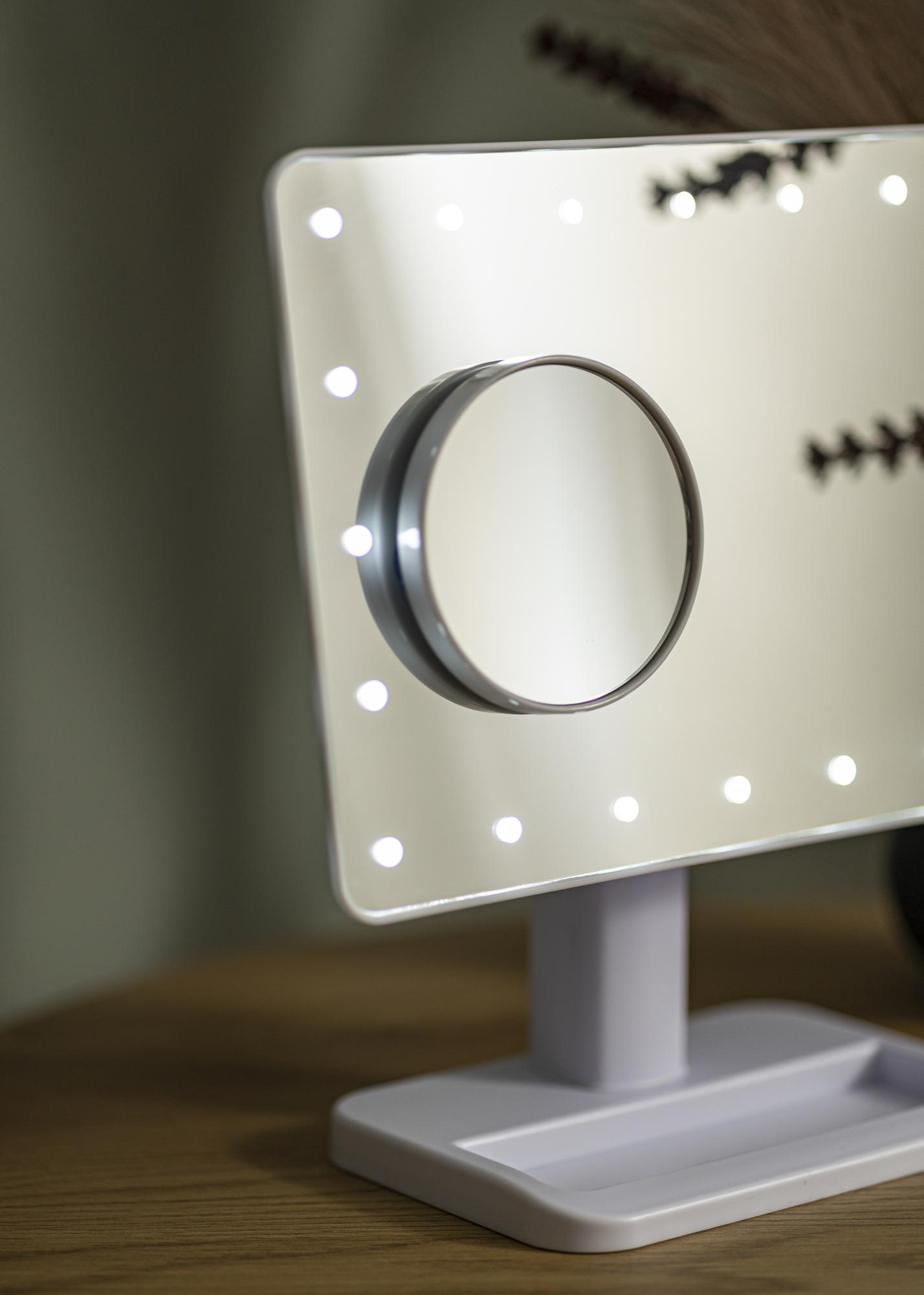 A tükörfelületet LED-világítás keretezi, amely egyenletes fényt biztosít sminkfelvitelkor. A LED-világítás nagyon előnyös fényforrás, mivel energiatakarékos és hosszú élettartamú. A tükröt a hátoldalon található gombbal kapcsolhatja be, majd lehetősége van a fényerő szabályozására igény szerint. Ezt úgy teheti meg, hogy néhány másodpercig lenyomva tartja az érintőgombot a tükör elülső oldalán. A tükör táplálása 4x AA elemmel történik, amelyeket külön kell megvásárolni.