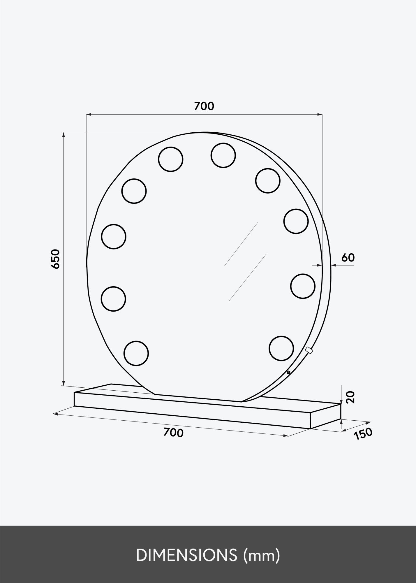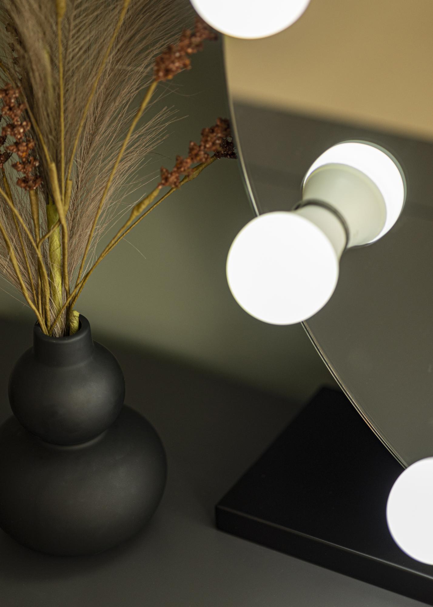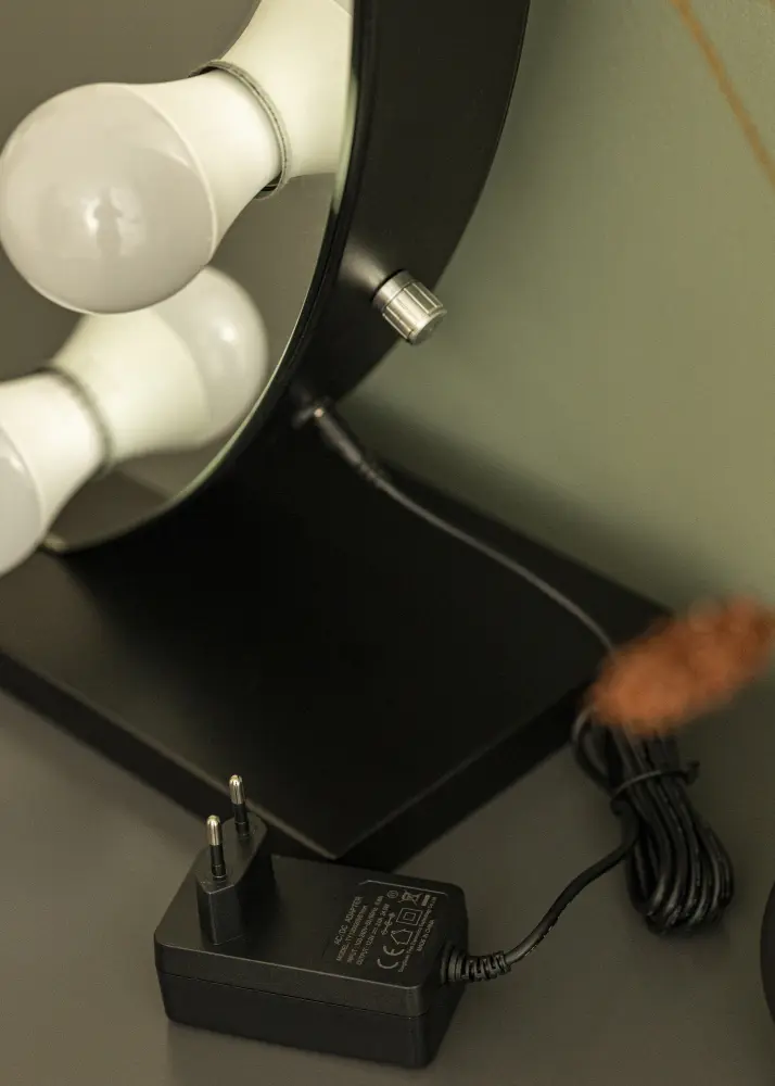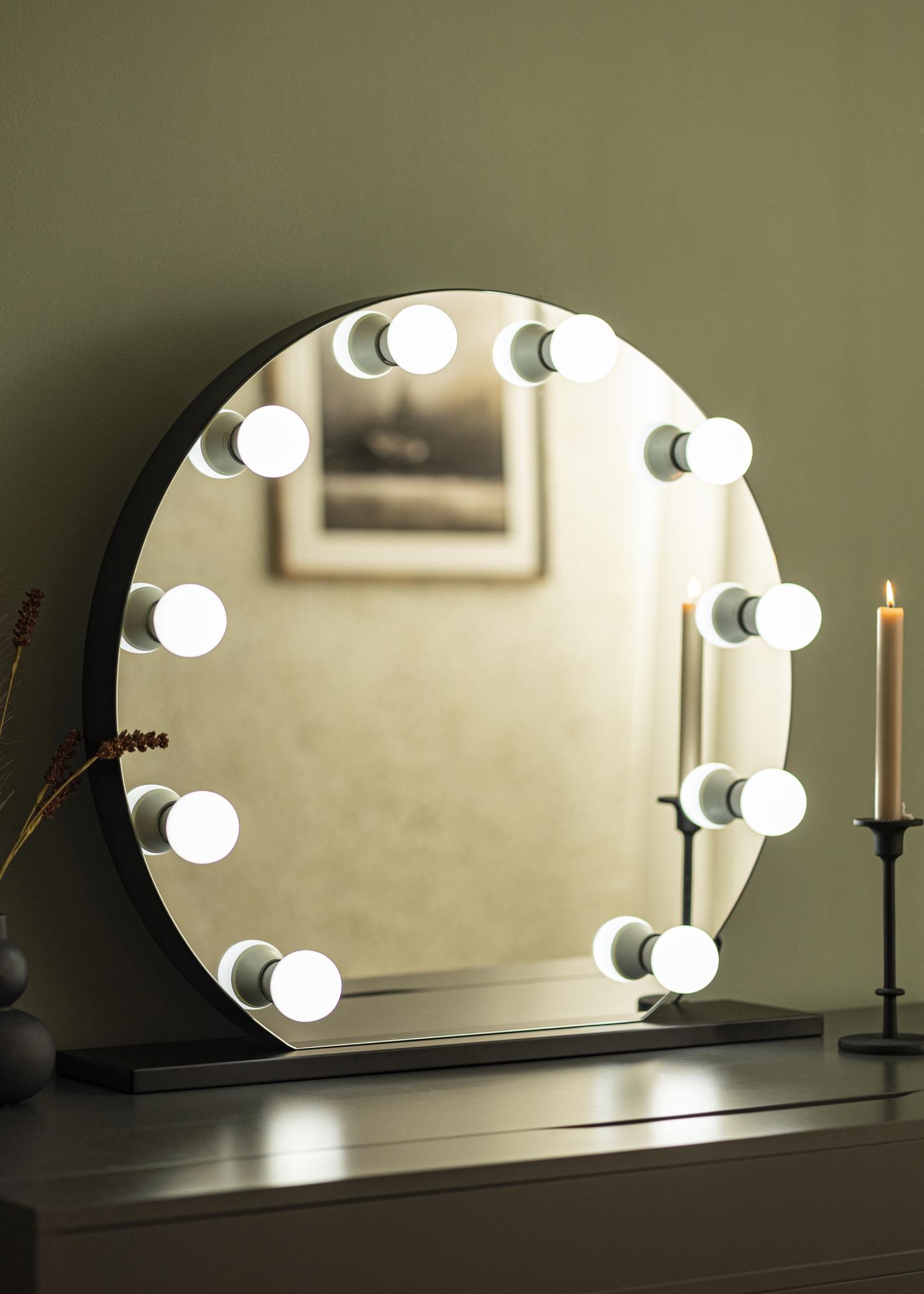Ez a dekoratív sminktükör stílust és funkciót kínál egy csomagban! Stílusos kialakítással rendelkezik, kerek formával, elegáns fekete talppal és 10 E27-es foglalatú izzóval, amelyek szépen keretezik a tükörfelületet. A beépített világítás hideg fehér fénye tökéletes, amikor készülődsz a napra. A tükör állítva is elhelyezhető, így könnyen elhelyezheted a hálószobában, nappaliban vagy előszobában, ahol a sminktükör világítása szép háttérvilágításként is szolgálhat. A tükör a falra is felszerelhető. A világítás fényereje állítható, hogy a világítást beállítsd, fordítsd el a gombot, amely a tükör rövid oldalán található.