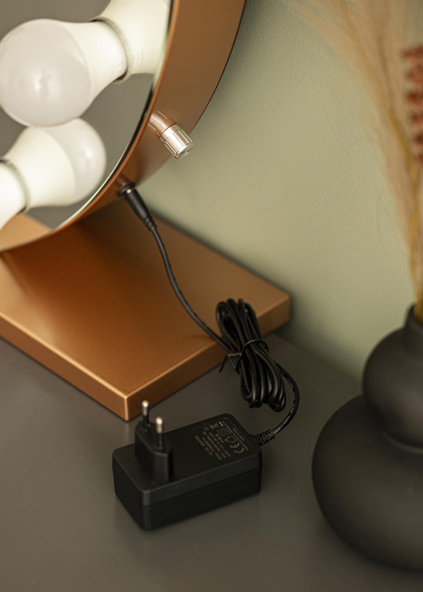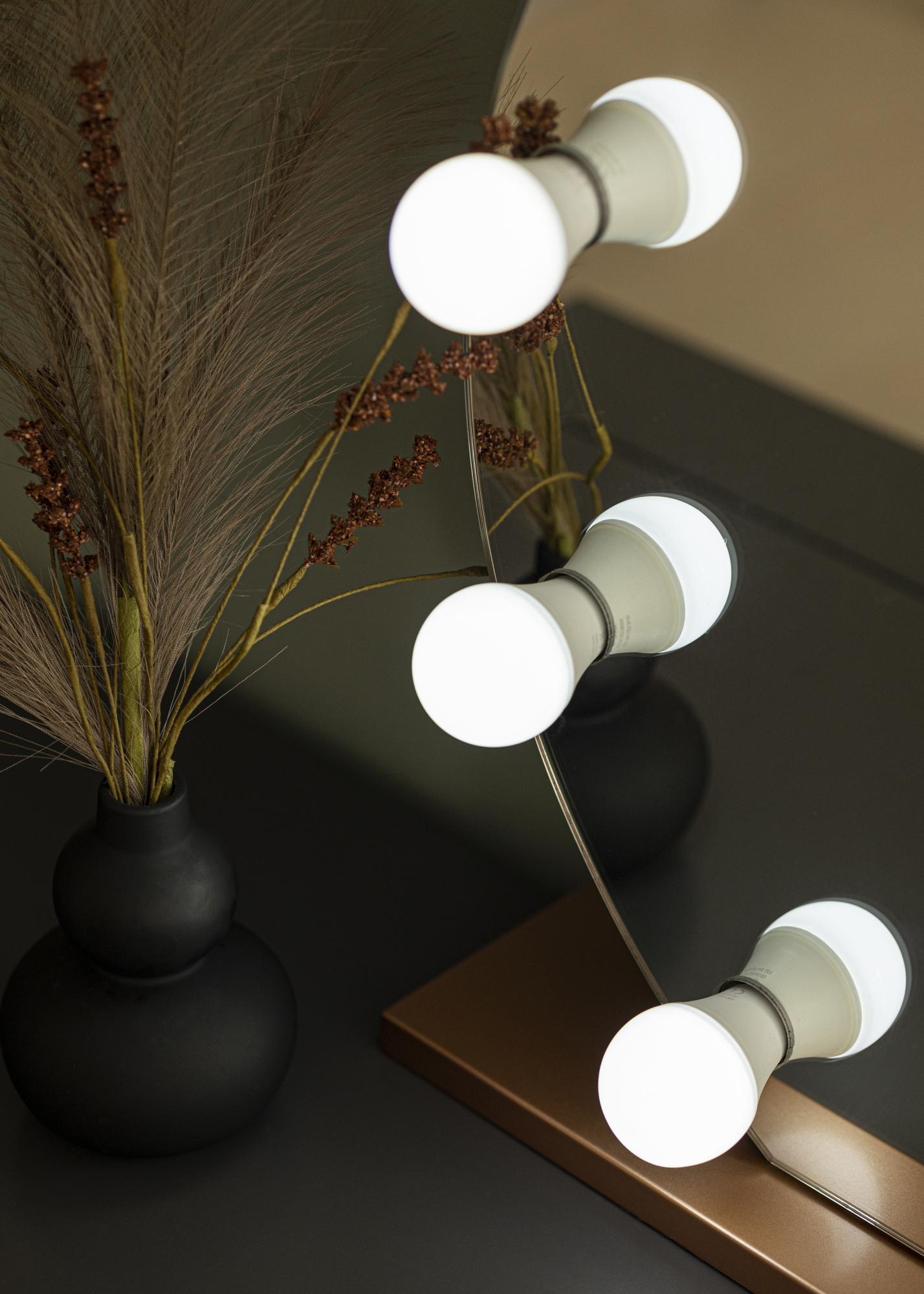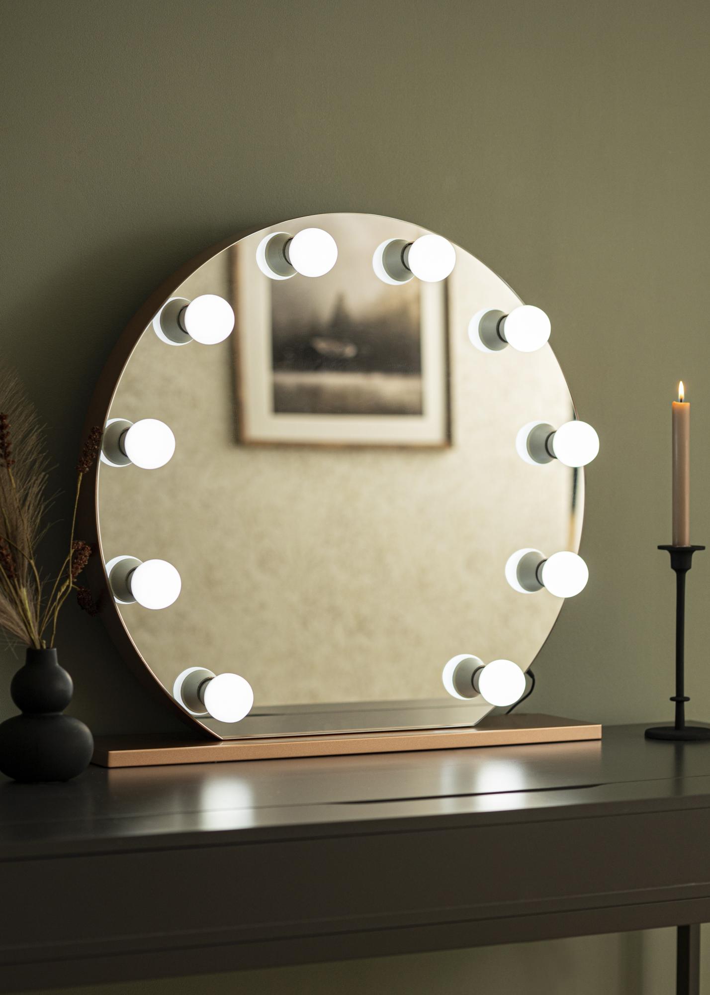 Hadd, hogy ez a rózsaarany sminktükör aranyfénnyel ragyogjon a szobádban. A tükör 10 izzólámpája, amelyek keretként helyezkednek el a tükörfelület körül, fehér, hideg és egyenletes fényt biztosítanak. Az izzólámpák E27-es foglalattal rendelkeznek és cserélhetők. Az okos fényerő-szabályozási funkciónak köszönhetően a fény erősségét az igényeid szerint állíthatod be. Mindössze annyit kell tenned, hogy elfordítod a gombot a tükör egyik rövid oldalán.
