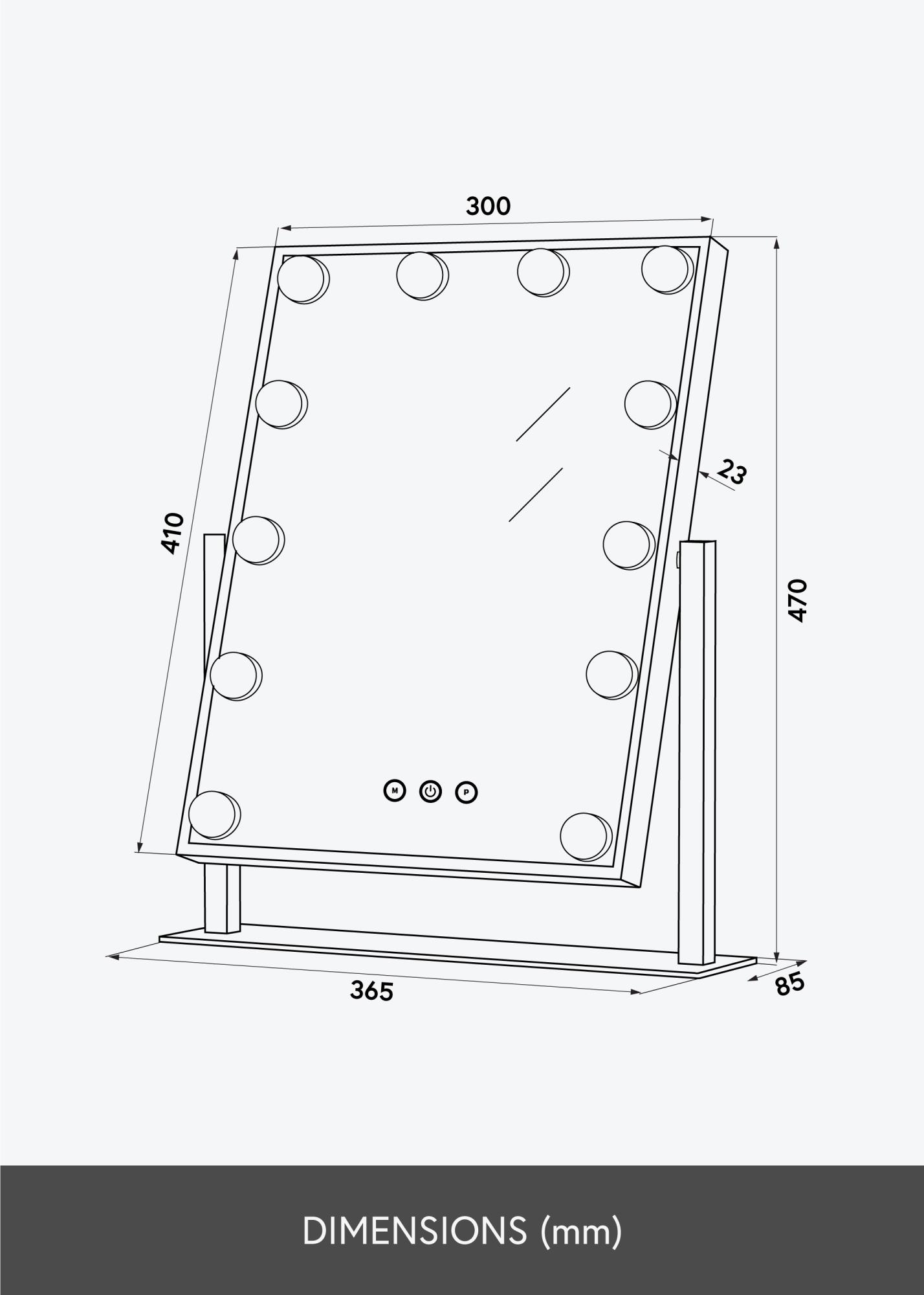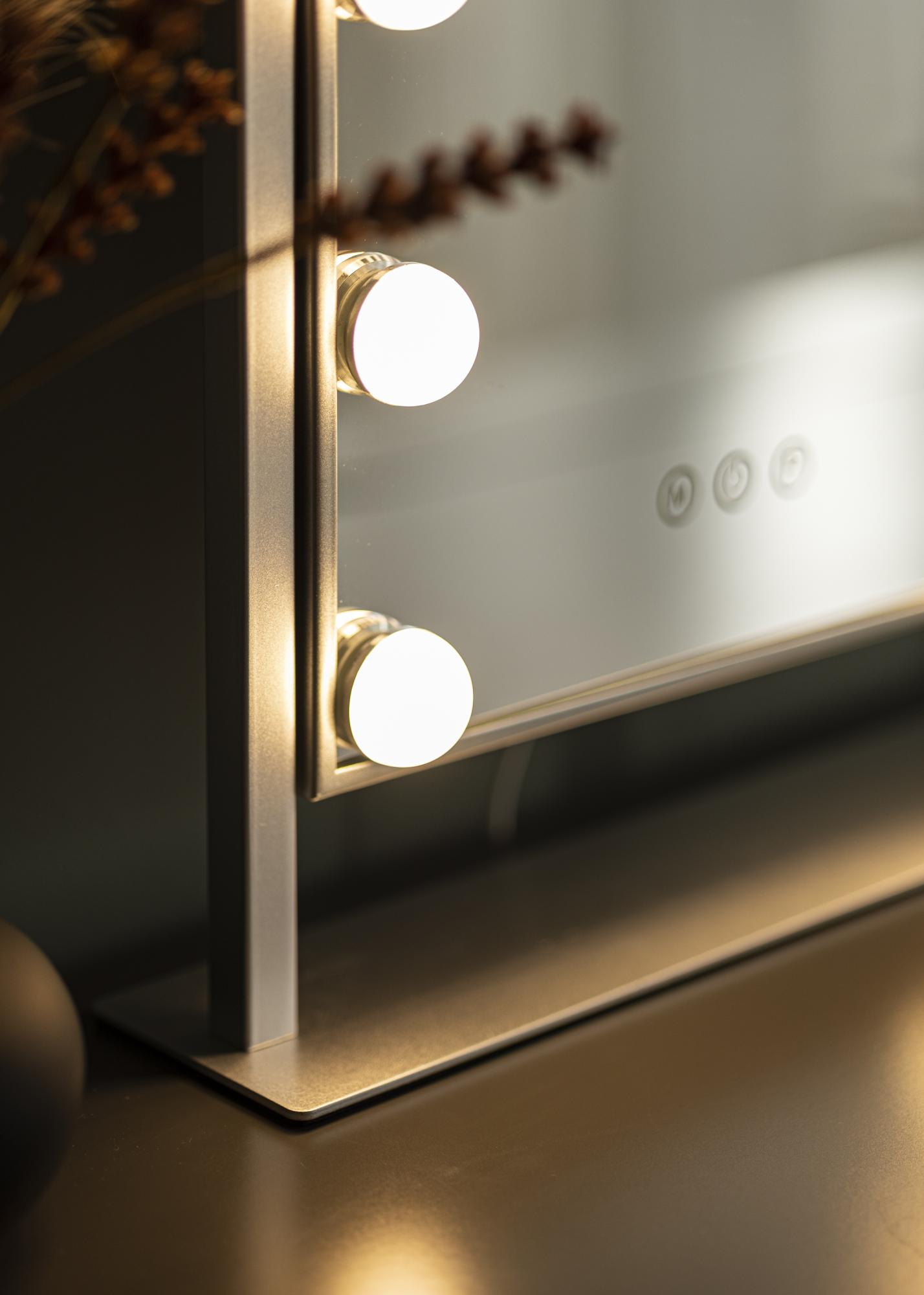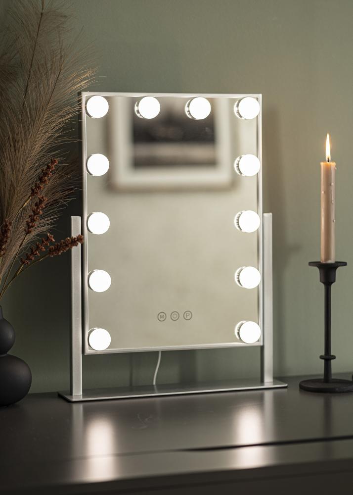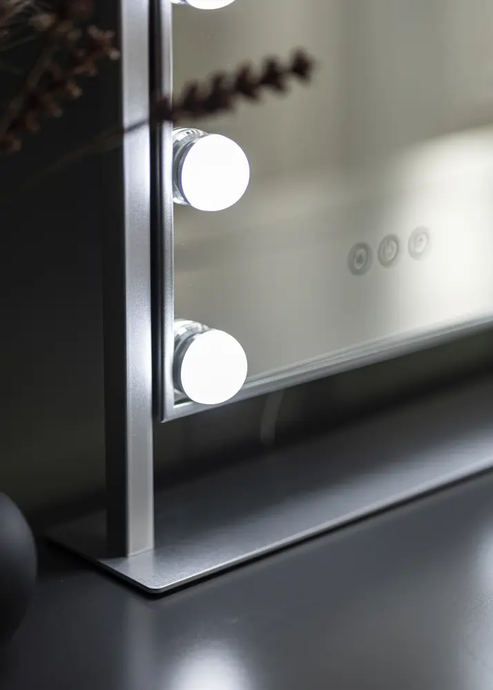 Egy luxus sminktükör beépített világítással lehetővé teszi, hogy kellemesebb módon készülődjön a napra. Ez az ezüstszínű tükör 12 LED-lámpa formájában kialakított világítással rendelkezik, amelyek bekeretezik a tükörfelületet, stílusos minimalizmus és hollywoodi glamour keverékét adva a tükör megjelenésének. A tükör világítása továbbá állítható, és lehetősége van a színhőmérséklet és a fényerő szabályzására is. Ezt a tükör elülső részén található érintőgombok segítségével teheti meg, ahol az "M" gomb a színhőmérsékletet állítja be, míg a "P" gomb a fényerőt szabályozza. Ugyancsak érintőgombbal kapcsolhatja be és ki a tükör világítását.