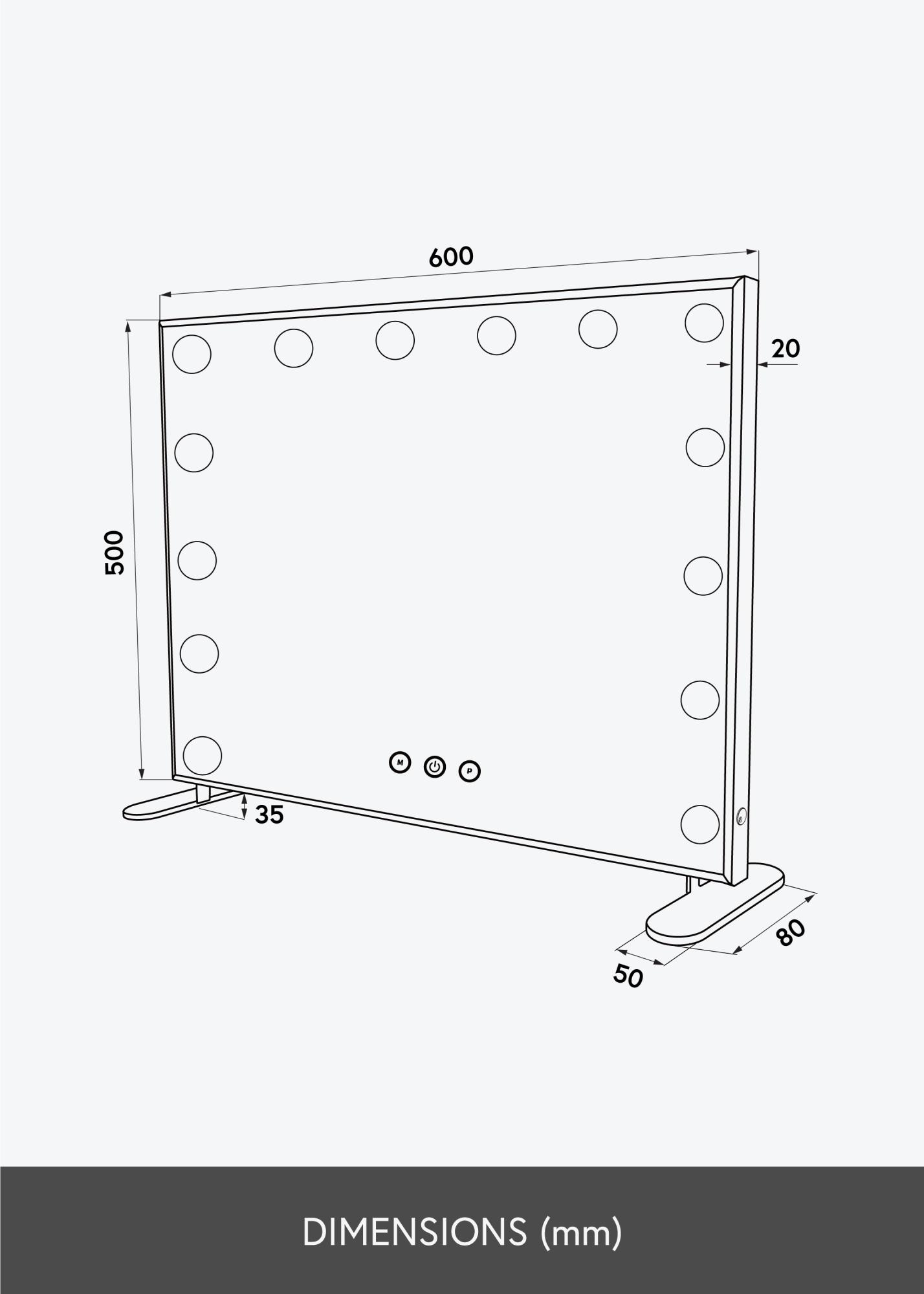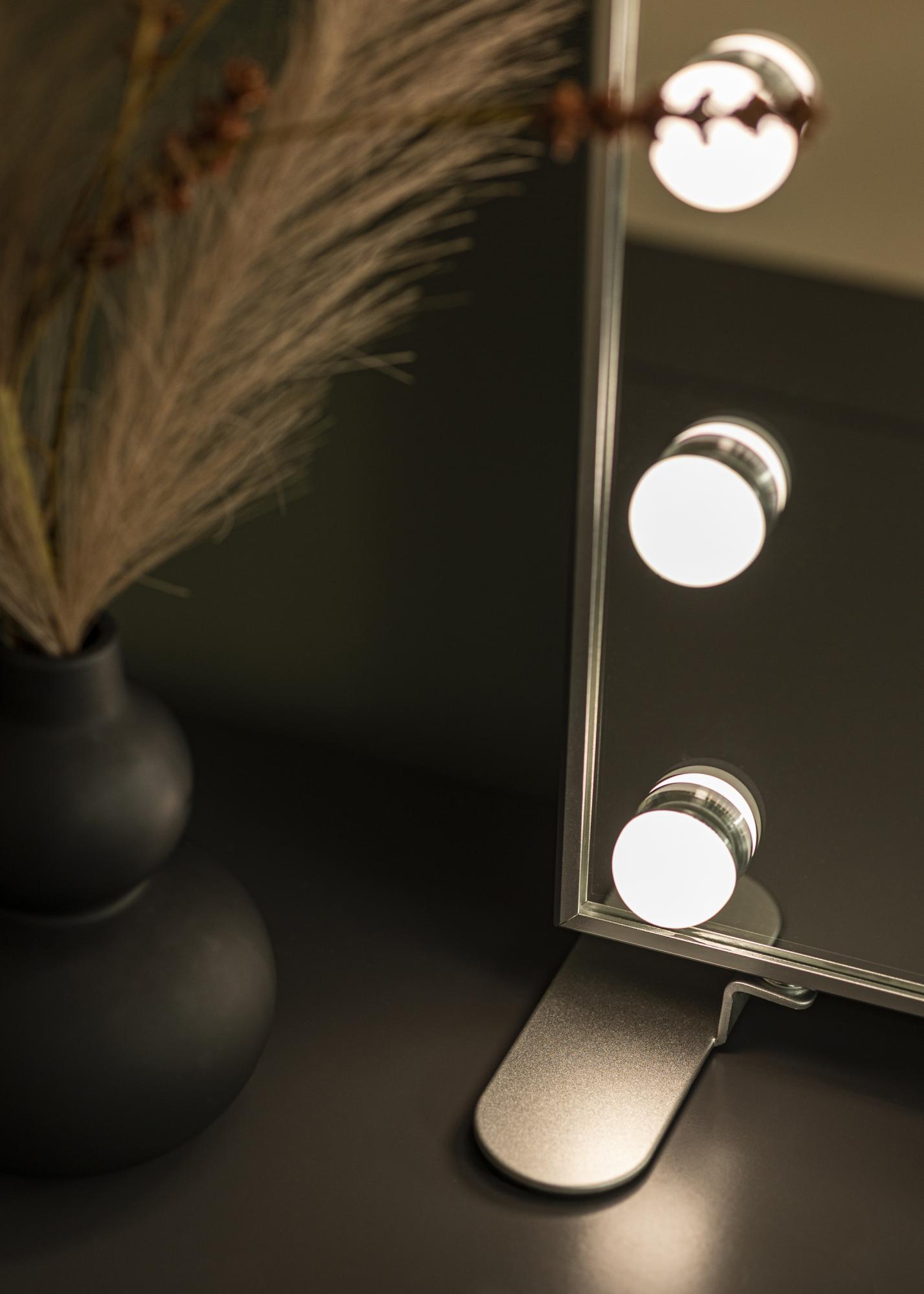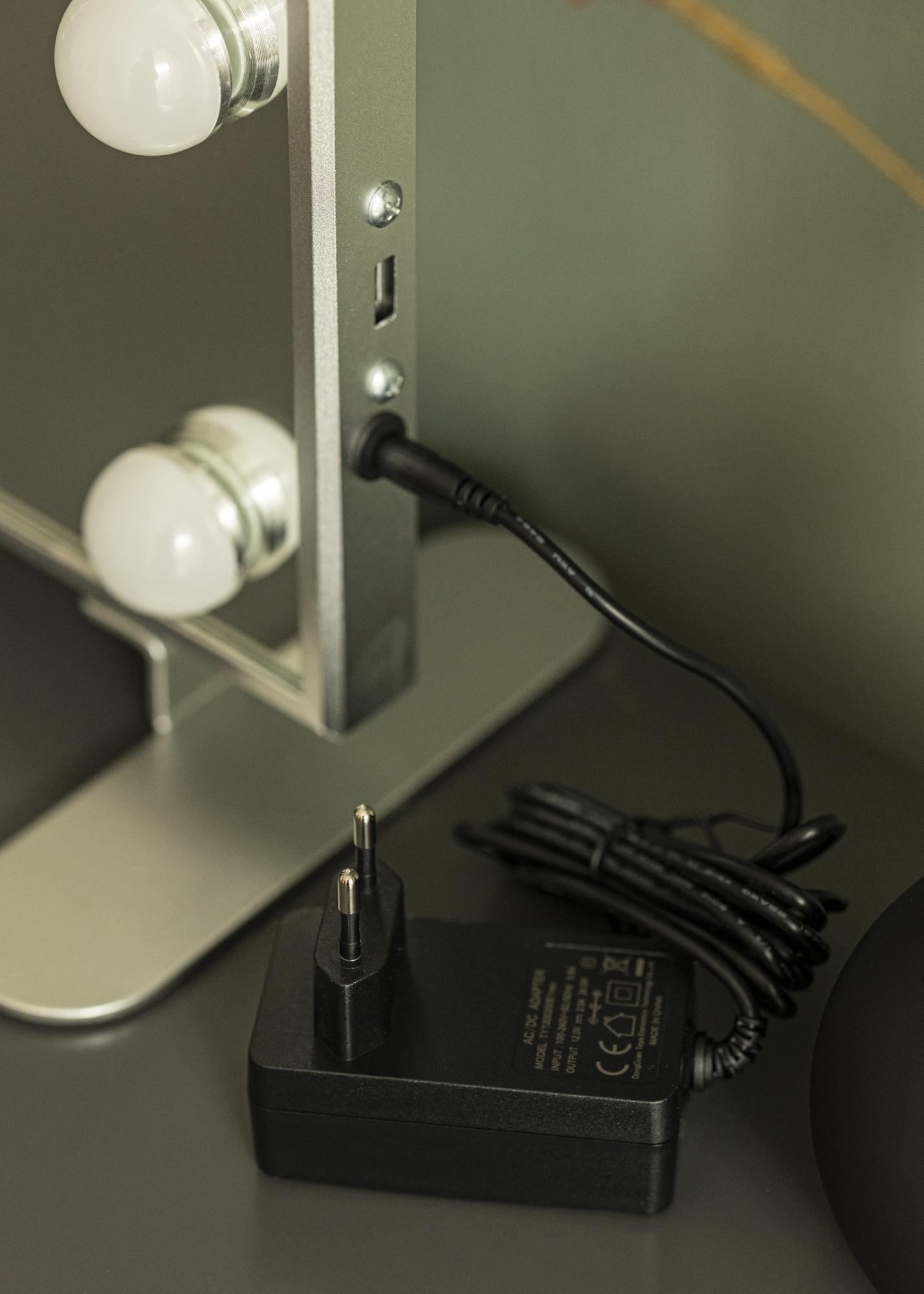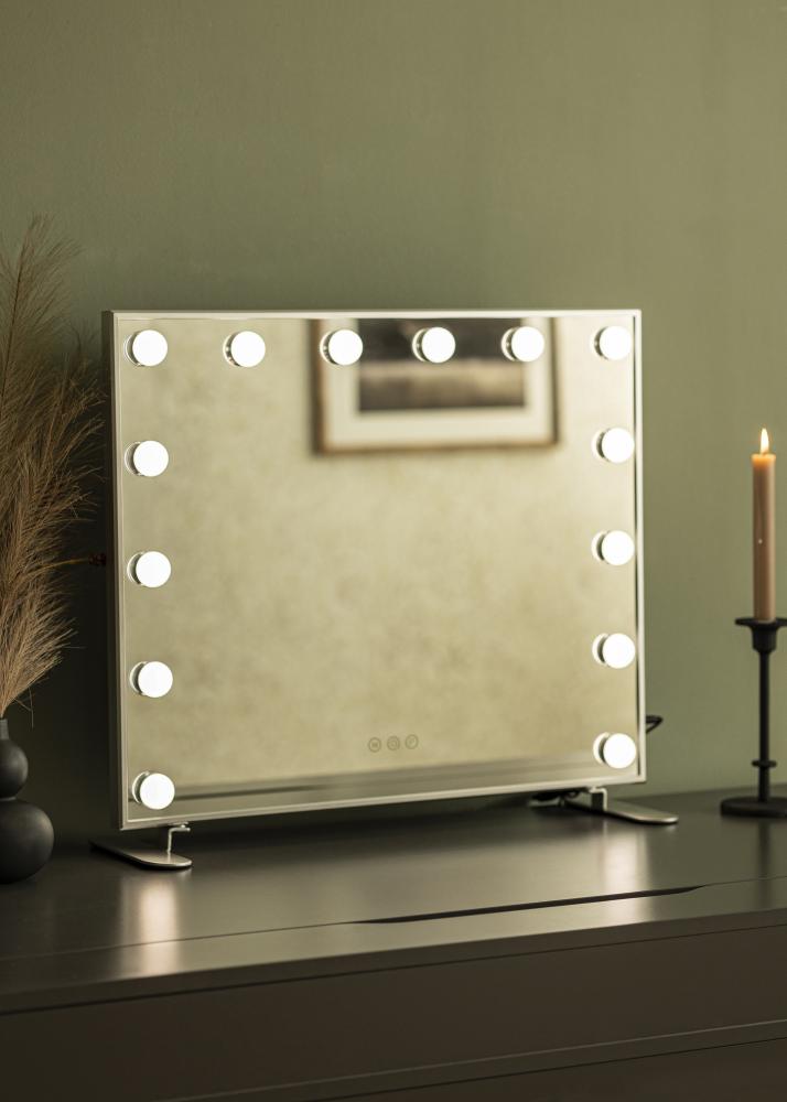 Ez egy stílusos sminktükör, amely a lakás minden szobájának gyönyörű dekorációját képezheti. A 60x50 cm-es tükörfelületet körülölelő vékony ezüst keret nagyon letisztult megjelenést kölcsönöz, miközben a tükör szélein elhelyezett 14 lekerekített LED-lámpa exkluzív érzést ad. A tükör egyik oldalán található egy USB-port, amely lehetővé teszi az okoseszközeid töltését USB-kapcsolaton keresztül.