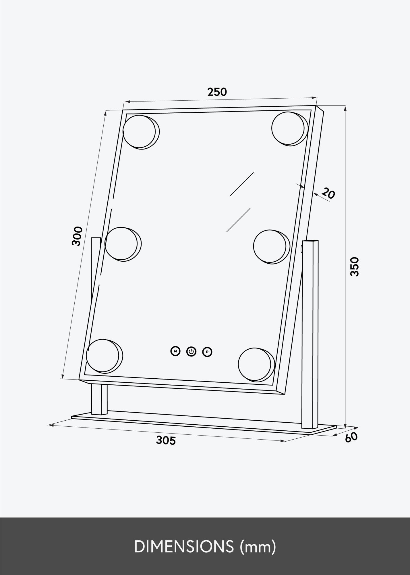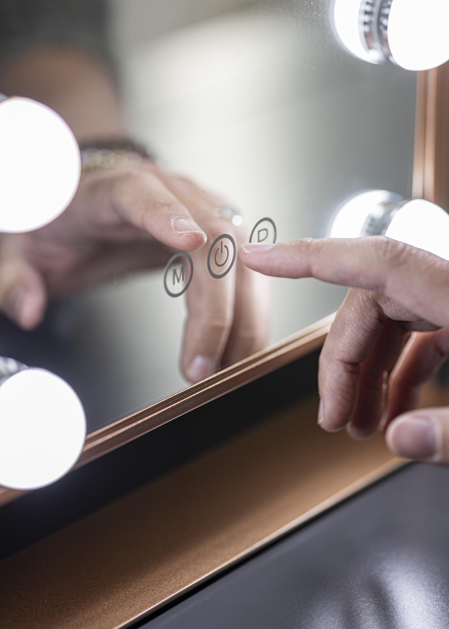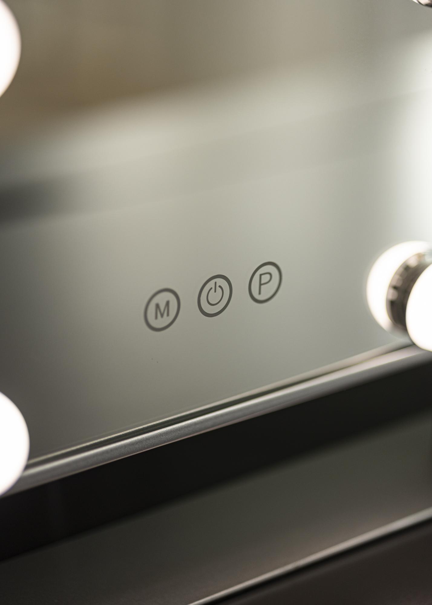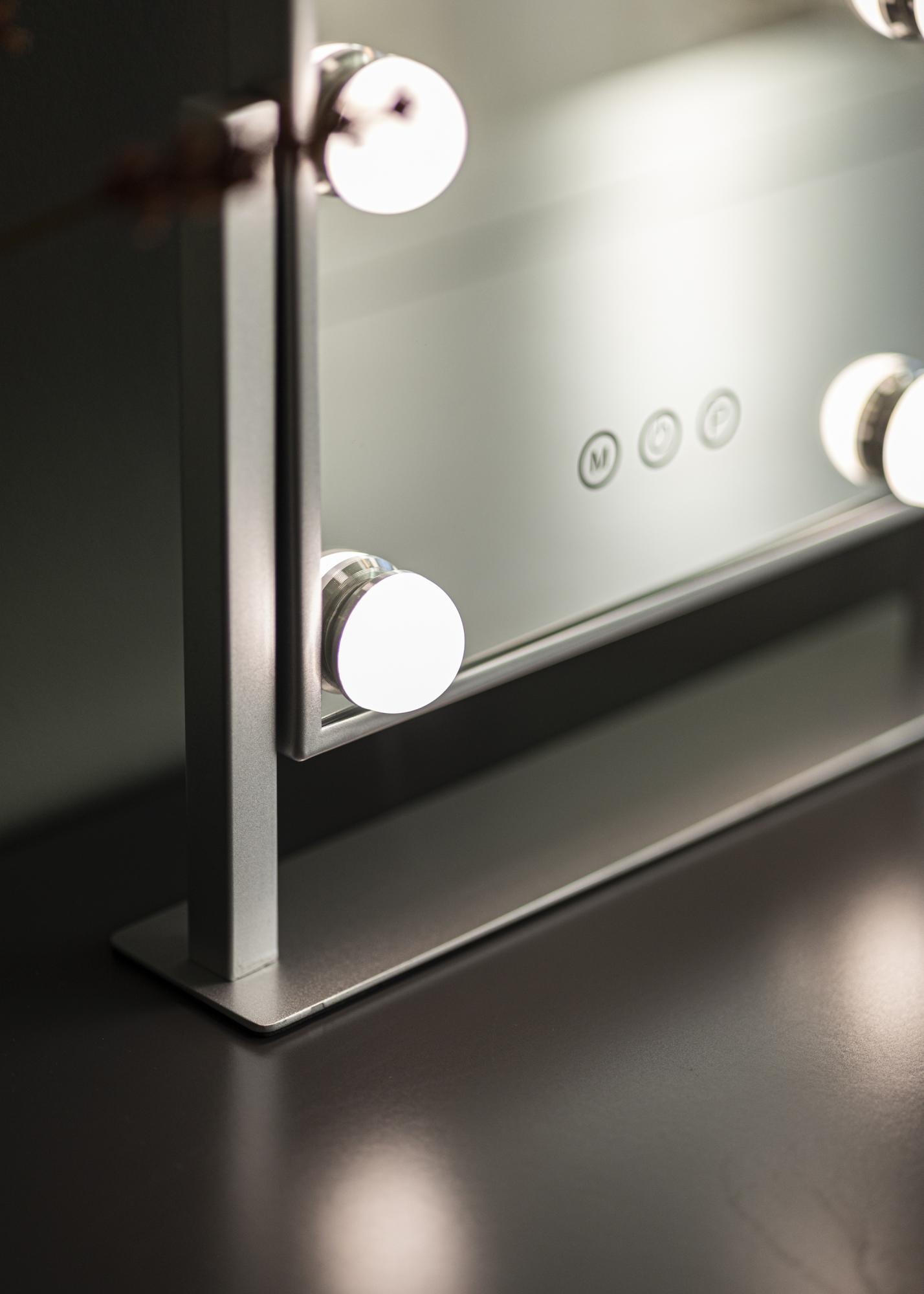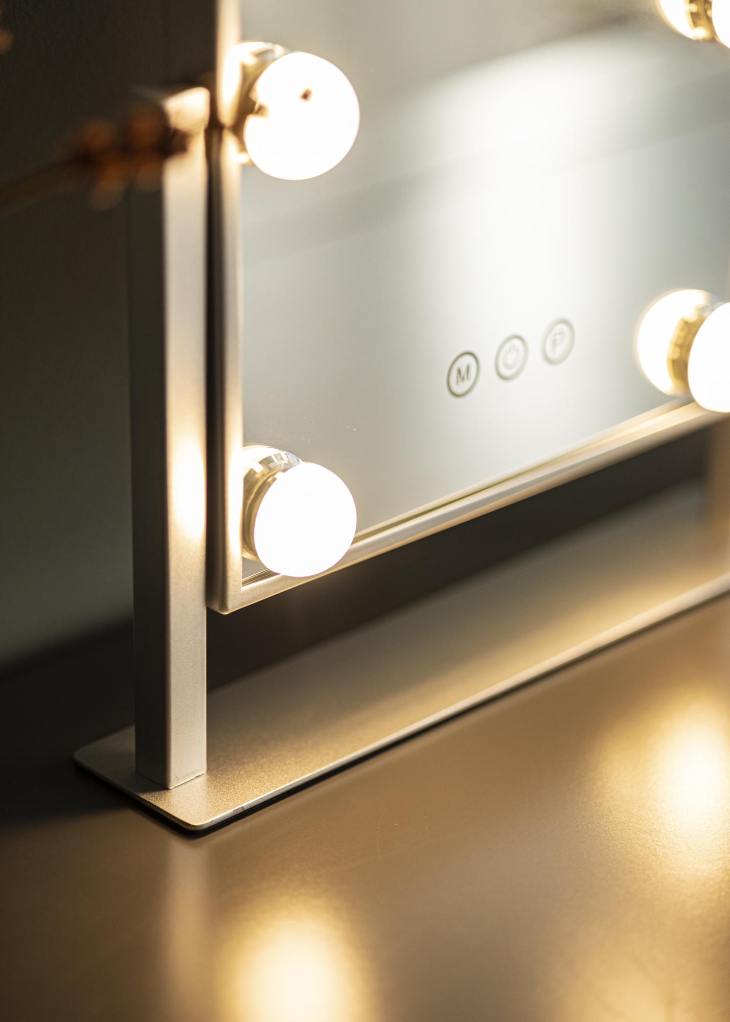 Ez a sminktükör a KAILA-tól stílust és csillogást ad otthonának! A kis méretnek köszönhetően jól illik a hálószobába vagy a nappaliba is, attól függően, hol szeretné felvinni a sminkjét és felkészülni a napra. A tükör elegáns ezüst színű és 6 darab LED-lámpával van felszerelve, amelyek stílusosan keretezik a tükörfelületet. A tükör érintőgombokkal rendelkezik az előlapon, amelyekkel be lehet kapcsolni a lámpát és állítani a megvilágítást. Az "M" jelzett gomb a színhőmérsékletet állítja be, míg a "P" jelzett gomb a fényerőt szabályozza.