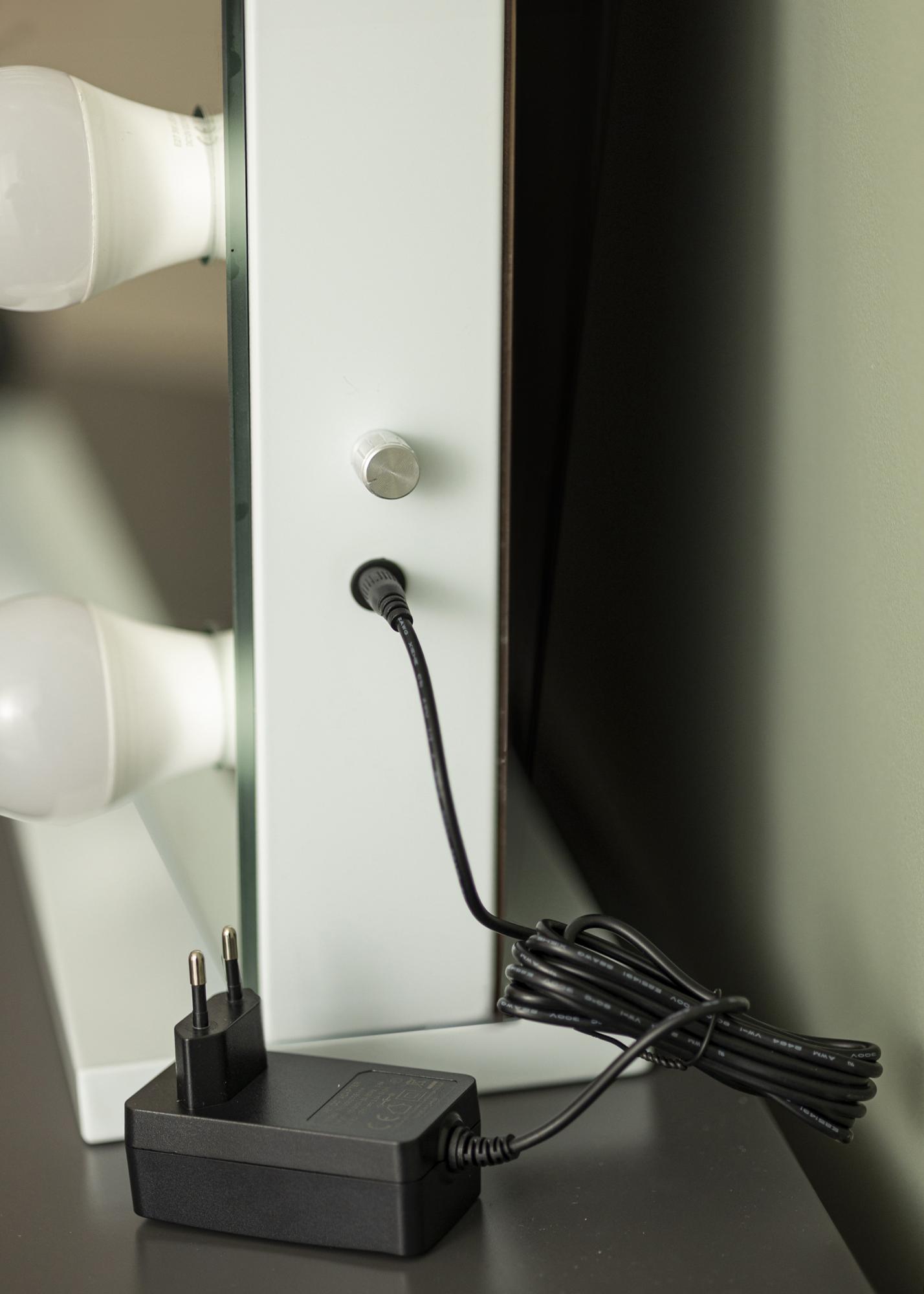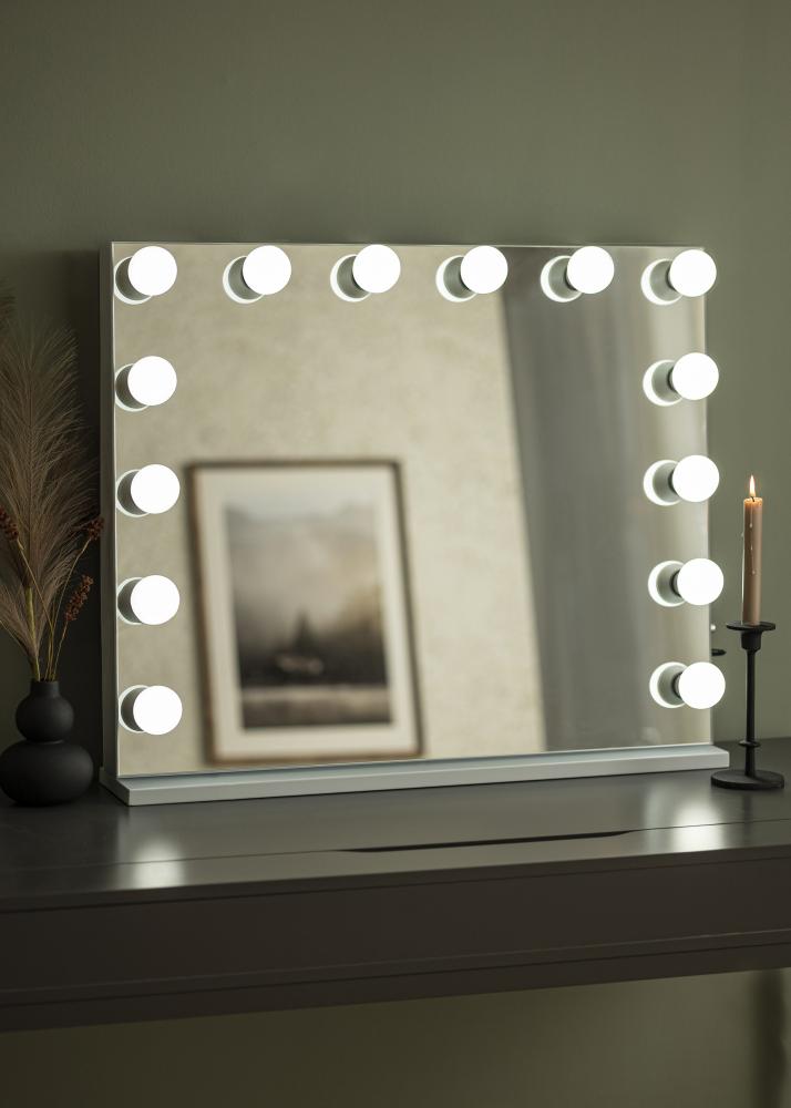 Ez egy egyedi sminktükör, amelynek dizájnja a hollywoodi sminkszobákat idézi. A nagy, 80x65 cm-es tükörfelületet 14 E27 foglalatú izzó keretezi. Az eredmény egyenletes, hideg fehér fény, amely ugyanolyan jól használható sminkeléshez, mint amikor egy divatos fényforrást szeretne elhelyezni a nappali konzolasztalán. A világítás ráadásul dimmelhető, így még nagyobb rugalmasságot kínál. Egyszerűen csak forgassa el a tükrön található szabályzót az egyik oldalon, és állítsa be a fényt az igényei szerint.