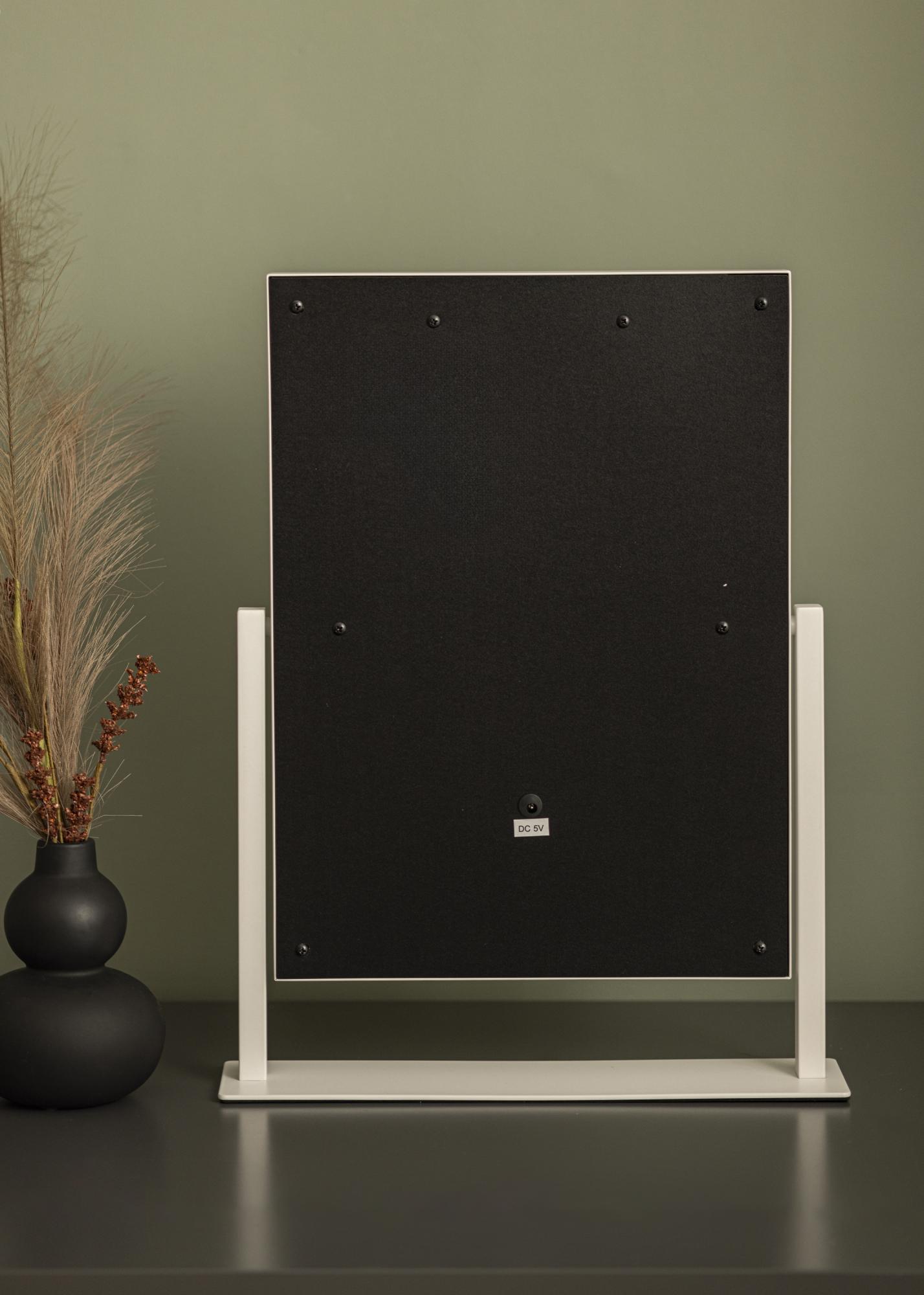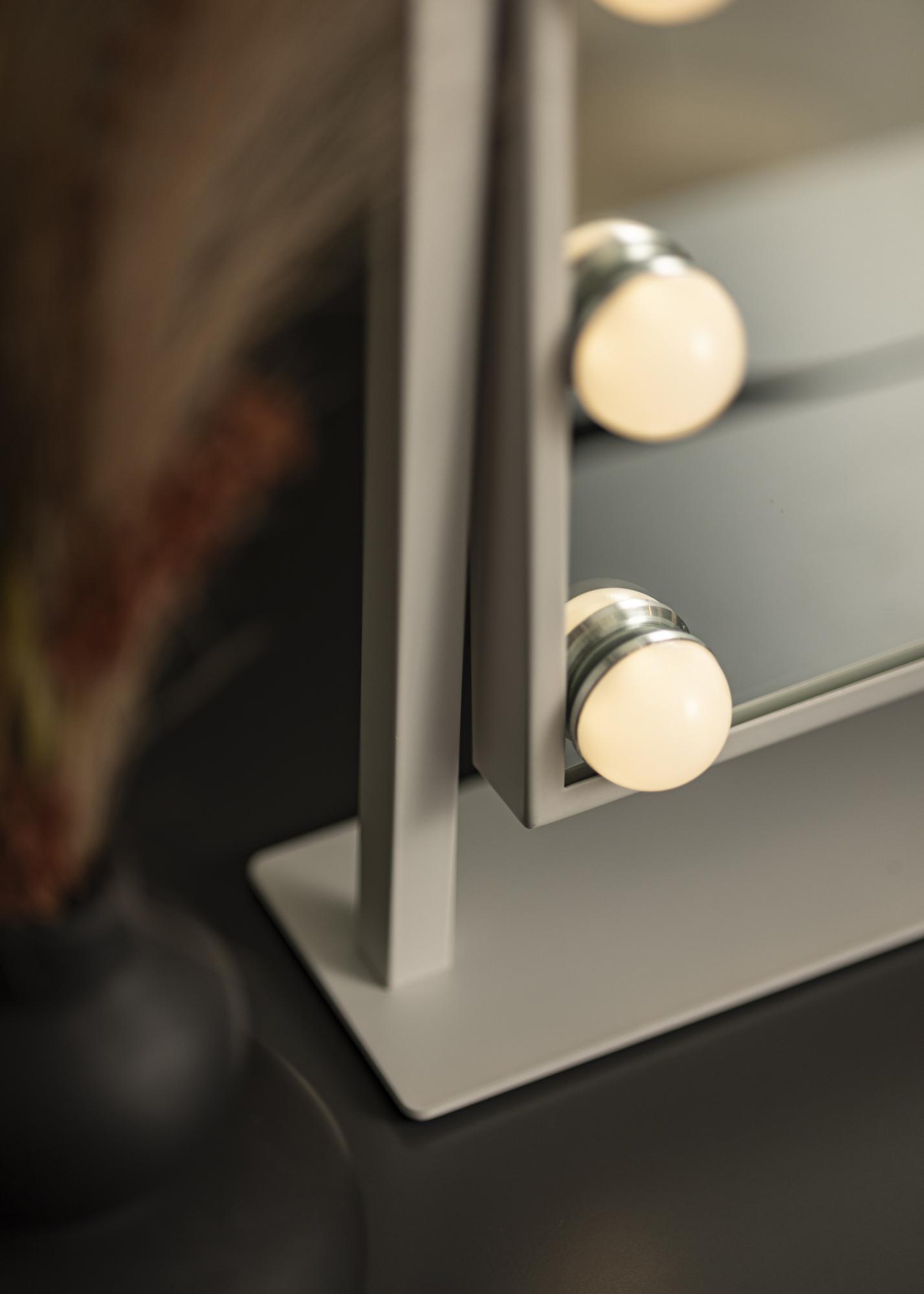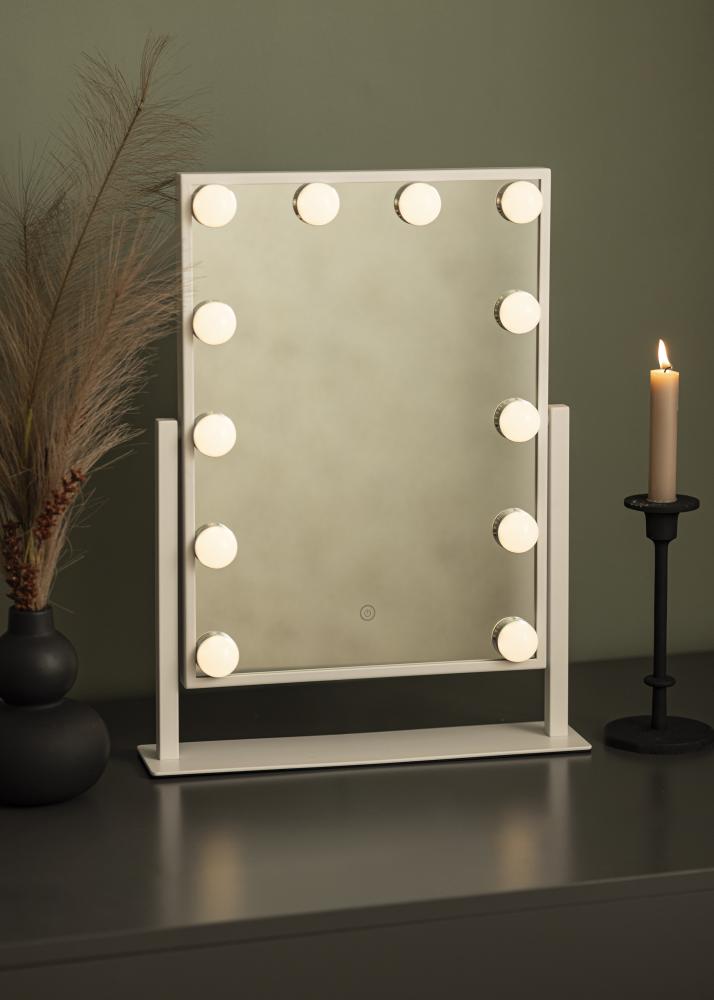 Ez egy luxus kivitelű sminktükör 12 dekoratív LED-izzóval elegáns fehér árnyalatban. Az izzók stílusosan keretezik a bőséges tükörfelületet, amelynek mérete 30x40 cm, és meleg fehér fényt adnak 3000K-ben. A világítás a képernyőn található érintőgomb megnyomásával kapcsolható be, és rendelkezik egy elhalványítható funkcióval, amelyet könnyen beállíthat a gomb néhány másodpercig történő nyomva tartásával. A tükröt függőlegesen lehet dönteni, így könnyedén sminkelhet abból a szögből, amely a legjobban megfelel Önnek. A sok funkciója mellett ez a sminktükör elegáns részletként is szolgál, és valódi hollywoodi érzetet varázsol az otthonába!