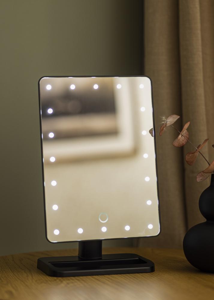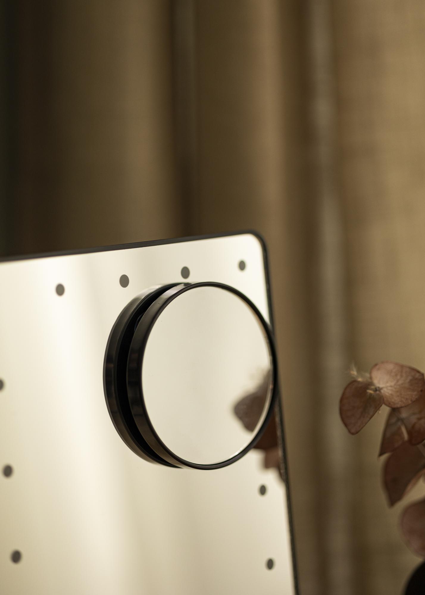 A tükör okos kialakítással rendelkezik, fényerő-szabályozható LED-világítással, amely hideg fehér fényt biztosít. A világítást a hátlapon található gombbal kapcsolhatod be és ki. Az alapos tükrözés érdekében ez a sminktükör elfordítható és dönthető, így a tükörfelület pozícióját kívánságod szerint állíthatod be. Egy kisebb tükör is van hozzá, 2x és 3x nagyítással, amelyet könnyedén rögzíthetsz a főtükör üvegére. A tükör beépített lítium-ion akkumulátorral rendelkezik, amely USB-kapcsolaton keresztül tölthető. A töltéshez szükséges kábel a csomag része.