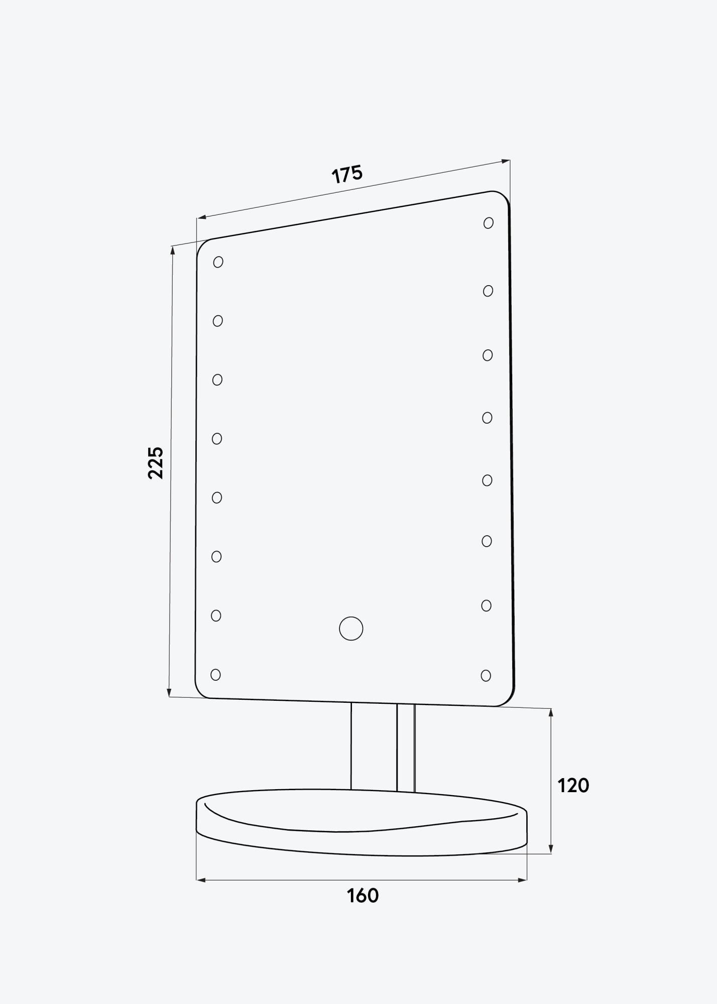 Ez egy stílusos sminktükör, amely tökéletes otthoni és utazás közbeni használatra egyaránt. Nagyon hordozható, könnyű kompozit anyagból készült, kisebb méretű, a tükröző felület pedig 17,5x22,5 cm. A tükör dönthető és vízszintes helyzetbe forgatható.