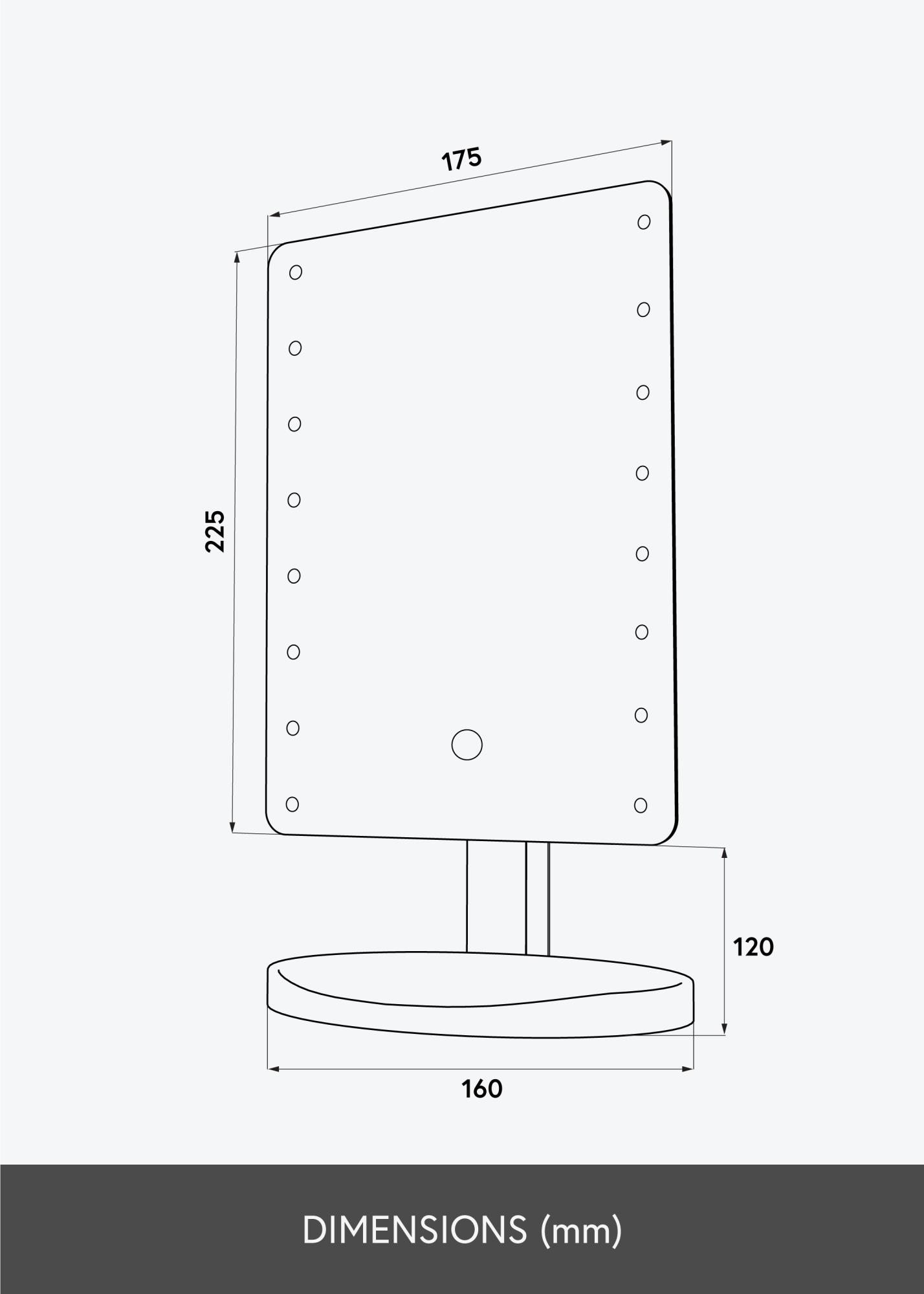 A sminktükör okos kialakítású, amely lehetővé teszi a tükröző felület forgatását és döntését. A tükröt 4 AA elemmel működik (nem tartozék).
