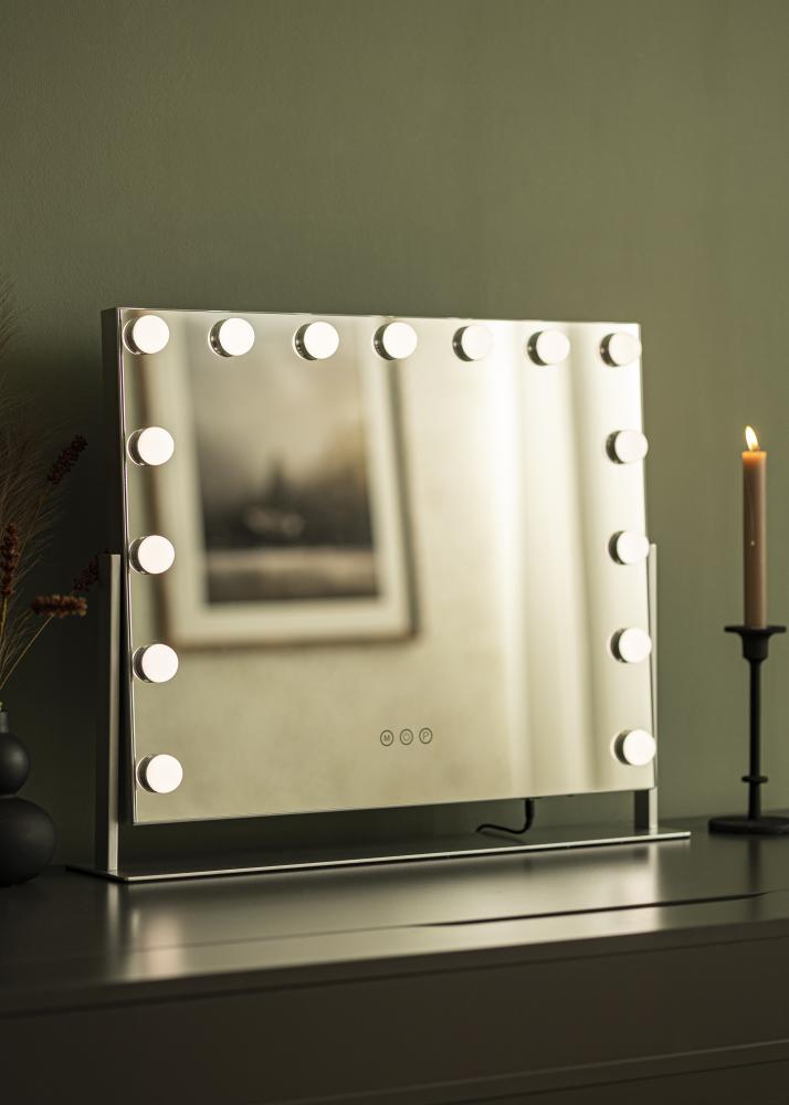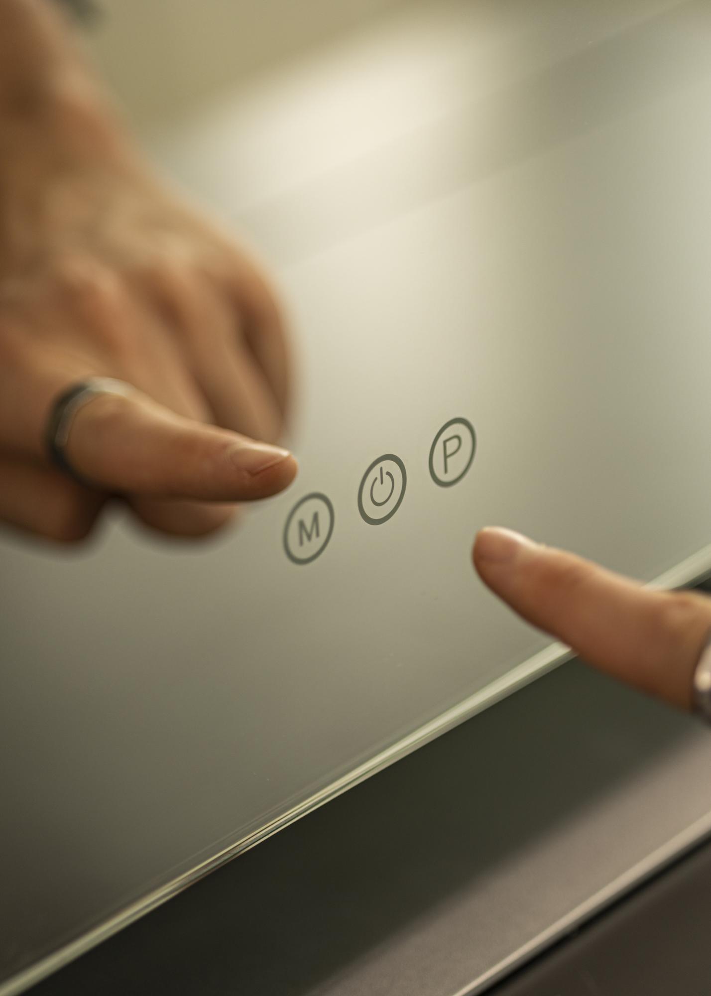 Egy elegáns sminktükörrel luxusabb légkört teremthetsz bármelyik szobában. Ez a tükör beépített LED-világítással rendelkezik, amelyet a hangulatod szerint állíthatsz be, legyen szó egy kellemes háttérvilágításról a nappaliban vagy erős fényről a sminksarokban. A világítás beállításához használd a tükör alsó szélén található érintőgombokat; az "M" gomb a fény színhőmérsékletét, míg a "P" gomb a fényerőt állítja. Ezen kívül van egy ki-/bekapcsoló gomb is a tükör világításának be- és kikapcsolásához. Az áramellátás hálózati csatlakozóval történik.