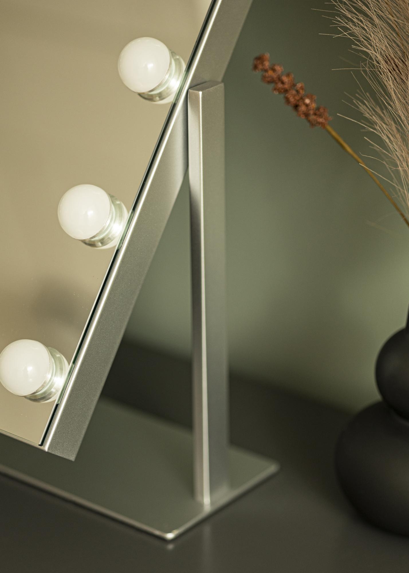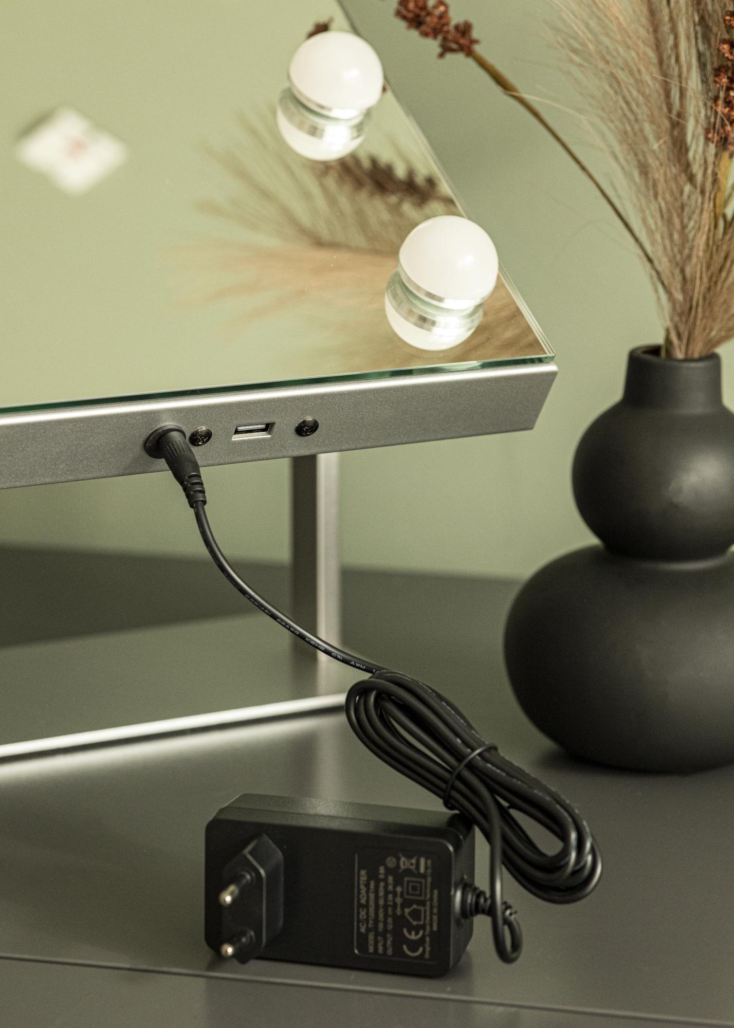 A tükörnek ezüstszínű talpa van, amely nemcsak elegáns megjelenést kölcsönöz, hanem lehetővé teszi a tükörfelület megdöntését is. A tükör alsó szélén található egy USB-port az okoseszközeid töltésére.
